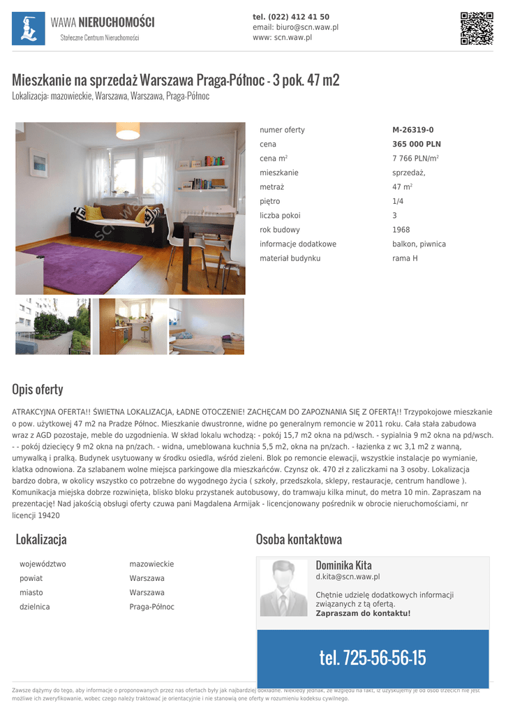 tel. (022) 412 41 50 email: [email protected] www: scn.waw.pl Mieszkanie na sprzedaż Warszawa Praga-Północ - 3 pok. 47 m2 Lokalizacja: mazowieckie, Warszawa, Warszawa, Praga-Północ numer oferty M-26319-0 cena 365 000 PLN cena m 7 766 PLN/m2 mieszkanie sprzedaż, metraż 47 m2 piętro 1/4 liczba pokoi 3 rok budowy 1968 informacje dodatkowe balkon, piwnica materiał budynku rama H 2 Opis oferty ATRAKCYJNA OFERTA!! ŚWIETNA LOKALIZACJA, ŁADNE OTOCZENIE! ZACHĘCAM DO ZAPOZNANIA SIĘ Z OFERTĄ!! Trzypokojowe mieszkanie o pow. użytkowej 47 m2 na Pradze Północ. Mieszkanie dwustronne, widne po generalnym remoncie w 2011 roku. Cała stała zabudowa wraz z AGD pozostaje, meble do uzgodnienia. W skład lokalu wchodzą: - pokój 15,7 m2 okna na pd/wsch. - sypialnia 9 m2 okna na pd/wsch. - - pokój dziecięcy 9 m2 okna na pn/zach. - widna, umeblowana kuchnia 5,5 m2, okna na pn/zach. - łazienka z wc 3,1 m2 z wanną, umywalką i pralką. Budynek usytuowany w środku osiedla, wśród zieleni. Blok po remoncie elewacji, wszystkie instalacje po wymianie, klatka odnowiona. Za szlabanem wolne miejsca parkingowe dla mieszkańców. Czynsz ok. 470 zł z zaliczkami na 3 osoby. Lokalizacja bardzo dobra, w okolicy wszystko co potrzebne do wygodnego życia ( szkoły, przedszkola, sklepy, restauracje, centrum handlowe ). Komunikacja miejska dobrze rozwinięta, blisko bloku przystanek autobusowy, do tramwaju kilka minut, do metra 10 min. Zapraszam na prezentację! Nad jakością obsługi oferty czuwa pani Magdalena Armijak - licencjonowany pośrednik w obrocie nieruchomościami, nr licencji 19420 Lokalizacja Osoba kontaktowa Dominika Kita województwo mazowieckie powiat Warszawa [email protected] miasto Warszawa dzielnica Praga-Północ Chętnie udzielę dodatkowych informacji związanych z tą ofertą. Zapraszam do kontaktu! tel. 725-56-56-15 Zawsze dążymy do tego, aby informacje o proponowanych przez nas ofertach były jak najbardziej dokładne. Niekiedy jednak, ze względu na fakt, iż uzyskujemy je od osób trzecich nie jest możliwe ich zweryfikowanie, wobec czego należy traktować je orientacyjnie i nie stanowią one oferty w rozumieniu kodeksu cywilnego.