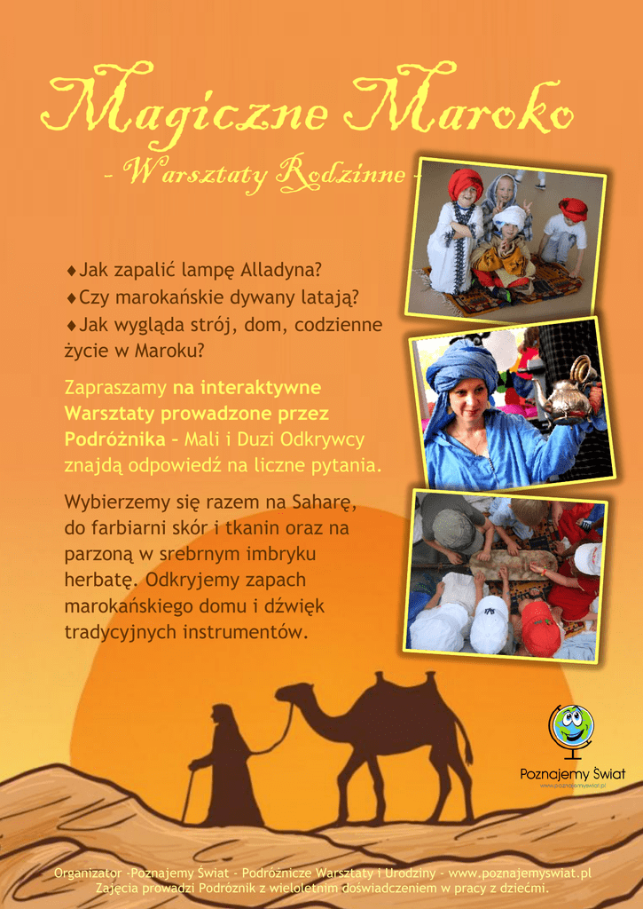 Magiczne Maroko - Warsztaty Rodzinne - Jak zapalić lampę Alladyna? Czy marokańskie dywany latają? Jak wygląda strój, dom, codzienne życie w Maroku? Zapraszamy na interaktywne Warsztaty prowadzone przez Podróżnika – Mali i Duzi Odkrywcy znajdą odpowiedź na liczne pytania. Wybierzemy się razem na Saharę, do farbiarni skór i tkanin oraz na parzoną w srebrnym imbryku herbatę. Odkryjemy zapach marokańskiego domu i dźwięk tradycyjnych instrumentów. Organizator -Poznajemy Świat - Podróżnicze Warsztaty i Urodziny - www.poznajemyswiat.pl Zajęcia prowadzi Podróznik z wieloletnim doświadczeniem w pracy z dziećmi.