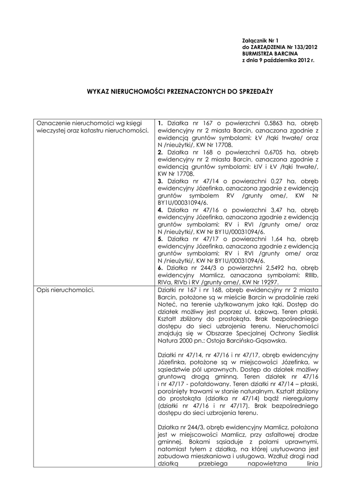 Załącznik Nr 1 do ZARZĄDZENIA Nr 133/2012 BURMISTRZA BARCINA z dnia 9 października 2012 r. WYKAZ NIERUCHOMOŚCI PRZEZNACZONYCH DO SPRZEDAŻY Oznaczenie nieruchomości wg księgi wieczystej oraz katastru nieruchomości. Opis nieruchomości. 1. Działka nr 167 o powierzchni 0,5863 ha, obręb ewidencyjny nr 2 miasta Barcin, oznaczona zgodnie z ewidencją gruntów symbolami: ŁV /łąki trwałe/ oraz N /nieużytki/, KW Nr 17708. 2. Działka nr 168 o powierzchni 0,6705 ha, obręb ewidencyjny nr 2 miasta Barcin, oznaczona zgodnie z ewidencją gruntów symbolami: ŁIV i ŁV /łąki trwałe/, KW Nr 17708. 3. Działka nr 47/14 o powierzchni 0,27 ha, obręb ewidencyjny Józefinka, oznaczona zgodnie z ewidencją gruntów symbolem RV /grunty orne/, KW Nr BY1U/00031094/6. 4. Działka nr 47/16 o powierzchni 3,47 ha, obręb ewidencyjny Józefinka, oznaczona zgodnie z ewidencją gruntów symbolami: RV i RVI /grunty orne/ oraz N /nieużytki/, KW Nr BY1U/00031094/6. 5. Działka nr 47/17 o powierzchni 1,64 ha, obręb ewidencyjny Józefinka, oznaczona zgodnie z ewidencją gruntów symbolami: RV i RVI /grunty orne/ oraz N /nieużytki/, KW Nr BY1U/00031094/6. 6. Działka nr 244/3 o powierzchni 2,5492 ha, obręb ewidencyjny Mamlicz, oznaczona symbolami: RIIIb, RIVa, RIVb i RV /grunty orne/, KW Nr 19297. Działki nr 167 i nr 168, obręb ewidencyjny nr 2 miasta Barcin, położone są w mieście Barcin w pradolinie rzeki Noteć, na terenie użytkowanym jako łąki. Dostęp do działek możliwy jest poprzez ul. Łąkową. Teren płaski. Kształt zbliżony do prostokąta. Brak bezpośredniego dostępu do sieci uzbrojenia terenu. Nieruchomości znajdują się w Obszarze Specjalnej Ochrony Siedlisk Natura 2000 pn.: Ostoja Barcińsko-Gąsawska. Działki nr 47/14, nr 47/16 i nr 47/17, obręb ewidencyjny Józefinka, położone są w miejscowości Józefinka, w sąsiedztwie pól uprawnych. Dostęp do działek możliwy gruntową drogą gminną. Teren działek nr 47/16 i nr 47/17 - pofałdowany. Teren działki nr 47/14 – płaski, porośnięty trawami w stanie naturalnym. Kształt zbliżony do prostokąta (działka nr 47/14) bądź nieregularny (działki nr 47/16 i nr 47/17). Brak bezpośredniego dostępu do sieci uzbrojenia terenu. Działka nr 244/3, obręb ewidencyjny Mamlicz, położona jest w miejscowości Mamlicz, przy asfaltowej drodze gminnej. Bokami sąsiaduje z polami uprawnymi, natomiast tyłem z działką, na której usytuowana jest zabudowa mieszkaniowa i usługowa. Wzdłuż drogi nad działką przebiega napowietrzna linia Przeznaczenie nieruchomości i sposób jej zagospodarowania. elektroenergetyczna niskiego napięcia. Po przeciwnej stronie drogi znajduje się sieć wodociągowa. Teren płaski. Kształt prostokątny. Zgodnie ze studium uwarunkowań i kierunków zagospodarowania przestrzennego miasta Barcin (uchwała Nr XIX/121/2000 Rady Miejskiej w Barcinie z dnia 29.02.2000 r.) działki nr 167 i nr 168, obręb ewidencyjny nr 2 miasta Barcin, znajdują się w obszarze jednostki strukturalnej oznaczonej symbolem C1 – dolina Noteci o jednorodnym charakterze: łąki, pastwiska, nieużytki, rowy i wody. Dla tej strefy przyjmuje się następujące ustalenia: - lokalny ciąg ekologiczny dla miasta, wskazane częściowe wykorzystanie pod zieleń urządzoną; - pełna ochrona terenów przed zainwestowaniem kubaturowym. Sposób zagospodarowania – łąka. Zgodnie ze studium uwarunkowań i kierunków zagospodarowania przestrzennego gminy Barcin (uchwała Nr XIX/121/2000 Rady Miejskiej w Barcinie z dnia 29.02.2000 r.) działki nr 47/14, nr 47/16 i nr 47/17, obręb ewidencyjny Józefinka, znajdują się w obszarze jednostki strukturalnej oznaczonej symbolem R4 – strefa rolnictwa niskoprodukcyjnego, w której zaleca się: - sukcesywną zmianę funkcji typowo rolniczej na wielofunkcyjność wsi polegającej na wprowadzaniu usług, rzemiosła lub innych form lokalnej przedsiębiorczości, która stanowić będzie uzupełniające źródło dochodu; - przygotowanie terenów ofertowych pod w/w formy zainwestowania. Sposób zagospodarowania – brak. Termin zagospodarowania nieruchomości. Cena nieruchomości bez doliczonego podatku VAT. Zgodnie ze studium uwarunkowań i kierunków zagospodarowania przestrzennego gminy Barcin (uchwała Nr XIX/121/2000 Rady Miejskiej w Barcinie z dnia 29.02.2000 r.) działka nr 244/3, obręb ewidencyjny Mamlicz, znajduje się w obszarze jednostki strukturalnej oznaczonej symbolem R1 – strefa rolnictwa średnioprodukcyjnego, dla którego ustala się: - ochronę dobrych kompleksów glebowych przed nieuzasadnionym przeznaczeniem pod inwestycje; - eliminowanie do minimum lokalizacji nowych siedlisk rolniczych w otwartych terenach produkcyjnych, ze wskazaniem na ich sytuowanie w obszarach zabudowy wiejskiej; - wskazanie ukierunkowania rolnictwa na produkcje dla potrzeb Barcina i innych sąsiednich miast (warzywnictwo pod osłonami, uprawy nasienne, szkółkarstwo), - podjęcie prac melioracyjnych regulujących stosunki wodne. Sposób zagospodarowania – grunty orne. --1. 6 650,00 zł. 2. 7 600,00 zł. 3. 5 100,00 zł. 4. 65 900,00 zł. Wysokość stawek procentowych opłat z tytułu użytkowania wieczystego. Wysokość opłat z tytułu użytkowania wieczystego, najmu lub dzierżawy. Terminy wnoszenia opłat. Zasady aktualizacji opłat. Informacje o przeznaczeniu do sprzedaży, do oddania w użytkowanie wieczyste, użytkowanie, najem lub dzierżawę. Termin do złożenia wniosku przez osoby, którym przysługuje pierwszeństwo w nabyciu nieruchomości na podstawie art. 34. ust. 1 pkt 1 i pkt 2 ustawy o gospodarce nieruchomościami. 5. 31 150,00 zł. 6. 71 000,00 zł. --------Sprzedaż w drodze przetargu. 6 tygodni, licząc od dnia wywieszenia wykazu.