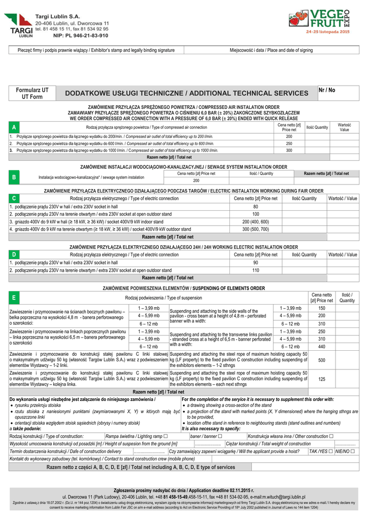 Pieczęć firmy i podpis prawnie wiążący / Exhibitor’s stamp and legally binding signature Formularz UT UT Form Miejscowość i data / Place and date of signing Nr / No DODATKOWE USŁUGI TECHNICZNE / ADDITIONAL TECHNICAL SERVICES ZAMÓWIENIE PRZYŁĄCZA SPRĘŻONEGO POWIETRZA / COMPRESSED AIR INSTALATION ORDER ZAMAWIAMY PRZYŁĄCZE SPRĘŻONEGO POWIETRZA O CIŚNIENIU 6,0 BAR (± 20%) ZAKOŃCZONE SZYBKOZŁĄCZEM WE ORDER COMPRESSED AIR CONNECTION WITH A PRESSURE OF 6,0 BAR (± 20%) ENDED WITH QUICK RELEASE A Cena netto [zł] Price net Rodzaj przyłącza sprężonego powietrza / Type of compressed air connection 1. Przyłącze sprężonego powietrza dla łącznego wydatku do 200l/min. / Compressed air outlet of total efficiency up to 200 l/min. 200 2. Przyłącze sprężonego powietrza dla łącznego wydatku do 600 l/min. / Compressed air outlet of total efficiency up to 600 l/min. 250 3. Przyłącze sprężonego powietrza dla łącznego wydatku do 1000 l/min. / Compressed air outlet of total efficiency up to 1000 l/min. 300 Wartość Value Ilość Quantity Razem netto [zł] / Total net ZAMÓWIENIE INSTALACJI WODOCIĄGOWO-KANALIZACYJNEJ / SEWAGE SYSTEM INSTALATION ORDER B C Cena netto [zł] Price net Instalacja wodociągowo-kanalizacyjna* / sewage system instalation Ilość / Quantity Razem netto [zł] / Total net 200 ZAMÓWIENIE PRZYŁĄCZA ELEKTRYCZNEGO DZIAŁAJĄCEGO PODCZAS TARGÓW / ELECTRIC INSTALATION WORKING DURING FAIR ORDER Rodzaj przyłącza elektrycznego / Type of electric connection Cena netto [zł] Price net Ilość Quantity 1. podłączenie prądu 230V w hali / extra 230V socket in hall Wartość / Value 80 2. podłączenie prądu 230V na terenie otwartym / extra 230V socket at open outdoor stand 100 3. gniazdo 400V do 9 kW w hali (≥ 18 kW, ≥ 36 kW) / socket 400V/9 kW indoor stand 200 (400, 600) 4. gniazdo 400V do 9 kW na terenie otwartym (≥ 18 kW, ≥ 36 kW) / socket 400V/9 kW outdoor stand 300 (500, 700) Razem netto [zł] / Total net D ZAMÓWIENIE PRZYŁĄCZA ELEKTRYCZNEGO DZIAŁAJĄCEGO 24H / 24H WORKING ELECTRIC INSTALATION ORDER Rodzaj przyłącza elektrycznego / Type of electric connection Cena netto [zł] Price net Ilość Quantity 1. podłączenie prądu 230V w hali / extra 230V socket in hall 90 2. podłączenie prądu 230V na terenie otwartym / extra 230V socket at open outdoor stand 110 Wartość / Value Razem netto [zł] / Total net ZAMÓWIENIE PODWIESZENIA ELEMENTÓW / SUSPENDING OF ELEMENTS ORDER E Cena netto [zł] Price net Rodzaj podwieszenia / Type of suspension Zawieszenie i przymocowanie na ścianach bocznych pawilonu – belka poprzeczna na wysokości 4,8 m - banera perforowanego o szerokości: Zawieszenie i przymocowanie na linkach poprzecznych pawilonu – linka poprzeczna na wysokości 6,5 m – banera perforowanego o szerokości 1 – 3,99 mb 4 – 5,99 mb 6 – 12 mb 1 – 3,99 mb 4 – 5,99 mb 6 – 12 mb Suspending and attaching to the side walls of the pavilion - cross beam at a height of 4,8 m - perforated banner with a width: Suspending and attaching to the transverse links pavilion - stranded cross at a height of 6,5 m - banner perforated with a width: 1 – 3,99 mb 150 4 – 5,99 mb 200 6 – 12 mb 310 1 – 3,99 mb 250 4 – 5,99 mb 310 6 – 12 mb 440 Zawieszenie i przymocowanie do konstrukcji stałej pawilonu C linki stalowej Suspending and attaching the steel rope of maximum hoisting capacity 50 o maksymalnym udźwigu 50 kg (własność Targów Lublin S.A.) wraz z podwieszeniem kg (LF property) to the fixed pavilion C construction including suspending of elementów Wystawcy – 1-2 linki. the exhibitors elements – 1-2 sthngs 500 Zawieszenie i przymocowanie do konstrukcji stałej pawilonu C linki stalowej Suspending and attaching the steel rope of maximum hoisting capacity 50 o maksymalnym udźwigu 50 kg (własność Targów Lublin S.A.) wraz z podwieszeniem kg (LF property) to the fixed pavilion C construction including suspending of elementów Wystawcy – kolejna linka. the exhibitors elements – each next sthngs 125 Ilość / Quantity Razem netto [zł] / Total net Do wykonania usługi niezbędne jest załączenie do niniejszego zamówienia / For the completion of the seryice it is necessary to supplement this order with: rysunku przekroju stoiska a drawing showing a cross-section of the stand rzutu stoiska z naniesionymi punktami (zwymiarowanymi X, Y) w których mają być a projection of the stand with marked points (X, Y dimensioned) where the hanging sthngs are opuszczone linki to be provided, orientacji stoiska względem stoisk sąsiednich (obrysy i numery stoisk) location ofthe stand in reference to neighbouring stands (stand outlines and numbers) a także podanie: It is also necessary to specify: Rodzaj konstrukcji / Type of construction: Rampa świetlna / Lighting ramp baner / banner Wysokość umocowania konstrukcji od posadzki [m] / Height of suspesion from the ground [m] Termin dostarczenia konstrukcji / Dafe of construction delivery ………………. Konstrukcja własna inna / Other construction Ciężar konstrukcji / Total weight of construction ………………….. Czy zamawiający zapewni wciągarkę / Will the applicant provide a hoist? …………… TAK /YES NIE/NO Kontakt do wykonawcy zabudowy (tel. komórkowy) / Contact to stand construction crew (mobile phone) Razem netto z części A, B, C, D, E [zł] / Total net including A, B, C, D, E type of services Zgłoszenia prosimy nadsyłać do dnia / Application deadline 02.11.2015 r. ul. Dworcowa 11 (Park Ludowy), 20-406 Lublin, tel. +48 81 458-15-49,458-15-11, fax +48 81 534-92-95, e-mail:[email protected] Zgodnie z ustawą z dnia 18.07.2002 r. (Dz.U. nr 144 poz.1204) o świadczeniu usług drogą elektroniczną, wyrażam zgodę na otrzymywanie informacji marketingowych od firmy Targi Lublin S.A. drogą elektroniczną na ww adres e-mail./ I hereby declare my consent to receive marketing information from Lublin Fair JSC on a/m e-mail address (according 