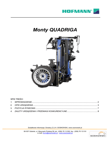 Monty QUADRIGA SPIS TREŚCI 1. WPROWADZENIE.................................................................................................................. 2 2. OPIS URZĄDZENIA ............................................................................................................... 3 3. POZYCJA RYNKOWA ........................................................................................................... 7 4. ZALETY URZĄDZENIA I PRZEWAGI KONKURENCYJNE..................................................... 8 Dodatkowe informacje: Doradcy Z.U.H. SOSNOWSKI, www.sosnowski.pl 80-557 Gdańsk, ul. Marynarki Polskiej 59; tel.: (058) 76 13 500, fax.: (058) 76 13 510 e-mail: [email protected] , www.sosnowski.pl 1. WPROWADZENIE Urządzenie niemieckiej firmy Hofmann Monty QUADRIGA to w pełni automatyczne urządzenie do montaŜu i demontaŜu opon. Zaprojektowane z myślą o serwisach, które potrzebują urządzenia o wyjątkowych moŜliwościach pozwalających na obsługę wszystkich rodzajów kół współczesnych samochodów. Dzięki zastosowaniu zaawansowanej technologii urządzenie zapewnia komfortową i bezpieczną obsługę opon niskoprofilowych, run-flat oraz UHP. QUADRIGA to urządzenie, które wyznacza nowe standardy w segmencie wyŜszej klasy. Dzięki zautomatyzowaniu procesu, operator jest w stanie obsłuŜyć koła o średnicy felgi do 30” i maksymalnej średnicy koła 47” w bardzo krótkim czasie. Całkowity proces demontaŜu i montaŜu opony przeprowadzany jest w trybie automatycznym, począwszy od zamontowania koła na wrzecionie montaŜownicy poprzez odbicie, demontaŜ i montaŜ opony. Podnośnik przenosi koło na uchwyt, gdzie jest ono mocowane. Czujniki laserowe rozpoznają wymiary geometryczne koła, aby ustawić względem niego uchwyt, rolki do odbijania stopki opony i głowicę montaŜową. Kiedy koło zostanie hydraulicznie zamocowane, operator wybiera jeden z pięciu programów działania. Automatyczny demontaŜ i montaŜ rozpoczynany jest za pomocą joysticka, a operator nigdy nie traci kontroli nad działaniem maszyny. Inteligentny sterownik zapewnia, Ŝe w czasie kaŜdego z etapów odpowiednie siły przykładane są do opony, co zabezpiecza zarówno felgę jak i oponę przed uszkodzeniem. MontaŜownica QUADRIGA została zaprojektowana tak, aby odciąŜyć operatora i zminimalizować źródła błędów dzięki zautomatyzowaniu procedur. Bardzo wysoka jakość urządzenia, ergonomiczna konstrukcja, łatwość i szybkość obsługi oraz uniwersalne zastosowanie czyni montaŜownicę QUADRIGA urządzeniem idealnym dla serwisów o wysokiej ilości obsługiwanych pojazdów. Monty QUADRIGA jest pierwszym na świecie w pełni automatycznym urządzeniem do montaŜu i demontaŜu opon, które otrzymało certyfikat niemieckiego stowarzyszenia WDK. Dodatkowe informacje: Doradcy Z.U.H. SOSNOWSKI, www.sosnowski.pl 80-557 Gdańsk, ul. Marynarki Polskiej 59; tel.: (058) 76 13 500, fax.: (058) 76 13 510 e-mail: [email protected] , www.sosnowski.pl 2. OPIS URZĄDZENIA Obsługa urządzenia jest bardzo prosta. Brak kontaktu narzędzi z felgą koła podczas pracy urządzenia eliminuje zagroŜenie uszkodzenia drogich kół. „Zarabianie pieniędzy poprzez ich oszczędzanie” dzięki przemyślanej konstrukcji urządzenia i zasadzie jego działania. Specjalne narzędzie do demontaŜu oraz laser pomiarowy precyzyjnie odczytujący parametry geometryczne obręczy koła sprawiają, iŜ urządzenie QUADRIGA zdecydowanie wyróŜnia się pośród dotąd oferowanych na rynku urządzeń do montaŜu i demontaŜu opon. Podnośnik kół w standardzie to dodatkowe bezpieczeństwo pracy oraz oszczędność kosztów. Monty QUADRIGA zostało zaprojektowane z myślą, aby wyeliminować problemy, pojawiające się w standardowych urządzeniach do montaŜu i demontaŜu opon, takich jak: • Ryzyko uszkodzenia lub zarysowania kół podczas ich podnoszenia i pozycjonowania • Ryzyko uszkodzenia lub zarysowania kół podczas ich montaŜu na urządzeniu • Konieczność zaangaŜowania kilku osób przy montaŜu kół na urządzeniach ze stołem obrotowym • Ryzyko zniszczenia opon podczas ich odparzania osobno z kaŜdej strony przy uŜyciu metalowego odbijacza • Konieczność uŜycia siły przez operatora podczas odparzania opony osobno z kaŜdej strony przy uŜyciu metalowego odbijacza • Ryzyko uszkodzenia felgi podczas jej kontaktu z głowicą urządzenia • Ryzyko uszkodzenia przy podniesieniu krawędzi opony ponad głowicę urządzenia • Niedostateczny strumień powietrza z inflatora na stole obrotowym urządzenia– nieefektywne z powodu opon o twardych ściankach bocznych, głównie opon EMT (Extended Mobility Tyres) i run-flat Dzięki urządzeniu QUADRIGA moŜemy wyeliminować wyŜej przedstawione problemy. • Podnośnik kół w standardzie Podnosi/ opuszcza koło na uchwyt i jednocześnie ustawia średnicę koła • Mocny centralny zacisk ze specjalną szybkozłączką mocującą Redukuje ryzyko uszkodzenia koła. Siła zacisku kierowana jest na najmocniejszy punkt felgi. Szybkozłączka mocująca zapewnia mocne i pewne mocowanie koła. • Obrotowe rolki odbijające Sterowane za pomocą joysticka specjalnie zaprojektowane rolki odbijające skutecznie odbijają jednocześnie obie strony opony. Rolki podczas pracy zmieniają swój kąt nachylenia, aby zapewnić optymalne siły przykładane do opony, co zabezpiecza zarówno felgę jak i oponę przed uszkodzeniem. Dodatkowe informacje: Doradcy Z.U.H. SOSNOWSKI, www.sosnowski.pl 80-557 Gdańsk, ul. Marynarki Polskiej 59; tel.: (058) 76 13 500, fax.: (058) 76 13 510 e-mail: [email protected] , www.sosnowski.pl • NajwyŜszej jakości czujniki laserowe Czujniki pomagają w ustawieniu głowicy montaŜowej w optymalnej pozycji podczas procedury montaŜu i demontaŜu kół, dzięki czemu eliminujemy ryzyko ich uszkodzenia. Po ustawieniu, głowica unosi ścianki opony bez manualnej interwencji. Dzięki takiej konstrukcji urządzenia nie ma pot