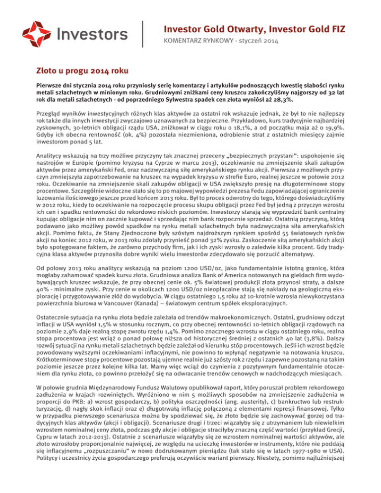 Investor Gold Otwarty, Investor Gold FIZ KOMENTARZ RYNKOWY - styczeń 2014 Złoto u progu 2014 roku Pierwsze dni stycznia 2014 roku przyniosły serię komentarzy i artykułów podnoszących kwestię słabości rynku metali szlachetnych w minionym roku. Grudniowymi zniżkami ceny kruszcu zakończyliśmy najgorszy od 32 lat rok dla metali szlachetnych - od poprzedniego Sylwestra spadek cen złota wyniósł aż 28,3%. Przegląd wyników inwestycyjnych różnych klas aktywów za ostatni rok wskazuje jednak, że był to nie najlepszy rok także dla innych inwestycji zwyczajowo uznawanych za bezpieczne. Przykładowo, kurs tradycyjnie najbardziej zyskownych, 30-letnich obligacji rządu USA, zniżkował w ciągu roku o 18,1%, a od początku maja aż o 19,9%. Gdyby ich obecna rentowność (ok. 4%) pozostała niezmieniona, odrobienie strat z ostatnich miesięcy zajmie inwestorom ponad 5 lat. Analitycy wskazują na trzy możliwe przyczyny tak znacznej przeceny „bezpiecznych przystani”: uspokojenie się nastrojów w Europie (pomimo kryzysu na Cyprze w marcu 2013), oczekiwanie na zmniejszenie skali zakupów aktywów przez amerykański Fed, oraz nadzwyczajną siłę amerykańskiego rynku akcji. Pierwsza z możliwych przyczyn zmniejszyła zapotrzebowanie na kruszec na wypadek kryzysu w strefie Euro, realnej jeszcze w połowie 2012 roku. Oczekiwanie na zmniejszenie skali zakupów obligacji w USA zwiększyło presję na długoterminowe stopy procentowe. Szczególnie widoczne stało się to po majowej wypowiedzi prezesa Fedu zapowiadającej ograniczenie luzowania ilościowego jeszcze przed końcem 2013 roku. Był to proces odwrotny do tego, którego doświadczyliśmy w 2012 roku, kiedy to oczekiwanie na rozpoczęcie procesu skupu obligacji przez Fed był jedną z przyczyn wzrostu ich cen i spadku rentowności do rekordowo niskich poziomów. Inwestorzy starają się wyprzedzić bank centralny kupując obligacje nim on zacznie kupować i sprzedając nim bank rozpocznie sprzedaż. Ostatnią przyczyną, którą podawano jako możliwy powód spadków na rynku metali szlachetnych była nadzwyczajna siła amerykańskich akcji. Pomimo faktu, że Stany Zjednoczone były szóstym najdroższym rynkiem spośród 55 światowych rynków akcji na koniec 2012 roku, w 2013 roku zdołały przynieść ponad 32% zysku. Zaskoczenie siłą amerykańskich akcji było spotęgowane faktem, że zarówno przychody firm, jak i ich zyski wzrosły o zaledwie kilka procent. Gdy tradycyjna klasa aktywów przynosiła dobre wyniki wielu inwestorów zdecydowało się porzucić alternatywy. Od połowy 2013 roku analitycy wskazują na poziom 1200 USD/oz, jako fundamentalnie istotną granicę, która mogłaby zahamować spadek kursu złota. Grudniowa analiza Bank of America notowanych na giełdach firm wydobywających kruszec wskazuje, że przy obecnej cenie ok. 5% światowej produkcji złota przynosi straty, a dalsze 40% - minimalne zyski. Przy cenie w okolicach 1200 USD/oz nieopłacalne stają się nakłady na geologiczną eksplorację i przygotowywanie złóż do wydobycia. W ciągu ostatniego 1,5 roku aż 10-krotnie wzrosła niewykorzystana powierzchnia biurowa w Vancouver (Kanada) – światowym centrum spółek eksploracyjnych. Ostatecznie sytuacja na rynku złota będzie zależała od trendów makroekonomicznych. Ostatni, grudniowy odczyt inflacji w USA wyniósł 1,5% w stosunku rocznym, co przy obecnej rentowności 10-letnich obligacji rządowych na poziomie 2,9% daje realną stopę zwrotu rzędu 1,4%. Pomimo znacznego wzrostu w ciągu ostatniego roku, realna stopa procentowa jest wciąż o ponad połowę niższa od historycznej średniej z ostatnich 40 lat (3,8%). Dalszy rozwój sytuacji na rynku metali szlachetnych będzie zależał od kierunku stóp procentowych. Jeśli ich wzrost będzie powodowany wyższymi oczekiwaniami inflacyjnymi, nie powinno to wpłynąć negatywnie na notowania kruszcu. Krótkoterminowe stopy procentowe pozostają ujemne realnie już szósty rok z rzędu i zapewne pozostaną na takim poziomie jeszcze przez kolejne kilka lat. Mamy więc wciąż do czynienia z pozytywnym fundamentalnie otoczeniem dla rynku złota, co powinno przełożyć się na odwracanie trendów cenowych w nadchodzących miesiącach. W połowie grudnia Międzynarodowy Fundusz Walutowy opublikował raport, który poruszał problem rekordowego zadłużenia w krajach rozwiniętych. Wyróżniono w nim 5 możliwych sposobów na zmniejszenie zadłużenia w proporcji do PKB: a) wzrost gospodarczy, b) polityka oszczędności (ang. austerity), c) bankructwo lub restrukturyzację, d) nagły skok inflacji oraz e) długotrwałą inflację połączoną z elementami represji finansowej. Tylko w przypadku pierwszego scenariusza można by spodziewać się, że złoto będzie się zachowywać gorzej od tradycyjnych klas aktywów (akcji i obligacji). Scenariusze drugi i trzeci wiązałyby się z utrzymaniem lub niewielkim wzrostem nominalnej ceny złota, podczas gdy akcje i obligacje straciłyby znaczną część wartości (przykład Grecji, Cypru w latach 2012-2013). Ostatnie 2 scenariusze wiązałyby się ze wzrostem nominalnej wartości aktywów, ale złoto wzrosłoby proporcjonalnie najwięcej, ze względu na ucieczkę inwestorów w instrumenty, które nie poddają się inflacyjnemu „rozpuszczaniu” w nowo dodrukowanym pieniądzu (tak stało się w latach 1977-1980 w USA). Politycy i uczestnicy życia gospodarczego preferują oczywiście wariant pierwszy. Niestety, pomimo najluźniejszej Investor Gold Otwarty, Investor Gold FIZ KOMENTARZ RYNKOWY - styczeń 2014 polityki monetarnej w historii, poziom rozwoju gospodarczego w krajach rozwiniętych w ostatnich 4 latach był tak niski, że rządowe zadłużenie w stosunku do PKB wzrosło zarówno w USA, strefie Euro jak i w Japonii. Autorzy raportu MFW stwierdzają wprost, że w przeszłości rozwiązanie problemu zadłużenia poprzez wzrost gospodarczy udawało się „stosunkowo rzadko”. Oczywiśc