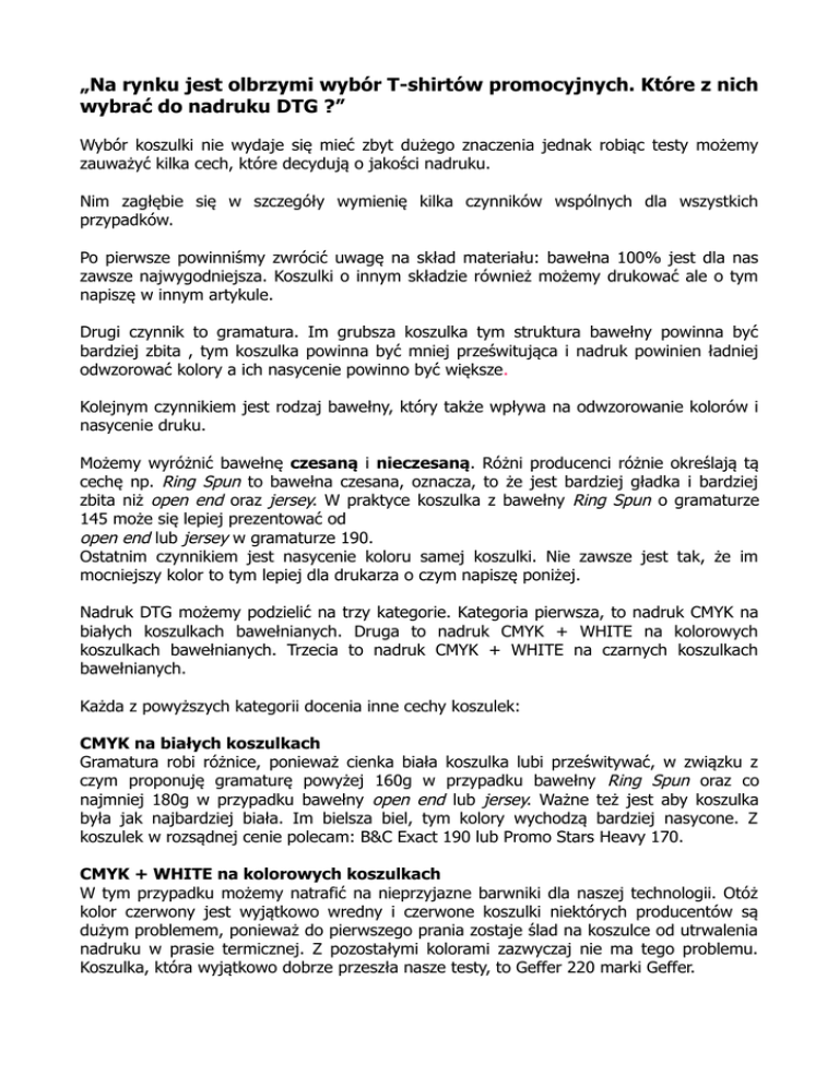 „Na rynku jest olbrzymi wybór T-shirtów promocyjnych. Które z nich wybrać do nadruku DTG ?” Wybór koszulki nie wydaje się mieć zbyt dużego znaczenia jednak robiąc testy możemy zauważyć kilka cech, które decydują o jakości nadruku. Nim zagłębie się w szczegóły wymienię kilka czynników wspólnych dla wszystkich przypadków. Po pierwsze powinniśmy zwrócić uwagę na skład materiału: bawełna 100% jest dla nas zawsze najwygodniejsza. Koszulki o innym składzie również możemy drukować ale o tym napiszę w innym artykule. Drugi czynnik to gramatura. Im grubsza koszulka tym struktura bawełny powinna być bardziej zbita , tym koszulka powinna być mniej prześwitująca i nadruk powinien ładniej odwzorować kolory a ich nasycenie powinno być większe. Kolejnym czynnikiem jest rodzaj bawełny, który także wpływa na odwzorowanie kolorów i nasycenie druku. Możemy wyróżnić bawełnę czesaną i nieczesaną. Różni producenci różnie określają tą cechę np. Ring Spun to bawełna czesana, oznacza, to że jest bardziej gładka i bardziej zbita niż open end oraz jersey. W praktyce koszulka z bawełny Ring Spun o gramaturze 145 może się lepiej prezentować od open end lub jersey w gramaturze 190. Ostatnim czynnikiem jest nasycenie koloru samej koszulki. Nie zawsze jest tak, że im mocniejszy kolor to tym lepiej dla drukarza o czym napiszę poniżej. Nadruk DTG możemy podzielić na trzy kategorie. Kategoria pierwsza, to nadruk CMYK na białych koszulkach bawełnianych. Druga to nadruk CMYK + WHITE na kolorowych koszulkach bawełnianych. Trzecia to nadruk CMYK + WHITE na czarnych koszulkach bawełnianych. Każda z powyższych kategorii docenia inne cechy koszulek: CMYK na białych koszulkach Gramatura robi różnice, ponieważ cienka biała koszulka lubi prześwitywać, w związku z czym proponuję gramaturę powyżej 160g w przypadku bawełny Ring Spun oraz co najmniej 180g w przypadku bawełny open end lub jersey. Ważne też jest aby koszulka była jak najbardziej biała. Im bielsza biel, tym kolory wychodzą bardziej nasycone. Z koszulek w rozsądnej cenie polecam: B&C Exact 190 lub Promo Stars Heavy 170. CMYK + WHITE na kolorowych koszulkach W tym przypadku możemy natrafić na nieprzyjazne barwniki dla naszej technologii. Otóż kolor czerwony jest wyjątkowo wredny i czerwone koszulki niektórych producentów są dużym problemem, ponieważ do pierwszego prania zostaje ślad na koszulce od utrwalenia nadruku w prasie termicznej. Z pozostałymi kolorami zazwyczaj nie ma tego problemu. Koszulka, która wyjątkowo dobrze przeszła nasze testy, to Geffer 220 marki Geffer. CMYK + WHITE na czarnych koszulkach Drukując czarne koszulki musimy położyć więcej białej farby niż w powyższym przykładzie. W czasie procesu druku bawełna wchłania wodę z atramentu i „pęcznieje”. Jeśli używamy koszulek z bawełny open end lub jersey, która nie została poddana procesowi czesania, to możemy mieć problem, ponieważ włoski bawełny a raczej kłaczki mogą się podnieść w czasie druku i popsuć efekt końcowy nadruku. Dlatego ważne jest aby drukowane koszulki były z bawełny czesanej lub nawet podwójnie czesanej. Do tego zadania wyjątkowo dobrze sprawdza się kultowa koszulka marki Fruit of the Loom, Superpremium. Mam nadzieję, że powyższy artykuł okażę się pożyteczną pomocą dla wszystkich zainteresowanych. W razie pytań proszę pisać na: [email protected] autor: Jan Kondraciuk