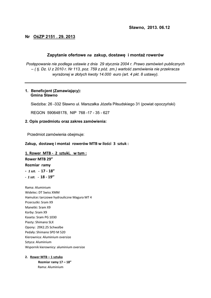 Sławno, 2013. 06.12 Nr OśZP 2151 . 29. 2013 Zapytanie ofertowe na zakup, dostawę i montaż rowerów Postępowanie nie podlega ustawie z dnia 29 stycznia 2004 r. Prawo zamówień publicznych – ( tj. Dz. U z 2010 r. Nr 113, poz. 759 z póź. zm.) wartość zamówienia nie przekracza wyrażonej w złotych kwoty 14.000 euro (art. 4 pkt. 8 ustawy). 1. Beneficjent (Zamawiający): Gmina Sławno Siedziba: 26 -332 Sławno ul. Marszałka Józefa Piłsudskiego 31 (powiat opoczyński) REGON 590648178, NIP 768 -17 - 35 - 627 2. Opis przedmiotu oraz zakres zamówienia: Przedmiot zamówienia obejmuje: Zakup, dostawę i montaż rowerów MTB w ilości 3 sztuk : 1. Rower MTB - 2 sztuki, w tym : Rower MTB 29” Rozmiar ramy - 1 szt. - 17 - 18” - 1 szt. - 18 - 19’’ Rama: Aluminium Widelec: DT Swiss XMM Hamulce: tarczowe hydrauliczne Magura MT 4 Przerzutki: Sram X9 Manetki: Sram X9 Korby: Sram X9 Kaseta: Sram PG 1030 Piasty: Shimano SLX Opony: 29X2.25 Schwalbe Pedały: Shimano SPD M 520 Kierownica: Aluminium oversize Sztyca: Aluminium Wspornik kierownicy: aluminium oversize 2. Rower MTB – 1 sztuka Rozmiar ramy 17 – 18” Rama: Aluminium Widelec: SR XCM Hamulce: tarczowe hydrauliczne Tektro Korby: Shimano M171 Przerzutki: Shimano Deore Manetki: Shimano M360 Kaseta: Sram PG 820 Piasty: Shimano M475 Disc Opony: 29X2.2.1 Maxxis Pedały: Shimano SPD Kierownica: Aluminium oversize Sztyca: Aluminium Wspornik kierownicy: aluminium oversize Zamówienie obejmuję dostarczenie do siedziby Zamawiającego rowerów oraz montaż ( złożenie ) rowerów. 3. Rodzaje i opis kryteriów, którymi Beneficjent będzie się kierował przy wyborze oferty Przy wyborze ofert Beneficjent będzie się kierował następującymi kryteriami: Ceną – 100 % 4. Termin realizacji zamówienia: w ciągu 14 dni od dnia podpisania umowy 5. Miejsce, sposób i termin składania ofert. Ofertę w zamkniętej kopercie należy złożyć do dnia zamawiającego: 2013. 06.20 do godz. 10.00 w siedzibie Urząd Gminy w Sławnie ul. Marszałka Józefa Piłsudskiego 31 pokój Nr 13 - sekretariat z dopiskiem: „Zakup, dostawa i montaż rowerów” Otwarcie ofert dnia 2013. 06.20 o godz. 11.30 w siedzibie zamawiającego: 6. Osobą do kontaktów w sprawie niniejszego zapytania jest: Renata Jakubczyk tel. (44) 755 – 18 – 53 w godz. od 7.30 - 15.30 7. Z firmą, która przedstawi najkorzystniejszą ofertę zostanie podpisana umowa. 8. Wynik postępowania zostanie zamieszczony w BIP Gminy Sławno. 9. Oferta musi być podpisana przez osobę upoważnioną do reprezentowania wykonawcy, zgodnie z formą reprezentacji oferenta określoną w rejestrze handlowym lub innym dokumencie właściwym dla formy organizacji oferenta. Zatwierdził: Wójt Gminy Sławno /-/ mgr Tadeusz Wojciechowski Załącznikiem do niniejszego zaproszenia jest - Formularz cenowy
