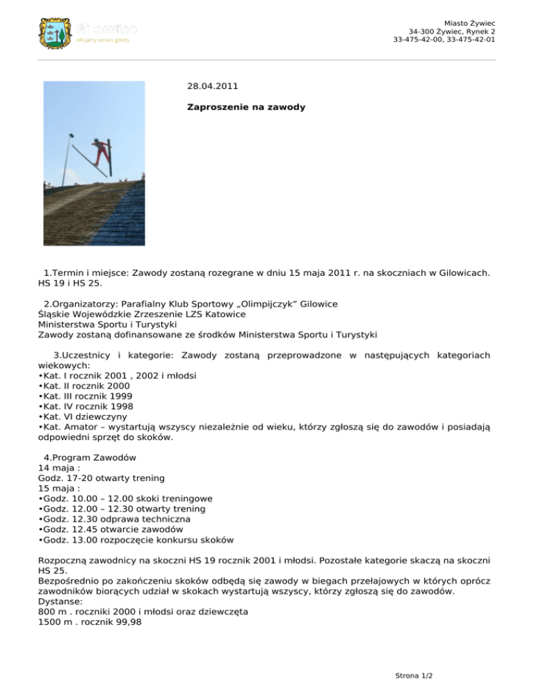 Miasto Żywiec 34-300 Żywiec, Rynek 2 33-475-42-00, 33-475-42-01 28.04.2011 Zaproszenie na zawody 1.Termin i miejsce: Zawody zostaną rozegrane w dniu 15 maja 2011 r. na skoczniach w Gilowicach. HS 19 i HS 25. 2.Organizatorzy: Parafialny Klub Sportowy „Olimpijczyk” Gilowice Śląskie Wojewódzkie Zrzeszenie LZS Katowice Ministerstwa Sportu i Turystyki Zawody zostaną dofinansowane ze środków Ministerstwa Sportu i Turystyki 3.Uczestnicy i kategorie: Zawody zostaną przeprowadzone w następujących kategoriach wiekowych: •Kat. I rocznik 2001 , 2002 i młodsi •Kat. II rocznik 2000 •Kat. III rocznik 1999 •Kat. IV rocznik 1998 •Kat. VI dziewczyny •Kat. Amator – wystartują wszyscy niezależnie od wieku, którzy zgłoszą się do zawodów i posiadają odpowiedni sprzęt do skoków. 4.Program Zawodów 14 maja : Godz. 17-20 otwarty trening 15 maja : •Godz. 10.00 – 12.00 skoki treningowe •Godz. 12.00 – 12.30 otwarty trening •Godz. 12.30 odprawa techniczna •Godz. 12.45 otwarcie zawodów •Godz. 13.00 rozpoczęcie konkursu skoków Rozpoczną zawodnicy na skoczni HS 19 rocznik 2001 i młodsi. Pozostałe kategorie skaczą na skoczni HS 25. Bezpośrednio po zakończeniu skoków odbędą się zawody w biegach przełajowych w których oprócz zawodników biorących udział w skokach wystartują wszyscy, którzy zgłoszą się do zawodów. Dystanse: 800 m . roczniki 2000 i młodsi oraz dziewczęta 1500 m . rocznik 99,98 Strona 1/2 Miasto Żywiec 34-300 Żywiec, Rynek 2 33-475-42-00, 33-475-42-01 Klasyfikacja będzie prowadzona w każdym roczniku. 5.Nagrody w skokach : •Za zajęcie miejsc I do III – zawodnicy otrzymają puchary •Za zajęcie miejsc IV – VI – zawodnicy otrzymają statuetki •Za zajęcie miejsc I – X – zawodnicy otrzymają dyplomy. Najlepsi w poszczególnych kategoriach wiekowych otrzymają nagrody rzeczowe. Nagrody za biegi: Trzech najlepszych zostanie nagrodzonych medalami a pierwszych sześciu otrzyma dyplomy. Wszyscy uczestnicy otrzymają posiłek i napoje oraz słodkie upominki. 6.Postanowienia końcowe: •Wszyscy zawodnicy musza posiadać aktualne karty zdrowia. •Koszty organizacji zawodów pokrywają organizatorzy, a koszty przyjazdu na zawody kluby we własnych zakresie. Zgłoszenia do dnia 12.05.2011 r. na adres fax: 33 8653 – 372 lub mail: [email protected] Strona 2/2 Powered by TCPDF (www.tcpdf.org)