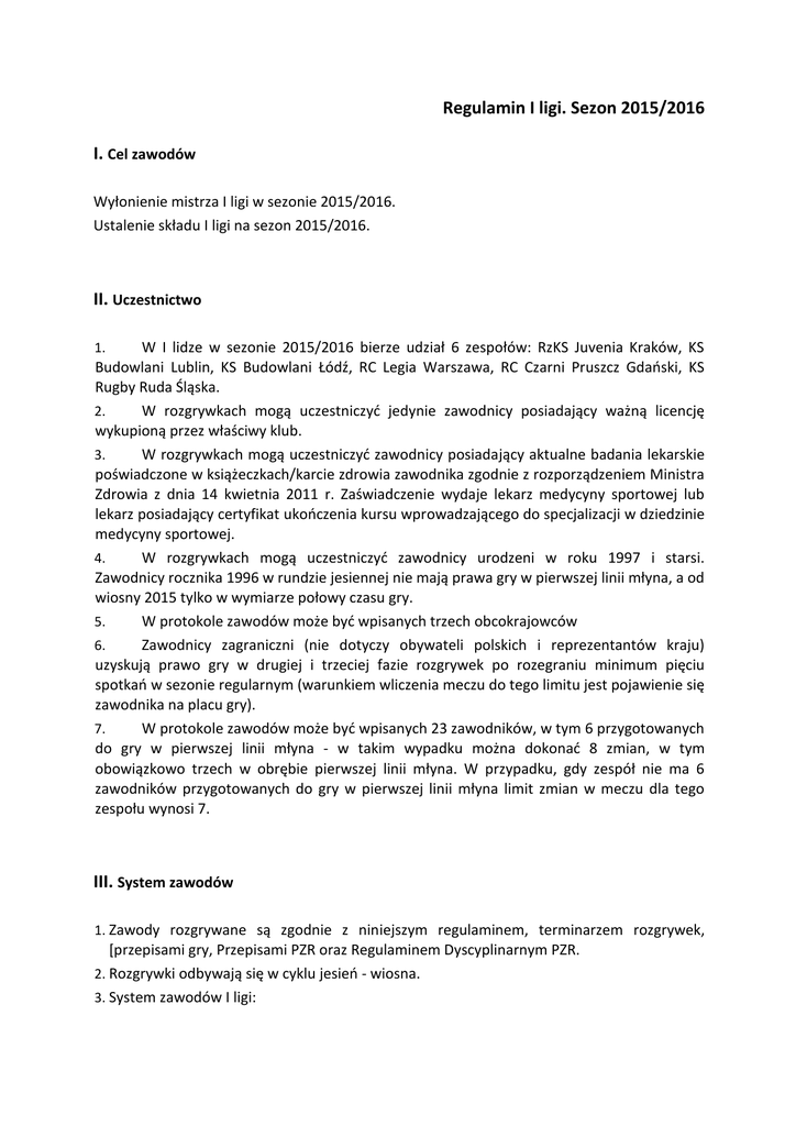 Regulamin I ligi. Sezon 2015/2016 I. Cel zawodów Wyłonienie mistrza I ligi w sezonie 2015/2016. Ustalenie składu I ligi na sezon 2015/2016. II. Uczestnictwo W I lidze w sezonie 2015/2016 bierze udział 6 zespołów: RzKS Juvenia Kraków, KS Budowlani Lublin, KS Budowlani Łódź, RC Legia Warszawa, RC Czarni Pruszcz Gdański, KS Rugby Ruda Śląska. 2. W rozgrywkach mogą uczestniczyć jedynie zawodnicy posiadający ważną licencję wykupioną przez właściwy klub. 3. W rozgrywkach mogą uczestniczyć zawodnicy posiadający aktualne badania lekarskie poświadczone w książeczkach/karcie zdrowia zawodnika zgodnie z rozporządzeniem Ministra Zdrowia z dnia 14 kwietnia 2011 r. Zaświadczenie wydaje lekarz medycyny sportowej lub lekarz posiadający certyfikat ukończenia kursu wprowadzającego do specjalizacji w dziedzinie medycyny sportowej. 4. W rozgrywkach mogą uczestniczyć zawodnicy urodzeni w roku 1997 i starsi. Zawodnicy rocznika 1996 w rundzie jesiennej nie mają prawa gry w pierwszej linii młyna, a od wiosny 2015 tylko w wymiarze połowy czasu gry. 5. W protokole zawodów może być wpisanych trzech obcokrajowców 6. Zawodnicy zagraniczni (nie dotyczy obywateli polskich i reprezentantów kraju) uzyskują prawo gry w drugiej i trzeciej fazie rozgrywek po rozegraniu minimum pięciu spotkań w sezonie regularnym (warunkiem wliczenia meczu do tego limitu jest pojawienie się zawodnika na placu gry). 7. W protokole zawodów może być wpisanych 23 zawodników, w tym 6 przygotowanych do gry w pierwszej linii młyna - w takim wypadku można dokonać 8 zmian, w tym obowiązkowo trzech w obrębie pierwszej linii młyna. W przypadku, gdy zespół nie ma 6 zawodników przygotowanych do gry w pierwszej linii młyna limit zmian w meczu dla tego zespołu wynosi 7. 1. III. System zawodów 1. Zawody rozgrywane są zgodnie z niniejszym regulaminem, terminarzem rozgrywek, [przepisami gry, Przepisami PZR oraz Regulaminem Dyscyplinarnym PZR. 2. Rozgrywki odbywają się w cyklu jesień - wiosna. 3. System zawodów I ligi: I liga rozgrywana będzie w jednej grupie systemem składającym się z trzech faz, zwycięzca I ligi awansuje bezpośrednio do Ekstraligi, a) pierwsza faza - wszystkie zespoły rozgrywają każdy z każdym mecz i rewanż, b) druga faza (półfinały – play-off); zespół, który po dwóch rundach zajmował pierwsze miejsce w tabeli gra na własnym boisku z czwartą drużyną, druga drużyna w tabeli gra na własnym boisku z trzecią drużyną jeden mecz zespół, który po dwóch rundach zajmował piąte miejsce w tabeli gra na własnym boisku z szóstą drużyną mecz decydujący o V miejscu w rozgrywkach, c) trzecia faza (finały play-off); zwycięzcy półfinałów rozgrywają mecz i rewanż o awans do Ekstraligi. Pierwszy mecz na boisku niżej sklasyfikowanego po pierwszej fazie rozgrywek, przegrani w półfinałach spotkają się w meczu o trzecie miejsce na boisku wyżej sklasyfikowanego po rundzie zasadniczej. drużyna, która zajmie szóste miejsce w rozgrywkach I ligi w sezonie 2016/17 gra w II lidze, piąta drużyna w rozgrywkach ( wygrany z meczu o V miejsce I ligi) gra mecz barażowy z drugą drużyną z II ligi na swoim boisku (drużyny z I ligi) o prawo gry w I lidze w sezonie 2016/2017, IV. Klasyfikacja i punktacja 1. O klasyfikacji w pierwszej fazie decydują w kolejności: a) większa liczba zdobytych dużych punktów łącznie z bonusowymi, b) rezultaty bezpośrednich spotkań pomiędzy zainteresowanymi (mała tabela), c) korzystniejszy stosunek małych punktów, d) większa liczba zdobytych małych punktów, e) mniejsza liczba wykluczeń, f) losowanie. 2. W półfinałach, finałach i meczach o miejsca decydują w kolejności: a) większa liczba zdobytych dużych punktów (bez bonusowych), następnie: b) korzystniejszy stosunek małych punktów, następnie c) większa liczba zdobytych małych punktów, następnie d) dogrywka (2 x 10 minut, przerwa 5 minut) następnie, e) rzuty karne - pierwsza faza: 5 prób dla każdej drużyny z linii 22 metrów, - druga faza: po jednej próbie, na zmianę aż do skutku z linii 22 metrów. O kolejności kopów decyduje losowanie. W próbach uczestniczą jedynie ci zawodnicy, którzy ukończyli mecz na boisku. W każdej fazie jeden zawodnik może wykonać tylko jedną próbę. Zawodnik może wykonać drugą próbę jeżeli wszyscy uprawnieni zawodnicy z jego drużyny wykonali już próbę. 3. Punktacja a) za zwycięstwo drużyna otrzymuje 4 lub 5 (4+1) punktów w przypadku, gdy wywalczy bonus, b) za remis drużyna otrzymuje 2 lub 3 (2+1) punkty w przypadku, gdy wywalczy bonus, c) za porażkę drużyna otrzymuje 0 lub 1 punkt w przypadku, gdy wywalczy bonus, d) za porażkę walkowerem drużyna karana jest minus jeden punkt, w małych punktach 0:25, e) za zwycięstwo walkowerem zespół otrzymuje 5 punktów, w małych punktach 25:0, f) za zdobycie w meczu 4 lub więcej przyłożeń zespół otrzymuje dodatkowo 1 punkt bonusowy, g) za przegranie meczu siedmioma i mniej punktami zespół otrzymuje dodatkowo 1 punkt bonusowy, h) zespół może otrzymać tylko jeden punkt bonusowy w danym meczu. V. Kontrola antydopingowa Kluby uczestniczące w rozgrywkach I ligi mają bezwzględny obowiązek podawania informacji na temat miejsca i terminów zorganizowanego treningu zawodników w sposób określony przez Komisję do Zwalczania Dopingu w Sporcie (drogą elektroniczną, za pomocą udostępnionych loginów i haseł). Informacje te będą cały czas traktowane jako poufne i wykorzystywane wyłącznie w celach planowania, koordynowania i przeprowadzania badań antydopingowych oraz zostaną zniszczone, gdy stracą swoją przydatność do wyżej określonych celów. 2. Kluby uczestniczące w rozgrywkach I ligi będą podawać informacje o miejscu i terminach treningów zawodników z góry, co najmniej na okres następnego miesiąca. Informacje te przekazywane będą nie później niż na 7 dni przed rozpoczęciem tego miesiąca. W przyp