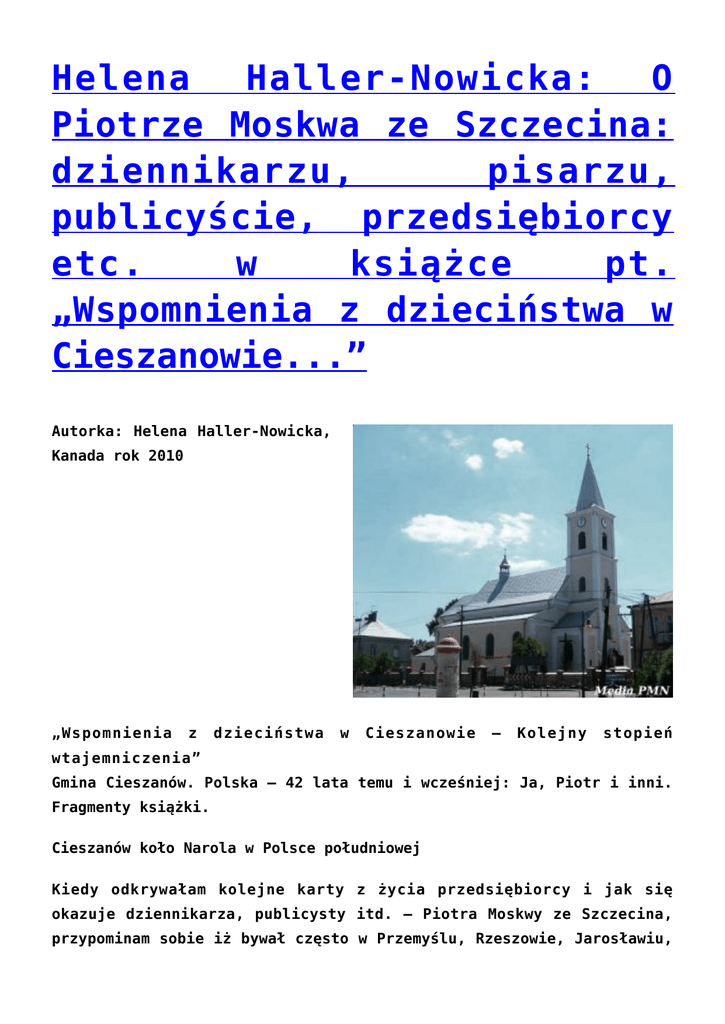 Helena Haller-Nowicka: O Piotrze Moskwa ze Szczecina: dziennikarzu, pisarzu, publicyście, przedsiębiorcy etc. w książce pt. „Wspomnienia z dzieciństwa w Cieszanowie...” Autorka: Helena Haller-Nowicka, Kanada rok 2010 „Wspomnienia z dzieciństwa w Cieszanowie – Kolejny stopień wtajemniczenia” Gmina Cieszanów. Polska – 42 lata temu i wcześniej: Ja, Piotr i inni. Fragmenty książki. Cieszanów koło Narola w Polsce południowej Kiedy odkrywałam kolejne karty z życia przedsiębiorcy i jak się okazuje dziennikarza, publicysty itd. – Piotra Moskwy ze Szczecina, przypominam sobie iż bywał często w Przemyślu, Rzeszowie, Jarosławiu, Lubaczowie, Narolu, a także mieszkał w Cieszanowie na Skorupki u swojej babci Walerii niegdyś szkolnej bibliotekarki, koło drogi do lasu lublinieckiego. Piotra pamiętam jako żywego chłopca i niemiłosiernego rozrabiakę, który wszędzie musiał być, wszystko pragnął wiedzieć, wszędzie wsadził swojego nosa. Taki mały Alfa i Omega – jednym zdaniem. Dla niego książki były czymś ciekawym wręcz fascynującym, co pochłaniał błyskawicznie jak gąbka wodę. Czytanie dla Piotra było nieodpartą pasją. Zaraz obok tej pasji pojawiły się szachy, konie, psy i szereg innych, rzekł by ktoś: nie dla dziecka. Pamiętam go jako nad wyraz uzdolnionego chłopca, ponad wszelką przeciętną – wiele lat młodszego ode mnie kolegę. Mieszkałam wtedy w Cieszanowie, kiedy Piotr jako dziecko przebywał na Skorupki. Wówczas zdarzyło się coś, co dzisiaj wiążę z jego fenomenalnymi zdolnościami, bardzo dużym potencjałem wiedzy i mentalnej siły, którą wykorzystuje i wspiera między innymi w dużej mierze wszystkich ludzi, którym potrzeba pomocy. Jednym przypadkiem, który jest bardzo ważny i tu potrzeba nadmienić jest to iż Piotr wychowany był w rodzinie katolickiej, miał w rodzinie szlachtę i dygnitarzy, księży, generałów, piłsudczyków walczących z carskim wojskiem i można by rzec wielu wysoko postawionych notabli. Dziś śmiało można rzec iż pochodzi z rodziny arystokratycznointeligenckiej. Dziś jak się okazuje Piotr ma rodowe korzenie i łączą jego z nimi niesamowite historie. Z wielu faktów udokumentowanych wiadomo, że rodzinie – właściwie potężnemu rodowi zrabowany został ogromny majątek ziemski, co on jako dziecko już wiedział i postanowił dojść prawdy. Rzecz jasna na owe czasy to były dziecięce rozmowy, których nikt na serio nie wziął. Dziś patrząc wstecz blisko pół wieku temu i na obecne dokonania Piotra wiem iż cały czas on realizuje wszelkie plany ze swojego dzieciństwa i już kolejne. To co robi dziś dla ludzi i Polski świadczy o tym wybitnie, kim jest dzisiaj ? To co robi dziś dla Polski świadczy o jego patriotyzmie i oddaniu szczególnym dla ojczyzny. W Cieszanowie niedaleko Narola Piotra znali wszyscy, bowiem na miejscu jednym długo nie usiedział i miał pomysłów do zabaw bez liku – z pogranicza, jak to dziś się mówi wręcz sportów ekstremalnych, jednak przyznać potrzeba iż służył ludziom pomocą taką, jak tylko umie dziecko i jest w stanie pomóc fizycznie. Miejscowy proboszcz ciągle narzekał na kawały jak mawiał Piotrusia, bowiem ten w nich nie miał umiaru. Najzabawniejsze były kawały Piotrusia, które robił księdzu. Pewnego razu księdzu zamiast wina mszalnego – dolał soku z cytryny i podczas mszy podał do wypicia. Świadkowie opowiadają iż ksiądz po mszy chciał Piotrusiowi skórę wygarbować. Biegał za nim i krzyczał: „Wygonię z Ciebie Szatana !” Ubaw mieli wszyscy niemiłosierny. Warto jest przy tym powiedzieć iż ksiądz bardzo lubił Piotrusia i wybaczał mu wszystko, a ten z oddaniem służył Bogu jako ministrant. Jak się potem po latach dowiedziałam ministrantem też był w Szczecinie. Bliskość parafii jak też służba Bogu kazała wewnętrznym głosem Piotrowi być przy ołtarzu, dlatego był on bardzo pilnym ministrantem, często nagradzanym i lokalnym kawalarzem na Plebani i całym Cieszanowie. Kiedyś żarty wybredne i niewybredne nazywały się: zbytki. Piotr miał pomysłów sporo do zbytków, a że bardzo lubił robić wszystkim kawały, to pewnego razu zwołał paczkę dzieciaków do której wprowadził kilkoro dzieci Cyganów, którzy z rodzicami jechali swoimi wozami przez Cieszanów i razem trzepali z owoców sady w parafii, a potem rozdawali je miejscowym mieszkańcom. Piotr był tak zapobiegliwy iż kiedy widział dojrzale owoce, a szczególnie gruszki klapsy, nie mógł się z tym pogodzić, aby jadły je osy i te spadając na ziemię się na papkę rozbijały. Razu pewnego, kiedy Piotr był na drzewie w okolicznym sadzie wraz z całą ferajną dzieciaków na teren ten wpadły psy pilnujące. Ferajna płakała, a Piotr się śmiał jakby nic się nie stało. Pamiętam jak dziś powiedział: „Jakże jesteś wszyscy słabi w wierze dla Boga naszego.” On gadał i sobie lekceważył psy rozszalałe wokół drzew. Po czym wszystkie z piskiem, jakowymś skowytem niesamowitym uciekły. Dziś kiedy pamięcią dochodzę ponownie do tego wydarzenia jestem przekonana iż Piotr ma szczególne dary dane mu od Boga i je w całym życiu swoim wykorzystuje. Dziś w całość wszystko po latach wiąże i przypominam sobie, że Piotr całą watahę psów za sobą prowadzał po Cieszanowie, niczym pasterz swoje owce. Na Skorupki w Cieszanowie Piotr mieszkał ze swoją babcią Walerią i tu nawet ku niezadowoleniu sąsiadów po cichu trzymał w stodole psa o imieniu Burek. Sąsiad Maciejewicz o który powiadali ludzie iż był kapitanem – bardzo lubił Piotrusia, choć narzekał ciągle na szkody Burka. Prawdę powiedziawszy to dziw na dziwy – Maciejewicz z nikim nie utrzymywał znajomości, z Piotrkiem zaś prowadził częste pogawędki. Kiedyś Piotrek naprawiał płot ze sztachet gospodarstwa babci i jak na dzieciaka sobie nieźle radził. Wtedy to też zobaczył Maciejewicz i pochwalił go i ba