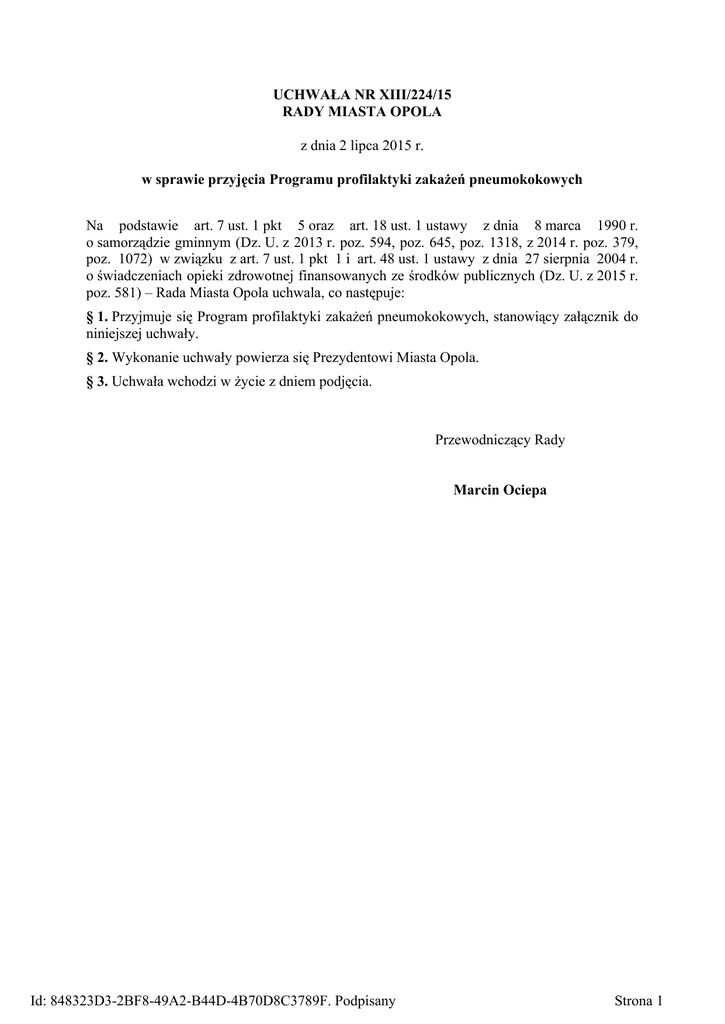 UCHWAŁA NR XIII/224/15 RADY MIASTA OPOLA z dnia 2 lipca 2015 r. w sprawie przyjęcia Programu profilaktyki zakażeń pneumokokowych Na podstawie art. 7 ust. 1 pkt 5 oraz art. 18 ust. 1 ustawy z dnia 8 marca 1990 r. o samorządzie gminnym (Dz. U. z 2013 r. poz. 594, poz. 645, poz. 1318, z 2014 r. poz. 379, poz. 1072) w związku z art. 7 ust. 1 pkt 1 i art. 48 ust. 1 ustawy z dnia 27 sierpnia 2004 r. o świadczeniach opieki zdrowotnej finansowanych ze środków publicznych (Dz. U. z 2015 r. poz. 581) – Rada Miasta Opola uchwala, co następuje: § 1. Przyjmuje się Program profilaktyki zakażeń pneumokokowych, stanowiący załącznik do niniejszej uchwały. § 2. Wykonanie uchwały powierza się Prezydentowi Miasta Opola. § 3. Uchwała wchodzi w życie z dniem podjęcia. Przewodniczący Rady Marcin Ociepa Id: 848323D3-2BF8-49A2-B44D-4B70D8C3789F. Podpisany Strona 1 Załącznik do uchwały nr XIII/224/15 Rady Miasta Opola z dnia 2 lipca 2015 r. PROGRAM PROFILAKTYKI ZAKAŻEŃ PNEUMOKOKOWYCH Urząd Miasta Opola Wydział Polityki Społecznej 1. Opis problemu zdrowotnego a. Problem zdrowotny Pneumokok (Streptococcus pneumoniae) jest bardzo rozpowszechnionym patogenem wywołującym zakażenia zarówno u dzieci, jak i dorosłych. Jest jedną z głównych przyczyn wywołujących zapalenie opon mózgowo-rdzeniowych u dzieci i odpowiada za największą ilość zgonów oraz powikłań neurologicznych w przebiegu tych zakażeń. Bakteria ta jest również główną przyczyną zakażeń inwazyjnych u dzieci, innych niż zapalenie opon mózgowordzeniowych, takich jak zapalenie płuc, posocznica (sepsa) oraz zakażenia nieinwazyjne – zapalenie ucha u niemowląt i zapalenie zatok u dzieci starszych. Istnieje 90 odmian pneumokoka, w tym 9 szczególnie zjadliwych, powodujących najcięższe zakażenia. Od wielu lat obserwuje się narastającą ich oporność na penicylinę. Szczepy bakterii niewrażliwe na penicylinę są często także oporne na inne antybiotyki, co w znacznym stopniu utrudnia leczenie dzieci zakażonych tą bakterią i powoduje znaczny wzrost kosztów leczenia tych zakażeń. Bakterie są przenoszone drogą kropelkową, a źródło zakażenia stanowi nosiciel. Nosicielami pneumokoków w górnych drogach oddechowych są ludzie. Nosicielstwo to jest najczęściej bezobjawowe, a dotyczy około 5-10 % zdrowych dorosłych i około 22-62 % zdrowych dzieci. Największy odsetek nosicielstwa, bo aż 80-98 %, występuje u małych dzieci od 6 miesiąca życia do 5 roku życia. Dzieci te, ze względu na niedojrzały układ immunologiczny, są szczególnie narażone na zachorowanie, a przebywanie w żłobku, przedszkolu, placówce opiekuńczo-wychowawczej, pora roku (sezon zimowy i wiosenny), nawracające zakażenia wirusowe dróg oddechowych, wcześniejsza antybiotykoterapia, złe warunki socjalne czy narażenie na dym tytoniowy potęguje to zagrożenie. b. Epidemiologia Światowa Organizacja Zdrowia alarmuje, że zakażenia pneumokokowe są jednym z najpoważniejszych problemów epidemiologicznych naszych czasów i jedną z głównych przyczyn zachorowalności i umieralności dzieci. Szacuje się, iż w wyniku chorób pneumokokowych, co roku umiera od 700.000 do 1.000.000 dzieci na świecie. Zapadalność na choroby pneumokokowe wśród dzieci poniżej 5 roku życia zróżnicowana jest pod względem kraju i regionu świata i występuje na poziomie od 188 do 6.387/100.000. Najwyższa zapadalność występuje w krajach Afryki (średnio 3.627/100.000), a najniższa w Europie (średnio 504/100.000). Umieralność z powodu chorób pneumokokowych wynosi średnio 133/100.000, przy czym najwyższa jest w Afryce (399/100.000), a najniższa w Europie (29/100.000). Id: 848323D3-2BF8-49A2-B44D-4B70D8C3789F. Podpisany Strona 1 Zapadalność wśród dzieci od 0 do 23 miesiąca życia (na 100.000) na inwazyjną chorobę pneumokokową w krajach europejskich w latach 1990-2003 W Polsce ogólna częstość występowania inwazyjnej choroby pneumokokowej u dzieci jest podobna, jak w innych krajach europejskich (17,6/100.000 w grupie 0-5 lat oraz 19/100.000 w grupie 0-2 lata). Śmiertelność wywołana przez pneumokoka w zapaleniu opon mózgowordzeniowych wynosi 3,4 %. U ponad 10 % dzieci z zapaleniem opon mózgowo-rdzeniowych dochodzi do trwałych uszkodzeń w następstwie choroby. Zapadalność na inwazyjną chorobę pneumokokową w Polsce Według danych Światowej Organizacji Zdrowia liczba zachorowań spowodowanych Id: 848323D3-2BF8-49A2-B44D-4B70D8C3789F. Podpisany Strona 2 zakażeniem pneumokokowym z roku na rok sukcesywnie rośnie. W 2010 r. w Polsce zapadło na inwazyjną chorobę pneumokokową 25 razy więcej dzieci w porównaniu z danymi z lat 2001-2004. c. Populacja podlegająca jednostce samorządu terytorialnego i populacja kwalifikująca się do włączenia do Programu Liczba mieszkańców miasta Opola na dzień 31 maja 2015 r. to 119.445 osób. Populacja kwalifikująca się do włączenia do Programu to dzieci od 7 miesiąca życia do 48 miesiąca życia. Na terenie miasta Opola w ww. przedziale wiekowym zameldowanych jest 3.961 dzieci (według stanu na dzień 31 maja 2015 r.). d. Obecne postępowanie w omawianym problemie zdrowotnym ze szczególnym uwzględnieniem gwarantowanych świadczeń opieki zdrowotnej finansowanych ze środków publicznych Od października 2011 r., zgodnie z rozporządzeniem Ministra Zdrowia z dnia 18 sierpnia 2011 r. w sprawie obowiązkowych szczepień ochronnych (Dz. U. Nr 182, poz. 1068), szczepienia przeciwko tym bakteriom są refundowane ze środków publicznych wyłącznie u dzieci urodzonych przedwcześnie (poniżej 37 tygodnia ciąży) lub z niską masą urodzeniową (mniej niż 2.500 g), a także u dzieci do 5 roku życia z grup wysokiego ryzyka. Są to m.in. maluchy po urazach lub z wadami ośrodkowego układu nerwowego, zakażone HIV, po przeszczepieniu szpiku, przed przeszczepieniem lub po przeszczepieniu narządów wewnętrznych oraz implantu ślimakowego, cierp