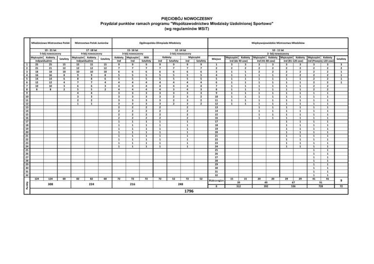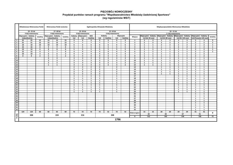 PIĘCIOBÓJ NOWOCZESNY Przydział punktów ramach programu "Współzawodnictwo Młodzieży Uzdolnionej Sportowo" (wg regulaminów MSiT) 1 2 3 4 5 6 7 8 9 10 11 12 13 14 15 16 17 18 19 20 21 22 23 24 25 26 27 28 29 30 31 32 Młodzieżowe Mistrzostwa Polski Mistrzostwa Polski Juniorów 19 - 21 lat 5-bój nowoczesny Mężczyźni Kobiety Sztafety indywidualnie 25 25 15 21 21 12 18 18 10 16 16 8 14 14 6 12 12 4 10 10 3 8 8 2 17 -18 lat 4-bój nowoczesny Mężczyźni Kobiety Sztafety Indywidualnie 15 15 15 12 12 12 10 10 10 9 9 8 8 8 6 7 7 4 6 6 3 5 5 2 4 4 3 3 2 2 1 1 Punkty 124 124 308 60 82 82 224 60 Ogólnopolska Olimpiada Młodzieży 15- 16 lat 3-bój nowoczesny Kobiety Mężczyźni MIX Ind Ind Sztafety 9 9 9 7 7 7 6 6 6 5 5 5 5 5 5 4 4 4 4 4 4 4 4 4 3 3 3 3 3 3 3 3 3 3 3 3 2 2 2 2 2 2 2 2 2 2 2 2 1 1 1 1 1 1 1 1 1 1 1 1 1 1 1 1 1 1 1 1 1 1 1 1 72 72 216 72 Międzywojewódzkie Mistrzostwa Młodzików 12 -14 lat 2-bój nowoczesny Kobiety Mężczyźni ind Sztafety ind Sztafety 9 9 9 9 7 7 7 7 6 6 6 6 5 5 5 5 5 5 5 5 4 4 4 4 4 4 4 4 4 3 4 3 3 3 3 3 3 2 3 2 3 2 3 2 3 2 3 2 2 2 2 2 2 2 2 2 1 1 1 1 1 1 1 1 1 1 1 1 1 1 1 1 72 52 72 248 52 Miejsce 1 2 3 4 5 6 7 8 9 10 11 12 13 14 15 16 17 18 19 20 21 22 23 24 25 26 27 28 29 30 31 32 Makroregion 8 1796 Mężczyźni Kobiety ind (do 40 zaw) 3 3 2 2 1 1 1 1 1 1 1 1 1 1 1 1 1 1 1 1 1 1 1 1 15 15 39 312 10 - 11 lat 2- bój nowoczesny Mężczyźni Kobiety Mężczyźni Kobiety ind (41-80 zaw) ind (81-120 zaw) 3 3 3 3 2 2 2 2 2 2 2 2 1 1 2 2 1 1 1 1 1 1 1 1 1 1 1 1 1 1 1 1 1 1 1 1 1 1 1 1 1 1 1 1 1 1 1 1 1 1 1 1 1 1 1 1 1 1 1 1 1 1 1 1 1 1 1 1 1 1 1 1 1 1 1 1 1 1 1 1 20 20 49 392 29 29 67 536 Mężczyźni Kobiety Sztafety ind (Powyżej 120 zaw) 3 3 3 2 2 2 2 2 1 2 2 1 2 2 1 2 2 1 2 2 2 2 1 1 1 1 1 1 1 1 1 1 1 1 1 1 1 1 1 1 1 1 1 1 1 1 1 1 1 1 1 1 1 1 1 1 1 1 1 1 1 1 1 1 1 1 1 1 1 1 41 41 9 91 728 72