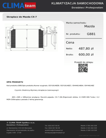 Skraplacz do Mazda CX-7 Marka samochodu: Mazda Nr. produktu: G881 Cena Netto: 487,80 zł Brutto: 600,00 zł Przejdź do sklepu OPIS PRODUKTU Kod produktu:G881Opis produktu:Numer oryginału: EGY16148ZB / EGY16148ZC / EH4461480A / EHY46148Z Czynnik chłodniczy:Wymiary skraplacza (szerxwysxgr): 400 x 605 x 16Rozmiar przyłączy: Rocznik pojazdu: CX-7 (06-)Pojemność silnika: 2.3 MZR DISI Turbo / 2.2 MZR-CDSkraplacz posiada 2 letnią gwarancję. © CLIMA TEAM Spółka z o.o. Doradztwo i Profesjonalizm Tel: (022) 817 83 01 Mobile: 0 501 642 528 ul. Staniewicka 2 03-310 Warszawa Fax: (022) 817 84 49 Mobile: 0 501 642 529 Zapraszamy od poniedziałku do piątku [email protected] Mobile: 0 500 119 528 w godz. 9:00 - 17:00 [email protected] projekt GRAFCOM | Netler Shop 1.020