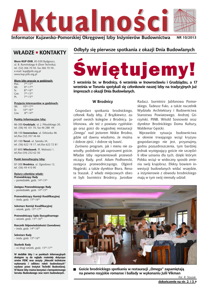 Informator Kujawsko-Pomorskiej Okręgowej Izby Inżynierów Budownictwa WŁADZE KONTAKTY Biuro KUP OIIB, 85-030 Bydgoszcz, ul. B. Rumińskiego 6 (Dom Technika), tel. (52) 366 70 50, fax 366 70 59., e-mail: [email protected] www.kup.piib.org.pl Biuro Izby pracuje w godzinach: Pon. 700-1500 Wt. 900-1700 Śr. 800-1600 Czw. 700-1500 Pt. 700-1500 Przyjęcia interesantów w godzinach: Wt. 1000-1700 Śr. 1000-1600 Czw. 800-1400 Punkty Informacyjne Izby: 86-300 Grudziądz, ul. J. Piłsudskiego 20, tel. (56) 46 101 70, fax 46 288 44 88-100 Inowrocław, ul. Orłowska 48, tel./fax (52) 357 46 66 87-100 Toruń, ul. Szeroka 34, tel. (56) 622 19 17, tel./fax 622 72 81 87-800 Włocławek, Pl. Wolności 1, tel./fax (54) 232 62 50 Punkt konsultacyjny Izby: 87-300 Brodnica, ul. Ogrodowa 12, tel. (56) 49 410 90 Dyżury członków władz: Przewodniczący Rady – poniedziałek, godz. 1400-1500 NR 10/2013 Odbyły się pierwsze spotkania z okazji Dnia Budowlanych Świętujemy! 5 września br. w Brodnicy, 6 września w Inowrocławiu i Grudziądzu, a 17 września w Toruniu spotykali się członkowie naszej Izby na tradycyjnych już imprezach z okazji Dnia Budowlanych. W Brodnicy Gospodarz spotkania brodnickiego, członek Rady Izby, Z Brążkiewicz, zaprosił swoich kolegów z Brodnicy, Jabłonowa, ale też z powiatu rypińskiego oraz gości do wygodnej restauracji „Omega” nad jeziorem Niskie Brodno, gdzie od dawna wiadomo, że można i dobrze zjeść, i dobrze się bawić. Zarówno program, jak i menu nie zawiodły, podobnie jak zaproszeni goście. Władze Izby reprezentowali przewodniczący Rady, prof. Adam Podhorecki, zastępca przewodniczącego, Olgierd Nagórski, a także dyrektor Biura, Renata Staszak. Z władz miejscowych obecni byli: burmistrz Brodnicy, Jarosław Radacz, burmistrz Jabłonowa Pomorskiego, Tadeusz Fuks, a także naczelnik Wydziału Architektury i Budownictwa Starostwa Powiatowego, Andrzej Górzyński, PINB, Witold Sosnowski oraz dyrektor Brodnickiego Domu Kultury, Waldemar Gęsicki. Wprawdzie sytuacja budownictwa w okresie trwającego wciąż kryzysu gospodarczego nie jest, przyznajmy, godna pozazdroszczenia, tym bardziej jednak występujący goście nie szczędzili słów uznania dla tych, dzięki którym Polska wciąż w widoczny sposób zmienia swój krajobraz. Efekty bowiem inwestycji budowlanych widać wszędzie, a inżynierowie z obwodu brodnickiego mają w tym swój niemały udział. Zastępca Przewodniczącego Rady – poniedziałek, godz. 1400-1500 Przewodniczący Komisji Kwalifikacyjnej – środa, godz. 1500-1600 Sekretarz Komisji Kwalifikacyjnej – wtorek, godz. 1500-1700 Przewodniczący Sądu Dyscyplinarnego – wtorek, godz. 1500-1600 Rzecznik Odpowiedzialności Zawodowej – środa, godz. 1400-1600 Sekretarz Rady – środa, godz. 1500-1600 Skarbnik Rady – co drugi wtorek, godz. 1500-1700 W siedzibie Izby i w punktach informacyjnych dostępne są do wglądu materiały dotyczące umów FIDIC oraz zeszyty „Warunki techniczne wykonania i odbioru robót budowlanych” wydane przez Instytut Techniki Budowlanej. W biurze Izby można korzystać z komputerowego Serwisu Budowlanego oraz norm budowlanych. Goście brodnickiego spotkania w restauracji „Omega” zapamiętają na pewno rosyjskie romanse i ballady w wykonaniu Julii Vikman Fot. R. Staszak dokończenie na str. 2. i 3. Informator Kujawsko-Pomorskiej Okręgowej Izby Inżynierów Budownictwa październik 2013 dokończenie ze str. 1. W Grudziądzu W grudziądzkim „Czarcim Młynie” nie zawiódł żaden z ważnych gości, nie zawiodła też piękna pogoda Fot. R. Staszak Po oficjalnych wystąpieniach przyszedł czas degustacji wielu dobrych rzeczy, wśród których wyróżniał się i pachnący świeżością schabowy, i różnorakie sałatki, a później nasz polski bigos. Do tego chłodne piwo, ile dusza zapragnie. Były też smakowite desery, ale tym razem wszystko przebiła gwiazda wieczoru, występująca z re- citalem rosyjskich ballad i romansów Julia Vikman z towarzyszącymi jej instrumentalistami z Gdańska. Blondwłosa Rosjanka zachwyciła nie tylko aparycją i pięknym, głębokim głosem, ale i umiejętnym tworzeniem dawnego klimatu pieśni pełnych tęsknoty i zadumy, brzmiących w uszach jeszcze długo po zakończeniu koncertu. Grudziądzkie spotkanie w restauracji „Czarci Młyn” uświetnili również przewodniczący Rady KUP OIIB, prof. Adam Podhorecki oraz dyrektor Renata Staszak, a zapraszał gospodarz imprezy, przewodniczącego Rady, Olgierd Nagórski. Spośród przedstawicieli miejscowych władz nie zabrakło tym razem prezydenta miasta, Roberta Malinowskiego oraz bardzo popularnego w całej Polsce, posła Janusza Dzięcioła. stawili się także wicestarosta Edmund Korgol, wiceprzewodniczący Grudziądzkiej Rady FSNT NOT, Henryk Rybarczyk oraz prezesi wielu spółek komunalnych miasta. Inwestycje w tym regionie prezentowaliśmy na początku roku. Największa, to rewitalizacja portu i nabrzeża Wisły. Inwestycja warta 30 mln zł powinna się zakończyć w grudniu, ale konsorcjum warszawskiego Mostostalu nie stanęło tym razem na wysokości zadania i nie ma pewności, że termin zostanie dotrzymany. Tematów do rozmów podczas spotkania było zapewne znacznie więcej, ale to nie popsuło atmosfery radosnego święta, która jest charakterystyczna dla grudziądzkiego środowiska. Bawiono się do późnych godzin wieczornych i nikomu jakoś nie chciało się spać. Ze względu na piękną pogodę tego dnia, gospodarz zaproponował wszystkim wieczór grillowy na świeżym powietrzu. Podawano aromatyczne kiełbaski z rusztu, karkówkę, misternie przyrządzone szaszłyki i kaszankę, które obficie popijano piwem. Pomysł trafiony w dziesiątkę. W Inowrocławiu Inowrocławska restauracja „Park” oferowała dania z grilla i doskonałe przystawki Fot. T. Kozłowski Inowrocław również ma swoje ulubione miejsce spotkań. To restauracja i hotel „Park”, położony w części uzdrowiskowej mi