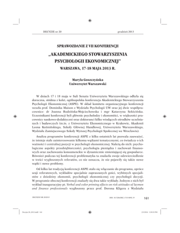 DECYZJE nr 20 grudzień 2013 SPRAWOZDANIE Z VII KONFERENCJI „AKADEMICKIEGO STOWARZYSZENIA PSYCHOLOGII EKONOMICZNEJ” WARSZAWA, 17-18 MAJA 2013 R. Maryla Goszczyńska Uniwersytet Warszawski W dniach 17 i 18 maja w Sali Senatu Uniwersytetu Warszawskiego odbyła się doroczna, siódma z kolei, ogólnopolska konferencja Akademickiego Stowarzyszenia Psychologii Ekonomicznej (ASPE). W skład komitetu organizacyjnego konferencji weszła prof. Dominika Maison z Wydziału Psychologii UW oraz jej dwie współpracownice: dr Joanna Rudzińska-Wojciechowska i mgr Katarzyna Sekścińska. Uczestnikami konferencji byli głównie psycholodzy i ekonomiści, w większości pracownicy naukowo-dydaktyczni oraz doktoranci kilku wiodących ośrodków uczelnianych i badawczych (m.in. z Uniwersytetu Ekonomicznego w Krakowie, Akademii Leona Koźmińskiego, Szkoły Głównej Handlowej, Uniwersytetu Warszawskiego, Wydziału Zamiejscowego Szkoły Wyższej Psychologii Społecznej we Wrocławiu). Analiza programów konferencji ASPE z kilku ostatnich lat pozwala zauważyć, że istnieje stałe zainteresowanie kilkoma wątkami tematycznymi, co świadczy o ich ważności i centralnej pozycji w psychologii ekonomicznej. Należą do nich: psychologiczne aspekty przedsiębiorczości, psychologia pieniądza i zachowań finansowych oraz zachowania konsumenckie w dynamicznie zmieniającej się gospodarce. Również podczas tej konferencji problematyka ta znalazła swoje odzwierciedlenie w treści wygłoszonych referatów, co nie oznacza, że nie pojawiły się także nowe wątki i nowe problemy. Od kilku lat tradycją konferencji ASPE stało się włączanie do programu, oprócz sesji referatowych, wykładów specjalnie zapraszanych gości, wybitnych specjalistów z dziedziny ekonomii, psychologii ekonomicznej czy psychologii decyzji. W programie obecnej konferencji znalazły się dwa takie wykłady. Jednym z nich był wykład inauguracyjny pt. Verbal and color priming effects on risk attitudes of laymen and finance professionals wygłoszony przez prof. Dorona Kligera z Wydziału DECYZJE NR 20/2013 Decyzje 20_2013.indd 161 DOI: 10.7206/DEC.1733-0092.19 161 2/3/2014 3:59:55 PM WYDARZENIA Ekonomii na Uniwersytecie Haifa. Głównym przedmiotem rozważań była kwestia roli dwóch tytułowych rodzajów primingu w decyzjach finansowych podejmowanych przez profesjonalistów i laików. W wykładzie przedstawiono wyniki serii przeprowadzonych badań. W ciągu dwóch dni trwania konferencji wygłoszono łącznie 21 referatów zgrupowanych w pięciu blokach tematycznych. Ponieważ w krótkim sprawozdaniu nie sposób omówić treści wszystkich wystąpień, ograniczymy się jedynie do scharakteryzowania głównych wątków tematycznych każdego z tych bloków. W ramach bloku 1 (Rynek finansowy i Przedsiębiorczość) wygłoszono pięć referatów poświęconych takim problemom jak racjonalność zachowań inwestycyjnych, psychologiczne aspekty analizy technicznej oraz specyfika zjawiska dyskontowania. W badaniu referowanym przez Elżbietę Kubińską i Łukasza Markiewicza analizowana była spójność deklaracji o stosowaniu analizy technicznej z dokonywanymi transakcjami oraz jej efektywność. Celem referatu Marcina Rzeszutka i Moniki Czerwonki było pokazanie, jak uleganie zniekształceniom poznawczym oraz emocjonalnym przez inwestorów giełdowych wpływa na racjonalność ich zachowań inwestycyjnych. Kolejne dwa referaty dotyczyły zjawiska dyskontowania, przy czym Marcin Palenik skupił się na omówieniu zjawisk, które sprzyjają występowaniu ujemnej stopy dyskontowej, zaś Artur Domurat – na związku łączącym dyskontowanie z przedsiębiorczością. Tematyka referatów w bloku 2 (Pieniądze) dowodzi, że fundamentalne w psychologii ekonomicznej pojęcie, jakim jest pieniądz, ciągle inspiruje poczynania badaczy i wzbudza silne zainteresowanie. Tym razem referaty tego bloku koncentrowały się wokół takich kwestii jak: rola aktywacji idei pieniądza w działaniach dzieci (Agata Gąsiorowska, Tomasz Zaleśkiewicz, Kathleen Vohs), rola poziomów kodowania informacji w zachowaniach oszczędnościowych (Joanna Rudzińska-Wojciechowska) oraz determinanty koncentracji jednostki na posiadaniu pieniędzy (Magdalena Szawarska). W referacie zamykającym ten blok Grażyna Wąsowicz-Kiryło zaprezentowała oparty na wynikach jej wieloletnich badań hierarchiczny model stosunku człowieka do pieniędzy. Blok 3 (Lęk przed śmiercią) prezentował tematykę dość nową w badaniach polskich psychologów ekonomicznych, a mianowicie rolę elementu teorii wzbudzania trwogi, jakim jest lęk przed śmiercią, w skłonności do oszczędzania (Zaleśkiewicz, Gąsiorowska, Kesebir), w moralnej ocenie zachowań nieetycznych (Kołodziej, Piotrowska, Pfeifer) czy we wzbudzaniu zapotrzebowania na nieśmiertelność (Tomasz Baran). Konferencji towarzyszyła także sesja posterowa, która zakończyła pierwszy dzień obrad. Tematyka jej była dość różnorodna, o czym świadczą tytuły kilku przykłado- 162 Decyzje 20_2013.indd 162 DOI: 10.7206/DEC.1733-0092.19 DECYZJE NR 20/2013 2/3/2014 3:59:55 PM WYDARZENIA wych plakatów: (1) Wykorzystanie narzędzi informatycznych w psychologii i ekonomii (Robert Borowski); (2) Cechy indywidualne jako determinanty oszczędzania pieniędzy przez młodzież (Agata Trzcińska); (3) Perspektywa temporalna a przejawy przedsiębiorczości wśród studentów i młodych przedsiębiorców (Anna Karcz). Drugi dzień obrad otworzył wykład gościa specjalnego, prof. Tadeusza Tyszki z Akademii Leona Koźmińskiego. Nosił on tytuł Duże zagrożenia o małym prawdopodobieństwie i był poświęcony prezentacji projektu badawczego mającego na celu analizę problemu percepcji niskich prawdopodobieństw towarzyszących zagrożeniom o dużych stratach. Realizowane badania obejmują m.in. analizę skuteczności metod informowania o narażeniu na tego typu ryzyko oraz rolę afektu w reagowaniu na niebezpieczeństwa o m