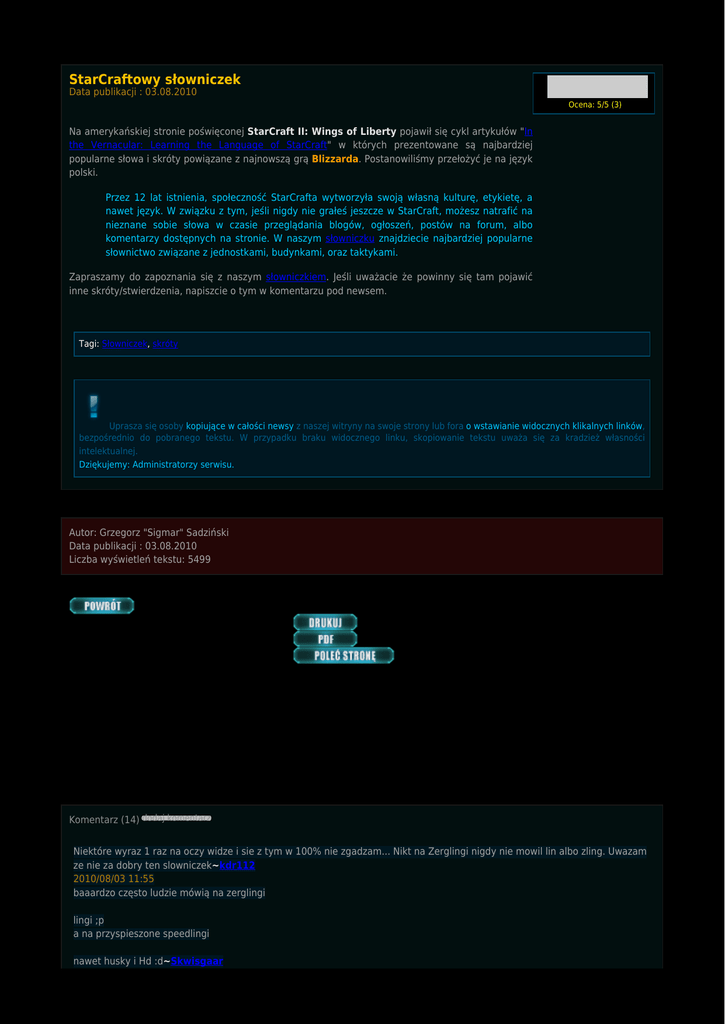 StarCraftowy słowniczek Data publikacji : 03.08.2010 Ocena: 5/5 (3) Na amerykańskiej stronie poświęconej StarCraft II: Wings of Liberty pojawił się cykl artykułów "In the Vernacular: Learning the Language of StarCraft" w których prezentowane są najbardziej popularne słowa i skróty powiązane z najnowszą grą Blizzarda. Postanowiliśmy przełożyć je na język polski. Przez 12 lat istnienia, społeczność StarCrafta wytworzyła swoją własną kulturę, etykietę, a nawet język. W związku z tym, jeśli nigdy nie grałeś jeszcze w StarCraft, możesz natrafić na nieznane sobie słowa w czasie przeglądania blogów, ogłoszeń, postów na forum, albo komentarzy dostępnych na stronie. W naszym słowniczku znajdziecie najbardziej popularne słownictwo związane z jednostkami, budynkami, oraz taktykami. Zapraszamy do zapoznania się z naszym słowniczkiem. Jeśli uważacie że powinny się tam pojawić inne skróty/stwierdzenia, napiszcie o tym w komentarzu pod newsem. Tagi: Słowniczek, skróty Uprasza się osoby kopiujące w całości newsy z naszej witryny na swoje strony lub fora o wstawianie widocznych klikalnych linków, bezpośrednio do pobranego tekstu. W przypadku braku widocznego linku, skopiowanie tekstu uważa się za kradzież własności intelektualnej. Dziękujemy: Administratorzy serwisu. Autor: Grzegorz "Sigmar" Sadziński Data publikacji : 03.08.2010 Liczba wyświetleń tekstu: 5499 Komentarz (14) dodaj komentarz Niektóre wyraz 1 raz na oczy widze i sie z tym w 100% nie zgadzam... Nikt na Zerglingi nigdy nie mowil lin albo zling. Uwazam ze nie za dobry ten slowniczek~kdr112 2010/08/03 11:55 baaardzo często ludzie mówią na zerglingi lingi ;p a na przyspieszone speedlingi nawet husky i Hd :d~Skwisgaar 2010/08/03 12:05 ja mam male pytanie. czy ktos spotkal sie juz z tym Starve? bo mi to wyglada na malo praktyczny manerw i na pewno bardzo czasochlonny i kosztowny~gnomu 2010/08/03 13:18 gnowu ja tak czasem robię w 2vs2 (bardzo rzadko) ale to zależy od mapy i sytuacji~kudlaty1985 2010/08/03 13:32 Witam, czy mógłby mi ktoś dpowiedzieć na 1 pytanie, a mianowicie jak wyglądają filmiki kampanii w polskiej wersji sc2 tzn. czy sa po ang z napisami polskimi czy jest dubbing??????~simon4 2010/08/03 13:46 jest dubbing, jeśli nieoglądałeś ang. wersji to polska ci się spodoba :D~Ziber 2010/08/03 14:11 Mam polska wersje, bo taka mi się ściągnęła, ale powiem, że jestem mile zaskoczony. Cała kampania jest w pełni spolszczona i nie ma polskich napisów, lecz polski dubbing w każdej cząstęczce tego dzieła :)~Pejos 2010/08/03 14:11 W dużej ilości się nie spotkałem z takimi określeniami jak piszecie, ale nie zaprzeczam, pewnie związane to z tym iż gram na TSie, co przyśpiesza decyzje i ułatwia komunikację.~Ughil 2010/08/03 14:15 Skad my macie te nazwy ...w 50% to jakies wymysly autora slowniczka , albo nie wiem gdzie on gral :P~Pallad 2010/08/03 14:22 Cóż tak jak jest napisane w newsie oraz w dziale w którym znajduje się słowniczek "Opracowane na podstawie: In the Vernacular: Learning the Language of StarCraft" z oficjalnej strony StarCraft 2. Jeśli uważacie że coś jest nie tak, powinno pojawić się coś innego to jesteśmy otwarci na propozycje.~Sigmar 2010/08/03 14:25 Wszystkie te nazwy/skróty są powtarzane przez osoby mocno związane ze sceną, które bardzo często mówią i dyskutują o SC progamerzy, komentatorzy etc. Tyle, że głównie u anglosasów i spora część to pozostałość po SC:BroodWar, dlatego też dla wielu z Was mogą się wydawać cokolwiek dziwne/egzotyczne. Ale możecie nam uwierzyć na słowo, że są osoby, które gadają tylko tym "slangiem" :)~KruczoCzarny Battlenet Network 2010/08/03 14:39 Ten słowniczek jest bardzo pomocny, w końcu wiem o czym mówią w anglojęzycznych komentarzach podczas gier SC 2 :)~ hellknight 2010/08/03 15:05 Dodał bym jeszcze określenia taktyk: Fast * (np. Fast Muta) Często się z tym spotykałem jak ktoś stara się maxymalnie szybko dojść do konkretnych jednostek~ oster 2010/08/03 15:26 nie wiem o co wam chodzi ludziska... wszystko się zgadza w tym słowniczku, a komentowane repki np. przez HD, Huskyego czy Day9 są naszpikowane tym słownictwem.~borek87 2010/08/04 08:43 dodaj komentarz 08.10.2015 Kampania "Szepty o zagładzie" dostępna za darmo (0 komentarzy) 27.09.2015 Kolejni bohaterowie w trybie Sprzymierzonych Dowódców (0 komentarzy) 22.09.2015 Cyfrowe gadżety za udział w BlizzCon 2015 (0 komentarzy) 15.07.2015 Legacy of the Void dostępne w przedsprzedaży! (0 komentarzy) 17.06.2015 Informacje z E3 - prolog kampanii Legacy of the Void (0 komentarzy) 30.05.2015 WCS Europe - sobota (30 maja) 18.00 grupa G - MaNa! (0 komentarzy) 07.05.2015 DreamHack Open France 2015 - już 8 maja - MaNa! (0 komentarzy) 03.05.2015 Na wesoło: postacie E-sportu 50 (0 komentarzy) 03.05.2015 IEM Katowice 2015 - jeszcze raz! (0 komentarzy) 03.05.2015 KeSPA Cup 2015 Season 1 - live! (0 komentarzy) 26.04.2015 Proleague - Top5 gier miesiąca (0 komentarzy) 26.04.2015 CJ Entus wygrywa 2 runde Proleague! (0 komentarzy) 18.04.2015 Wersja beta Legacy of the Void – aktualizacja 2.5.1 (0 komentarzy) 18.04.2015 WCS finals 2015 - galeria (0 komentarzy) 18.04.2015 Omówienie zmian w balansie Legacy of the Void (0 komentarzy) 11.04.2015 WCS Europe kwalifikacje z Polakami - dziś (sobota) 18.00 (0 komentarzy) 11.04.2015 Aktualizacja balansu Heart of the Swarm – 9 kwietnia (0 komentarzy) 11.04.2015 GSL Season1 2015 - galeria (0 komentarzy) 11.04.2015 Zbanowane konta w StarCraft II (0 komentarzy) 04.04.2015 Red Bull Battle Grounds powraca jesienią 2015 (0 komentarzy) (zobacz wszystkie)