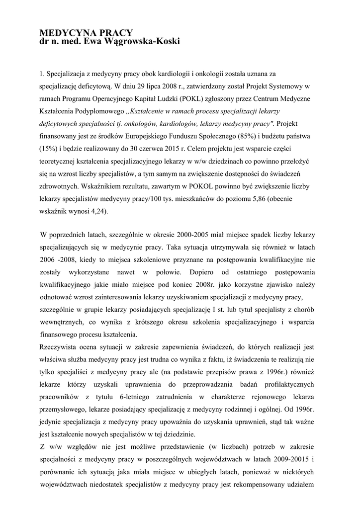 MEDYCYNA PRACY dr n. med. Ewa Wągrowska-Koski 1. Specjalizacja z medycyny pracy obok kardiologii i onkologii została uznana za specjalizację deficytową. W dniu 29 lipca 2008 r., zatwierdzony został Projekt Systemowy w ramach Programu Operacyjnego Kapitał Ludzki (POKL) zgłoszony przez Centrum Medyczne Kształcenia Podyplomowego „Kształcenie w ramach procesu specjalizacji lekarzy deficytowych specjalności tj. onkologów, kardiologów, lekarzy medycyny pracy". Projekt finansowany jest ze środków Europejskiego Funduszu Społecznego (85%) i budżetu państwa (15%) i będzie realizowany do 30 czerwca 2015 r. Celem projektu jest wsparcie części teoretycznej kształcenia specjalizacyjnego lekarzy w w/w dziedzinach co powinno przełożyć się na wzrost liczby specjalistów, a tym samym na zwiększenie dostępności do świadczeń zdrowotnych. Wskaźnikiem rezultatu, zawartym w POKOL powinno być zwiększenie liczby lekarzy specjalistów medycyny pracy/100 tys. mieszkańców do poziomu 5,86 (obecnie wskaźnik wynosi 4,24). W poprzednich latach, szczególnie w okresie 2000-2005 miał miejsce spadek liczby lekarzy specjalizujących się w medycynie pracy. Taka sytuacja utrzymywała się również w latach 2006 -2008, kiedy to miejsca szkoleniowe przyznane na postępowania kwalifikacyjne nie zostały wykorzystane nawet w połowie. Dopiero od ostatniego postępowania kwalifikacyjnego jakie miało miejsce pod koniec 2008r. jako korzystne zjawisko należy odnotować wzrost zainteresowania lekarzy uzyskiwaniem specjalizacji z medycyny pracy, szczególnie w grupie lekarzy posiadających specjalizację I st. lub tytuł specjalisty z chorób wewnętrznych, co wynika z krótszego okresu szkolenia specjalizacyjnego i wsparcia finansowego procesu kształcenia. Rzeczywista ocena sytuacji w zakresie zapewnienia świadczeń, do których realizacji jest właściwa służba medycyny pracy jest trudna co wynika z faktu, iż świadczenia te realizują nie tylko specjaliści z medycyny pracy ale (na podstawie przepisów prawa z 1996r.) również lekarze którzy uzyskali uprawnienia do przeprowadzania badań profilaktycznych pracowników z tytułu 6-letniego zatrudnienia w charakterze rejonowego lekarza przemysłowego, lekarze posiadający specjalizację z medycyny rodzinnej i ogólnej. Od 1996r. jedynie specjalizacja z medycyny pracy upoważnia do uzyskania uprawnień, stąd tak ważne jest kształcenie nowych specjalistów w tej dziedzinie. Z w/w względów nie jest możliwe przedstawienie (w liczbach) potrzeb w zakresie specjalności z medycyny pracy w poszczególnych województwach w latach 2009-20015 i porównanie ich sytuacją jaka miała miejsce w ubiegłych latach, ponieważ w niektórych województwach niedostatek specjalistów z medycyny pracy jest rekompensowany udziałem lekarzy o innych w/w kwalifikacjach. Ze sprawozdań konsultantów wojewódzkich wynika, że dobra sytuacja kadrowa ma miejsce w województwach: Dolnośląskim, Śląskim, Kujawsko-Pomorskim, Mazowieckim, Łódzkim, Wielkopolskim, Lubuskim, Świętokrzyskim. Jednakże nawet w tych województwach większość lekarzy praktykuje w miastach wojewódzkich, (lub byłych miastach wojewódzkich), natomiast znaczne niedobory kadrowe występują poza dużymi ośrodkami gdzie zadania służby medycyny pracy realizują lekarze, którzy często w odległej przeszłości uzyskali I st. specjalizacji z medycyny pracy. Najgorsza sytuacja ma miejsce w woj. Opolskim, Podlaskim i Warmińsko-Mazurskim. Dostępne dane o liczbie lekarzy medycyny pracy w Polsce są rozbieżne: Przyczyną takiej sytuacji może być obowiązujące w poprzednich latach różne nazewnictwo specjalizacji. Początkowo w okresie dwustopniowej specjalizacji lekarzami medycyny pracy określano lekarzy posiadających I°specjalizacji, a posiadających II0 specjalizacji - lekarzami specjalistami medycyny przemysłowej. W późniejszych latach, ale jeszcze w okresie dwustopniowych specjalizacji lekarzy z 1° specjalizacji nazywano lekarzami medycyny pracy, a lekarzami specjalistami tych, którzy posiadali 11° specjalizacji z medycyny pracy. Po zmianie systemu specjalizacji na jednostopniowy lekarze uzyskują tytuł specjalisty z medycyny pracy. Wg informacji przekazanych przez Centrum Medyczne Kształcenia Podyplomowego obecnie w kraju jest 1797 lekarzy specjalistów w zakresie medycyny pracy. Z danych Centralnego Rejestru Lekarzy (prowadzony przez NIL) wynika, że liczba lekarzy specjalistów w dziedzinie medycyny pracy wykonujących zawód wynosi 1607 osób. Należy podkreślić niekorzystny rozkład wiekowy lekarzy medycyny pracy, w większości województw ponad 50 % stanowią lekarze powyżej 50 roku życia. W tej sytuacji w najbliższych latach można spodziewać się pogorszenia dostępności do świadczeń i realizacji zadań do jakich została powołana służba medycyny pracy. Tabela : Struktura wieku lekarzy realizujących zadania smp. na podstawie danych przekazanych przez konsultantów wojewódzkich. L.p Województwo Średnia wieku 1 Dolnośląskie brak danych 2 Kuj.-Pomorskie 15% lekarze w wieku do 40 r.ż 25% lekarze w wieku 51-60 r.ż. 35% lekarze >60 r.ż. 3 Lubelskie 66 lat 4 Lubuskie brak danych 5 Łódzkie 58 lat 6 Małopolskie 44%> lekarze >60 r.ż. 7 Mazowieckie 56 lat 8 Opolskie 57 9 Podkarpackie 10 Podlaskie 11 Pomorskie 57 lat, specjalistów I i II stopnia 55 lat pozostałych lekarzy realizujących zadania smp. 21,% lekarze do 50 r.ż. 42,% lekarze w wieku 51-65 r.ż. 37,% lekarze w wieku >60 r.ż 55 (w jednym z powiatów 64) 12 Śląskie 13 Świętokrzyskie 14 Warm.-Mazurskie 15 Wielkopolskie 16 Zach.-Pomorskie 57 lat, specjalistów I stopnia 56 lat specjalistów II stopnia 42 lata lekarzy specjalizujących się 4,5,% lekarze do 40 r.ż. 63,5,% lekarze w wieku 40-60 r.ż. 32,% lekarze w wieku >60 r.ż 57 lat Przeważająca liczba lekarzy w wieku okołoemerytalnym 58 lat 2. Szkolenie specjalizacyjne w dziedzinie medycyny pracy realizowane jest w 25 j