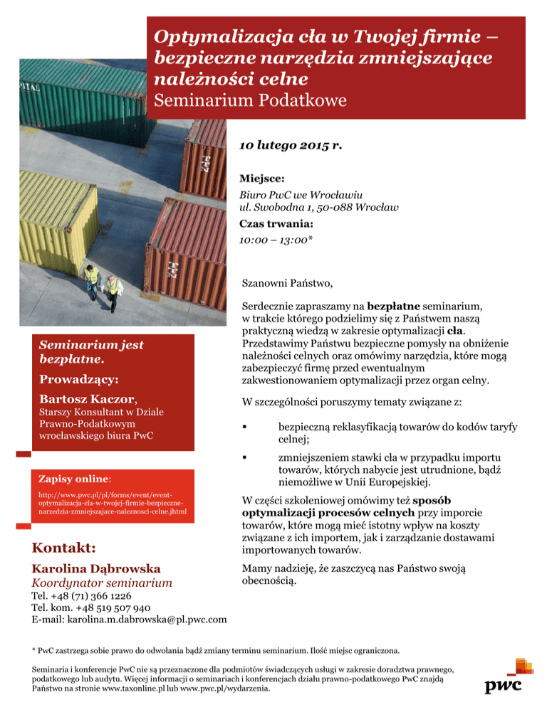 Optymalizacja cła w Twojej firmie – bezpieczne narzędzia zmniejszające należności celne Seminarium Podatkowe 10 lutego 2015 r. Miejsce: Biuro PwC we Wrocławiu ul. Swobodna 1, 50-088 Wrocław Czas trwania: 10:00 – 13:00* Szanowni Państwo, Prowadzący: Serdecznie zapraszamy na bezpłatne seminarium, w trakcie którego podzielimy się z Państwem naszą praktyczną wiedzą w zakresie optymalizacji cła. Przedstawimy Państwu bezpieczne pomysły na obniżenie należności celnych oraz omówimy narzędzia, które mogą zabezpieczyć firmę przed ewentualnym zakwestionowaniem optymalizacji przez organ celny. Bartosz Kaczor, W szczególności poruszymy tematy związane z: Seminarium jest bezpłatne. Starszy Konsultant w Dziale Prawno-Podatkowym wrocławskiego biura PwC Zapisy online: http://www.pwc.pl/pl/forms/event/eventoptymalizacja-cla-w-twojej-firmie-bezpiecznenarzedzia-zmniejszajace-naleznosci-celne.jhtml bezpieczną reklasyfikacją towarów do kodów taryfy celnej; zmniejszeniem stawki cła w przypadku importu towarów, których nabycie jest utrudnione, bądź niemożliwe w Unii Europejskiej. Kontakt: W części szkoleniowej omówimy też sposób optymalizacji procesów celnych przy imporcie towarów, które mogą mieć istotny wpływ na koszty związane z ich importem, jak i zarządzanie dostawami importowanych towarów. Karolina Dąbrowska Koordynator seminarium Mamy nadzieję, że zaszczycą nas Państwo swoją obecnością. Tel. +48 (71) 366 1226 Tel. kom. +48 519 507 940 E-mail: [email protected] * PwC zastrzega sobie prawo do odwołania bądź zmiany terminu seminarium. Ilość miejsc ograniczona. Seminaria i konferencje PwC nie są przeznaczone dla podmiotów świadczących usługi w zakresie doradztwa prawnego, podatkowego lub audytu. Więcej informacji o seminariach i konferencjach działu prawno-podatkowego PwC znajdą Państwo na stronie www.taxonline.pl lub www.pwc.pl/wydarzenia.