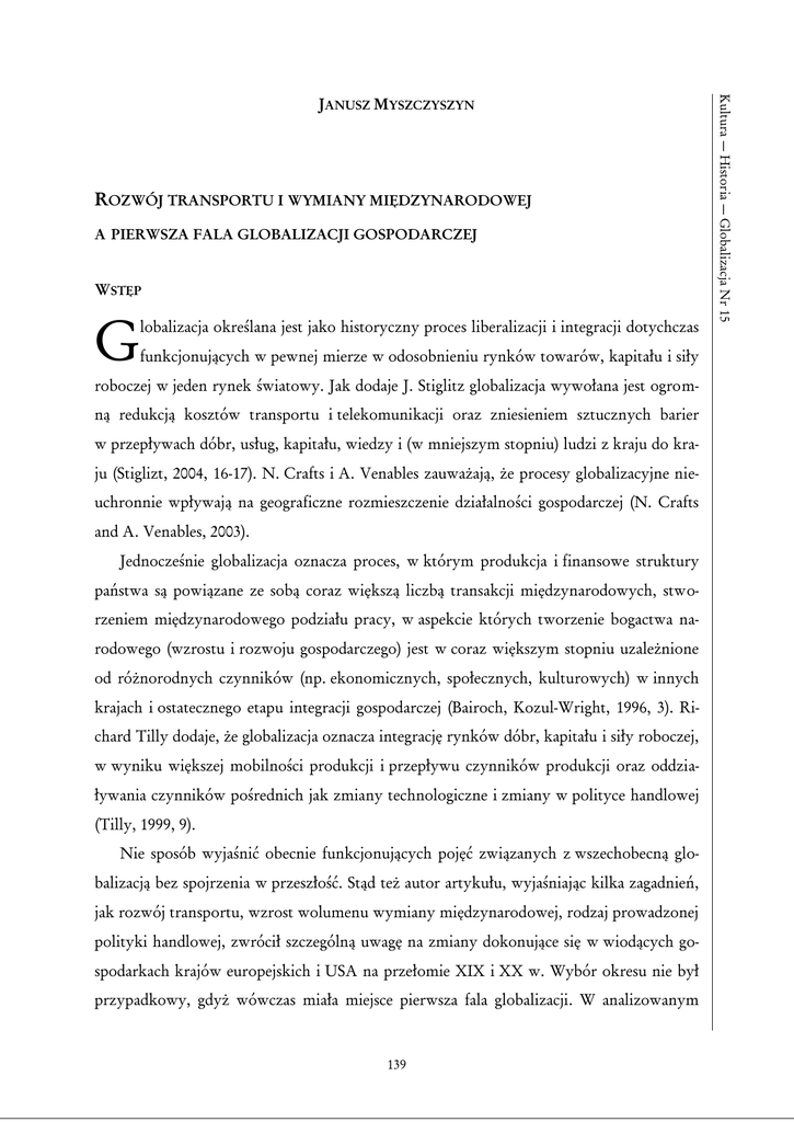 ROZWÓJ TRANSPORTU I WYMIANY MIĘDZYNARODOWEJ A PIERWSZA FALA GLOBALIZACJI GOSPODARCZEJ WSTĘP G lobalizacja określana jest jako historyczny proces liberalizacji i integracji dotychczas funkcjonujących w pewnej mierze w odosobnieniu rynków towarów, kapitału i siły roboczej w jeden rynek światowy. Jak dodaje J. Stiglitz globalizacja wywołana jest ogromną redukcją kosztów transportu i telekomunikacji oraz zniesieniem sztucznych barier w przepływach dóbr, usług, kapitału, wiedzy i (w mniejszym stopniu) ludzi z kraju do kraju (Stiglizt, 2004, 16-17). N. Crafts i A. Venables zauważają, że procesy globalizacyjne nieuchronnie wpływają na geograficzne rozmieszczenie działalności gospodarczej (N. Crafts and A. Venables, 2003). Jednocześnie globalizacja oznacza proces, w którym produkcja i finansowe struktury państwa są powiązane ze sobą coraz większą liczbą transakcji międzynarodowych, stworzeniem międzynarodowego podziału pracy, w aspekcie których tworzenie bogactwa narodowego (wzrostu i rozwoju gospodarczego) jest w coraz większym stopniu uzależnione od różnorodnych czynników (np. ekonomicznych, społecznych, kulturowych) w innych krajach i ostatecznego etapu integracji gospodarczej (Bairoch, Kozul-Wright, 1996, 3). Richard Tilly dodaje, że globalizacja oznacza integrację rynków dóbr, kapitału i siły roboczej, w wyniku większej mobilności produkcji i przepływu czynników produkcji oraz oddziaływania czynników pośrednich jak zmiany technologiczne i zmiany w polityce handlowej (Tilly, 1999, 9). Nie sposób wyjaśnić obecnie funkcjonujących pojęć związanych z wszechobecną globalizacją bez spojrzenia w przeszłość. Stąd też autor artykułu, wyjaśniając kilka zagadnień, jak rozwój transportu, wzrost wolumenu wymiany międzynarodowej, rodzaj prowadzonej polityki handlowej, zwrócił szczególną uwagę na zmiany dokonujące się w wiodących gospodarkach krajów europejskich i USA na przełomie XIX i XX w. Wybór okresu nie był przypadkowy, gdyż wówczas miała miejsce pierwsza fala globalizacji. W analizowanym 139 Kultura — Historia — Globalizacja Nr 15 JANUSZ MYSZCZYSZYN Janusz Myszczyszyn, Rozwój transportu i wymiany międzynarodowej… okresie występowały powszechnie akceptowane cechy globalizacji, jak: integracja gospodarcza, współzależności międzynarodowe, zależność od postępu w nauce, technice, organizacji, kompresja czasu i przestrzeni, prowadzenie polityki inwestycyjnej przez sektor publiczny, itd. (Por. Frankel, 2000, 45-46, Myszczyszyn, 2013, 155-156). Głównym celem artykułu pozostaje ukazanie wpływu zmian politycznych i technologicznych (w tym rozwoju transportu) na integrację gospodarczą w warunkach XIX i początkach XX wieku. TANI TRANSPORT MOTOREM NAPĘDOWYM ROZWOJU WYMIANY MIĘDZYNARODOWEJ Brak szybkiego, taniego i pewnego transportu stanowił główną przeszkodę w procesie industrializacji i integracji gospodarczej Europy i Stanów Zjednoczonych, dostrzeganą szczególnie w pierwszej połowie XIX w. Równie ważną barierą pozostawała restrykcyjna polityka celna. Ze względu na ograniczone możliwości wykorzystania naturalnych dróg wodnych oraz relatywnie drogi transport lądowy, przewóz towarów wytwarzanych przez przemysłowców uniemożliwiał rozwinięcie masowej produkcji i wykorzystanie korzyści skali produkcji (ekonomii skali). Produkcja często ograniczała się do rynków lokalnych, a tym samym pozbawiona była cech globalnych. Jak zauważa Patrick O’Brien europejskiemu wzrostowi gospodarczemu, który znacznie przyspieszył w drugiej połowie XVIII w. towarzyszyła ekspansja podaży usług transportowych. Popyt na usługi transportowe wzrastał, kiedy przemysłowcy i rolnicy (farmerzy) próbowali zakupić czynniki wytwórcze (surowce, narzędzia, maszyny), niezbędne w procesie produkcji z coraz większych odległości, oraz sprzedać swoje produkty na rynkach oddalonych od miejsca wytworzenia (O’Brien, 1983, 1). Wzrastała produkcja towarów, a efekty specjalizacji, szczególnie zauważalne w latach 1789–1914 prowadziły do wzmożenia obrotów handlowych pomiędzy firmami, farmerami i przemysłem. We wczesnym etapie rozwoju gospodarek europejskich produkcja wielu dóbr skoncentrowana była w określonych regionach. W tym samym czasie kolejne innowacje prowadziły do wzrostu efektywności usług transportowych oferowanych w Europie, a tym samym spadku cen czynników wytwórczych w rolnictwie, przemyśle, rzemieślnictwie. Innowacje, które dotyczyły transportu, a do których zaliczyć można: utwardzanie dróg, rozwój dróg wodnych i kolejowych, a przede wszystkim zastosowanie siły pary i ograniczenie roli wiatru, wody, siły rąk ludz140 i amerykański. Innowacje w transporcie oznaczały szybszą, tańszą i pewniejszą dostawę towarów i surowców. Nowe środki transportu zapewniały także szybsze przemieszczanie się ludzi i szybszą dyfuzję wiedzy. Rolę szczególną w tym zakresie odegrała rozbudowa szlaków kolejowych. Od początków rozbudowy transportu kolejowego w Anglii w 1826 r. do 1913 r. na świecie przybyło niemal milion kilometrów torów kolejowych. Prawie połowa z nich była w Stanach Zjednoczonych, kolejne 30% w Europie. Rozbudowa kolei, postrzegana jako ogromna i kosztowna inwestycja umożliwiła rozwój obszarów, dotąd oddalonych od rynków zbytu (np. pola uprawne USA, Argentyny), zwiększyła efektywną wielkość rynków, zakres wewnętrznych migracji i urbanizacji, przyczyniła się do zmiany ekonomii lokalizacji przemysłu, a także miała wpływ na zwiększenie możliwości międzynarodowej specjalizacji. Dodać należy, że gęsta sieć kolejowa oznaczała znaczny spadek kosztów transportu surowców rolnych w poszczególnych regionach; dla przykładu różnica cen pszenicy dla Iowa i Nowego Jorku spadła w latach 1870-1910 z 69% do 19%, dla Wisconsin i Nowego Jorku z 52% do 10%. Podobne skutki rozbudowy kolei zanotowano w innych regio