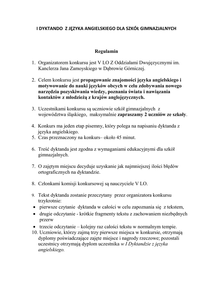 I DYKTANDO Z JĘZYKA ANGIELSKIEGO DLA SZKÓŁ GIMNAZJALNYCH Regulamin 1. Organizatorem konkursu jest V LO Z Oddziałami Dwujęzycznymi im. Kanclerza Jana Zamoyskiego w Dąbrowie Górniczej. 2. Celem konkursu jest propagowanie znajomości języka angielskiego i motywowanie do nauki języków obcych w celu zdobywania nowego narzędzia pozyskiwania wiedzy, poznania świata i nawiązania kontaktów z młodzieżą z krajów anglojęzycznych. 3. Uczestnikami konkursu są uczniowie szkół gimnazjalnych z województwa śląskiego, maksymalnie zapraszamy 2 uczniów ze szkoły. 4. Konkurs ma jeden etap pisemny, który polega na napisaniu dyktanda z języka angielskiego. 5. Czas przeznaczony na konkurs– około 45 minut. 6. Treść dyktanda jest zgodna z wymaganiami edukacyjnymi dla szkół gimnazjalnych. 7. O zajętym miejscu decyduje uzyskanie jak najmniejszej ilości błędów ortograficznych na dyktandzie. 8. Członkami komisji konkursowej są nauczyciele V LO. 9. Tekst dyktanda zostanie przeczytany przez organizatora konkursu trzykrotnie: pierwsze czytanie dyktanda w całości w celu zapoznania się z tekstem, drugie odczytanie - krótkie fragmenty tekstu z zachowaniem niezbędnych przerw trzecie odczytanie – kolejny raz całości tekstu w normalnym tempie. 10. Uczniowie, którzy zajmą trzy pierwsze miejsca w konkursie, otrzymają dyplomy poświadczające zajęte miejsce i nagrody rzeczowe; pozostali uczestnicy otrzymają dyplom uczestnika w I Dyktandzie z języka angielskiego.