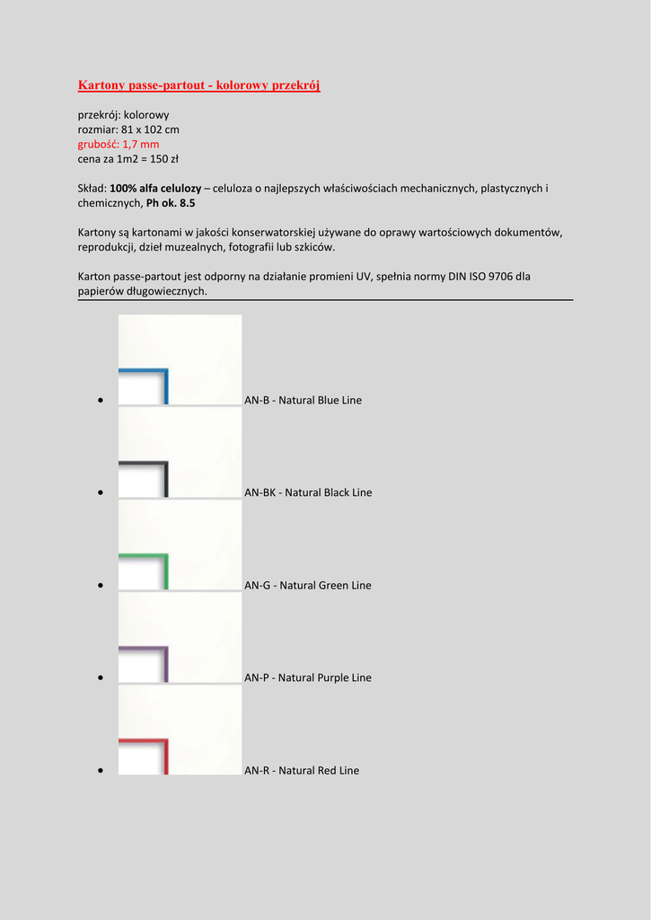 Kartony passe-partout - kolorowy przekrój przekrój: kolorowy rozmiar: 81 x 102 cm grubość: 1,7 mm cena za 1m2 = 150 zł Skład: 100% alfa celulozy – celuloza o najlepszych właściwościach mechanicznych, plastycznych i chemicznych, Ph ok. 8.5 Kartony są kartonami w jakości konserwatorskiej używane do oprawy wartościowych dokumentów, reprodukcji, dzieł muzealnych, fotografii lub szkiców. Karton passe-partout jest odporny na działanie promieni UV, spełnia normy DIN ISO 9706 dla papierów długowiecznych. AN-B - Natural Blue Line AN-BK - Natural Black Line AN-G - Natural Green Line AN-P - Natural Purple Line AN-R - Natural Red Line AN-Y - Natural Yellow Line BR14987 - White on Blue BR54987 - White on Orange BR34987 - White on Red BR44987 - White on Yellow BR64987 - White on Purple BR14921 - Black on Blue BR24921 - Black on Green BR34921 - Black on Red BR44921 - Black on Yellow BR54921 - Black on Orange BR64921 - Black on Purple