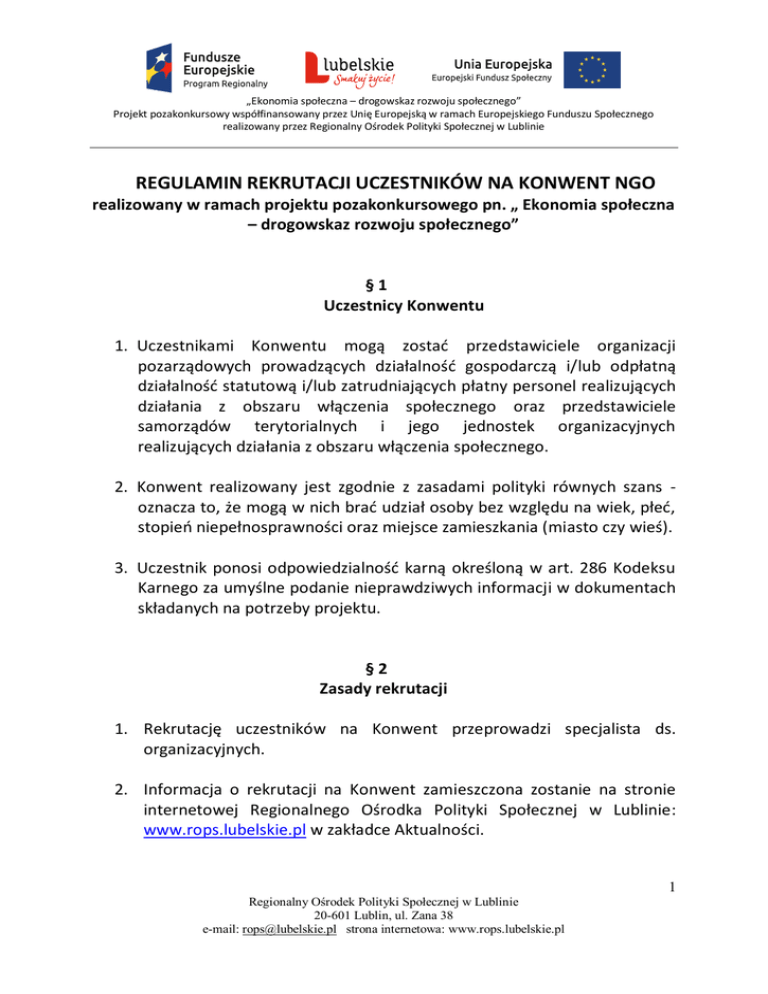 „Ekonomia społeczna – drogowskaz rozwoju społecznego” Projekt pozakonkursowy współfinansowany przez Unię Europejską w ramach Europejskiego Funduszu Społecznego realizowany przez Regionalny Ośrodek Polityki Społecznej w Lublinie REGULAMIN REKRUTACJI UCZESTNIKÓW NA KONWENT NGO realizowany w ramach projektu pozakonkursowego pn. „ Ekonomia społeczna – drogowskaz rozwoju społecznego” §1 Uczestnicy Konwentu 1. Uczestnikami Konwentu mogą zostad przedstawiciele organizacji pozarządowych prowadzących działalnośd gospodarczą i/lub odpłatną działalnośd statutową i/lub zatrudniających płatny personel realizujących działania z obszaru włączenia społecznego oraz przedstawiciele samorządów terytorialnych i jego jednostek organizacyjnych realizujących działania z obszaru włączenia społecznego. 2. Konwent realizowany jest zgodnie z zasadami polityki równych szans oznacza to, że mogą w nich brad udział osoby bez względu na wiek, płed, stopieo niepełnosprawności oraz miejsce zamieszkania (miasto czy wieś). 3. Uczestnik ponosi odpowiedzialnośd karną określoną w art. 286 Kodeksu Karnego za umyślne podanie nieprawdziwych informacji w dokumentach składanych na potrzeby projektu. §2 Zasady rekrutacji 1. Rekrutację uczestników na Konwent przeprowadzi specjalista ds. organizacyjnych. 2. Informacja o rekrutacji na Konwent zamieszczona zostanie na stronie internetowej Regionalnego Ośrodka Polityki Społecznej w Lublinie: www.rops.lubelskie.pl w zakładce Aktualności. 1 Regionalny Ośrodek Polityki Społecznej w Lublinie 20-601 Lublin, ul. Zana 38 e-mail: [email protected] strona internetowa: www.rops.lubelskie.pl „Ekonomia społeczna – drogowskaz rozwoju społecznego” Projekt pozakonkursowy współfinansowany przez Unię Europejską w ramach Europejskiego Funduszu Społecznego realizowany przez Regionalny Ośrodek Polityki Społecznej w Lublinie 3. Osoby zainteresowane udziałem w Konwencie , spełniające podstawowy warunek uczestnictwa wymieniony w § 1 pkt 1 niniejszego regulaminu, zobowiązane są wypełnid i przesład: pocztą, faksem, e-mailem (w formie skanu) lub dostarczyd osobiście właściwą kartę zgłoszeniową na adres Regionalnego Ośrodka Polityki Społecznej w Lublinie. 4. Na początku rekrutacji przyjmowane będą po dwie osoby z instytucji. Natomiast wolne miejsca zostaną rozdysponowane zgodnie z kolejnością zgłoszeo. 5. Przyjmowane będą jedynie kompletne, poprawnie wypełnione karty zgłoszeniowe. 6. Zgłoszenia na listę podstawową będą przyjmowane do dnia ustalonego przez osobę prowadzącą rekrutację, który zawarty zostanie w informacji dotyczącej Konwentu umieszczonej na stronie internetowej ROPS w Lublinie. Zgłoszenia, które wpłyną po tym terminie, będą rejestrowane na liście rezerwowej. 7. W przypadku wyczerpania liczby wolnych miejsc przed dniem zakooczenia procesu rekrutacji zgłoszenia będą rejestrowane na liście rezerwowej. 8. O zakwalifikowaniu się na Konwent decyduje kolejnośd zgłoszeo oraz spełnianie kryteriów kwalifikacyjnych. 9. Lista osób zakwalifikowanych do udziału w Konwencie zostanie zamknięta na 5 dni przed rozpoczęciem Konwentu. 10. Kandydaci zostaną poinformowani o zakwalifikowaniu się na Konwent telefonicznie i/lub drogą elektroniczną. 11. Osoby zakwalifikowane na Konwent zobowiązane są dostarczyd oryginał karty zgłoszeniowej do siedziby Regionalnego Ośrodka Polityki Społecznej w Lublinie. 2 Regionalny Ośrodek Polityki Społecznej w Lublinie 20-601 Lublin, ul. Zana 38 e-mail: [email protected] strona internetowa: www.rops.lubelskie.pl „Ekonomia społeczna – drogowskaz rozwoju społecznego” Projekt pozakonkursowy współfinansowany przez Unię Europejską w ramach Europejskiego Funduszu Społecznego realizowany przez Regionalny Ośrodek Polityki Społecznej w Lublinie 12. Rezygnacja uczestnika Konwentu następuje przez złożenie pisemnego oświadczenia o rezygnacji z udziału w Konwencie wraz z uzasadnieniem. Kandydat zobowiązany jest do złożenia w/w rezygnacji nie później niż 3 dni przed jego rozpoczęciem. Jeżeli rezygnacja nastąpi w krótszym terminie, podmiot zobowiązany jest do oddelegowania innego przedstawiciela spełniającego kryteria określone w regulaminie rekrutacji na dane szkolenie. Podpisaną rezygnację wraz z uzasadnieniem należy dostarczyd faksem, a następnie oryginał przesład pocztą na adres Regionalnego Ośrodka Polityki Społecznej w Lublinie. §3 Zasady udziału w Konwentu i obowiązki uczestnika 1. Każdy uczestnik Konwentu otrzyma bezpłatnie pełne wyżywienie oraz nocleg w trakcie Konwentu. 2. Każdy uczestnik ma obowiązek: a) Potwierdzenia obecności na Konwencie własnoręcznym podpisem na liście obecności; b) Potwierdzenia odbioru posiłków, notesu i długopisu; c) Wypełnienia niezbędnych dokumentów związanych z uczestnictwem w Konwencie. §4 Dokumenty zgłoszeniowe 1. Zgłoszenia przyjmowane będą wyłącznie na karcie zgłoszeniowej, opatrzonej oficjalnym logiem promocyjnym województwa lubelskiego, flagą Unii Europejskiej z odwołaniem do Unii Europejskiej i Europejskiego Funduszu Społecznego wraz z nazwą projektu i informacją o współfinansowaniu. 2. Karta zgłoszeniowa dostępna jest na stronie internetowej Regionalnego Ośrodka Polityki Społecznej w Lublinie. 3 Regionalny Ośrodek Polityki Społecznej w Lublinie 20-601 Lublin, ul. Zana 38 e-mail: [email protected] strona internetowa: www.rops.lubelskie.pl „Ekonomia społeczna – drogowskaz rozwoju społecznego” Projekt pozakonkursowy współfinansowany przez Unię Europejską w ramach Europejskiego Funduszu Społecznego realizowany przez Regionalny Ośrodek Polityki Społecznej w Lublinie 3. Poprawnie wypełniona karta powinna zawierad wszystkie wymagane dane oraz powinna byd opatrzona datą jej wypełnienia, pieczęcią podmiotu kierującego i czytelnym podpisem osoby delegującej uczestnika na Konwent oraz własnoręcznym czyte