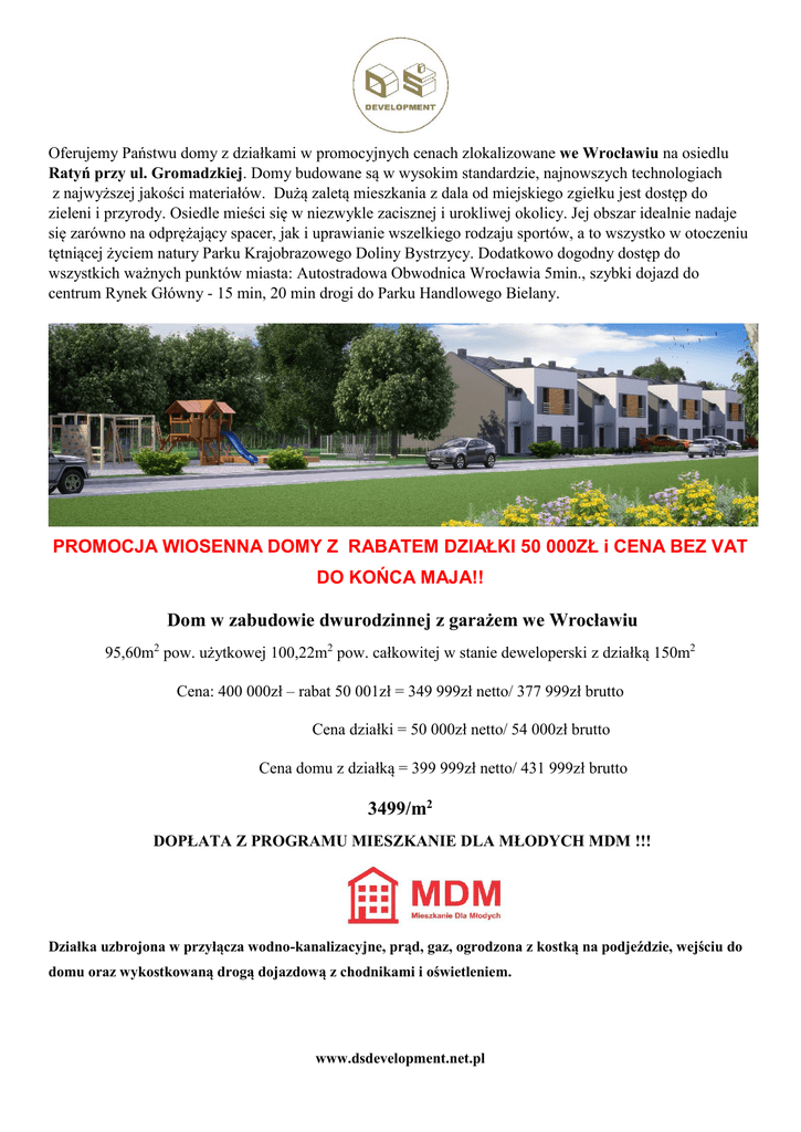 Oferujemy Państwu domy z działkami w promocyjnych cenach zlokalizowane we Wrocławiu na osiedlu Ratyń przy ul. Gromadzkiej. Domy budowane są w wysokim standardzie, najnowszych technologiach z najwyższej jakości materiałów. Dużą zaletą mieszkania z dala od miejskiego zgiełku jest dostęp do zieleni i przyrody. Osiedle mieści się w niezwykle zacisznej i urokliwej okolicy. Jej obszar idealnie nadaje się zarówno na odprężający spacer, jak i uprawianie wszelkiego rodzaju sportów, a to wszystko w otoczeniu tętniącej życiem natury Parku Krajobrazowego Doliny Bystrzycy. Dodatkowo dogodny dostęp do wszystkich ważnych punktów miasta: Autostradowa Obwodnica Wrocławia 5min., szybki dojazd do centrum Rynek Główny - 15 min, 20 min drogi do Parku Handlowego Bielany. PROMOCJA WIOSENNA DOMY Z RABATEM DZIAŁKI 50 000ZŁ i CENA BEZ VAT DO KOŃCA MAJA!! Dom w zabudowie dwurodzinnej z garażem we Wrocławiu 95,60m2 pow. użytkowej 100,22m2 pow. całkowitej w stanie deweloperski z działką 150m2 Cena: 400 000zł – rabat 50 001zł = 349 999zł netto/ 377 999zł brutto Cena działki = 50 000zł netto/ 54 000zł brutto Cena domu z działką = 399 999zł netto/ 431 999zł brutto 3499/m2 DOPŁATA Z PROGRAMU MIESZKANIE DLA MŁODYCH MDM !!! Działka uzbrojona w przyłącza wodno-kanalizacyjne, prąd, gaz, ogrodzona z kostką na podjeździe, wejściu do domu oraz wykostkowaną drogą dojazdową z chodnikami i oświetleniem. www.dsdevelopment.net.pl I Standard wykończenia: Cena w promocji bez działki 349 999zł netto/ 377 999zł brutto + działka 50 000zł netto/54 000zł brutto ławy fundamentowe zbrojony stalą - beton B20 ściany fundamentowe bloczki betonowe M6+ styropian (gr 5cm) instalacja kominowa- przewód kominowy z rurą ceramiczną i trójnikiem gotowym do podłączenia wkładu kominowego wraz z zew. czerpią powierza ściany konstrukcyjne zewnętrzne pustak ceramiczny gr.24cm + styropian (gr 15cm) konstrukcja dachu – dachówka ceramiczna kolor antracyt stolarka okienna PCV Veka w okleinach kolor antracyt z zewnątrz rolety zewnętrzne nadstawne w kolorze antracyt (ocieplane) drzwi wejściowe zewnętrzne Setto Diego w okleinie antracyt (ocieplane) brama garażowa Hormann w kolorze antracyt podnoszona ręcznie elewacja zewnętrzna sylikonowo – sylikatowa parapety zewnętrzne z blachy powlekanej kolor stolarki okiennej PCV przyłącza elektryczne doprowadzone do budynku przyłącza wodno-kanalizacyjne doprowadzone do budynku wylana pierwsza posadzka z wyprowadzonymi przyłączami wodno – kanalizacyjnymi ściany konstrukcyjne wewnętrzne strop betonowy gęsto żebrowy TERIVA instalacja elektryczna (bez włączników i lamp) instalacje grzewcze i wodnokanalizacyjne bez grzejników i pieca gazowego ścianki wewnętrzne zgodnie z projektem okna dachowe Fakro zgodnie z projektem schody betonowe tynki wewnętrzne gipsowe nakładane mechanicznie zacierane na mokro niemalowane parapety wewnętrzne MDF posadzka końcowa z ociepleniem ocieplenie dachówki wełna mineralna 25cm i zamknięcie płytą STG II standard wykończenia stan deweloperski Plus - dopłata 10 000zł netto/10 800zł brutto instalacja wodna i grzewcza z piecem gazowym kondensacyjnym Buderus i grzejnikami oraz ogrzewaniem podłogowym w łazienkach i wiatrołapie instalacja gazowa z podłączeniem i uruchomieniem pieca III standard wykończenia - dopłata 10 000zł netto/10 800zł brutto okna z pakietem trzyszybowym VEKA o współczynniku przenikania ciepła Ug=0,6 drzwi tarasowe Patio z mechanizmem otwierania uchylno-przesuwanym rolety okienne z napędem elektrycznym wyposażonym w silniki przeciążeniowe SOMFY i haki antywłamaniowe silnik elektryczny do bramy garażowej z dwoma pilotami zagospodarowanie poddasza podłogi płytą OSB(2,5cm) oraz schody strychowe Fakro taras z kostki betonowej dodatkowe przyłącze wody ogrodowej opaska wokół budynku z kostki brukowej rozprowadzenie wody deszczowej z rynien za pomocą systemu drenów Dodatkowo w gratisie po wpłaceniu całej kwoty za stan deweloperski: ogrodzenie zgodnie ze standardem przyjętym na osiedlu 2000zł netto kostka na podjeździe do garażu i wejściu do domu zgodnie ze standardem przyjętym na osiedlu 2000zł netto, studnie do wody deszczowej 2szt.5900zł, wykostkowana osiedlowa droga dojazdowa z chodnikami i oświetleniem. *Możliwość wykończenia domu pod klucz do indywidualnego ustalenia Warunki płatności: * 10 000zł wpłata przy podpisaniu umowy rezerwacyjnej * płatność po wybudowaniu stanu zerowego budynku * płatność po wybudowaniu ścian parteru budynku * płatność po wybudowaniu stropu i wybudowaniu ścian poddasza budynku * płatność po położeniu dachówki * płatność po zakończeniu elewacji zewnętrznej budynku NUMER KONTA Bank Spółdzielczy we Wschowie: 51 8669 0001 2022 0221 2519 0001 Płatność poszczególnych rat w terminie 14 dni po otrzymaniu informacji i wizycie sprawdzającej wykonanie danego etapu. *Możliwość negocjacji oferty przy zakupie gotówkowym (płatnym jednorazowo) po podpisaniu umowy przedwstępnej. *Powyższy opis ma charakter informacyjny i nie stanowi oferty w rozumieniu Kodeku Cywilnego Art. 66. § 1. www.dsdevelopment.net.pl www.dsdevelopment.net.pl www.dsdevelopment.net.pl Firma DŚ Development, jest powiązana kapitałowo z firmą Śmigielski Group, która działa na rynku od 20 lat. Już ponad 200 rodzin zaufało naszej firmie i zamieszkało w budowanych przez nas domach znajdując w nich swój zaciszny kąt. Wychodzimy naprzeciw oczekiwaniom klientów, budujemy osiedle w wysokim standardzie, z pełną infrastrukturą oraz z wykorzystaniem najnowszych materiałów budowlanych. Firma zapewnia również wysokiej jakości fachowców z wieloletnim doświadczeniem oraz pełną kompleksową obsługę kredytową związaną z zakupem nowego domu (lokalu mieszkalnego), jak również kompleksową obsługę przy sprzedaży aktualnej nieruchomości (np. mieszkania). Szeroka oferta nowo powstającyc