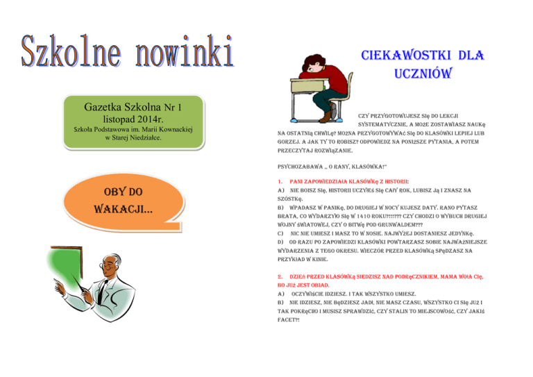 CIEKAWOSTKI DLA UCZNIÓW Gazetka Szkolna Nr 1 Czy przygotowujesz się do lekcji listopad 2014r. Szkoła Podstawowa im. Marii Kownackiej w Starej Niedziałce. systematycznie, a może zostawiasz naukę na ostatnią chwilę? Można przygotowywać się do klasówki lepiej lub gorzej. A jak ty to robisz? Odpowiedz na poniższe pytania, a potem przeczytaj rozwiązanie. PSYCHOZABAWA ,, O RANY, KLASÓWKA!” 1. Pani zapowiedziała klasówkę z historii: Oby do a) Nie boisz się, historii uczyłeś się cały rok, lubisz ją i znasz na WAKACji… b) szóstkę. Wpadasz w panikę, do drugiej w nocy kujesz daty. Rano pytasz brata, co wydarzyło się w 1410 roku?!!!??? Czy chodzi o wybuch drugiej wojny światowej, czy o bitwę pod Grunwaldem??? c) Nic nie umiesz i masz to w nosie. Najwyżej dostaniesz jedynkę. d) Od razu po zapowiedzi klasówki powtarzasz sobie najważniejsze wydarzenia z tego okresu. Wieczór przed klasówką spędzasz na przykład w kinie. 2. Dzień przed klasówką siedzisz nad podręcznikiem, mama woła cię, bo już jest obiad. a) b) Oczywiście idziesz. I tak wszystko umiesz. Nie idziesz, nie będziesz jadł, nie masz czasu, wszystko ci się już i tak pokręciło i musisz sprawdzić, czy Stalin to miejscowość, czy jakiś facet?! c) Oczywiście, idziesz. I tak nie czytałe(-a)ś tego podręcznika, tylko d) Wychodzisz trochę wcześniej, chcesz jeszcze porozmawiać z myślałe(-a)ś o meczu. Beatą, która wszystko wie. Może ci powie, ile czasu trwało oblężenie d) Stalingradu? Oczywiście, idziesz. I tak już koniec nauki, należy odpocząć przed klasówką. 5. 3. Trzeba zapakować plecak. a) Robisz to zawsze wieczorem, wszystko w szufladach i na biurku a) Już piszesz klasówkę! Jak było do przewidzenia, jest to bułka z masłem. Szóstka murowana, wcale się nie denerwujesz. leży na swoim miejscu, więc nie masz z tym kłopotu. Zeszyt do klasówki b) i nowy, wypróbowany długopis przyszykowałe(-a)ś już wczoraj. Na Usiłujesz ściągać od kolegi, niestety on też siedzi nad pustą kartką. wszelki wypadek bierzesz ołówek i linijkę, może trzeba będzie zrobić Płakać ci się chce, ale piszesz, co wiesz, może chociaż będzie z tego jakiś wykres? trója z dwoma? b) c) Plecak pakujesz w ostatniej chwili, z rozpaczą szukasz zeszytu, O, rany, co za okropny temat! Coś tam wiesz, ale o wiele za mało. Strasznie nudny temat. Co to kogo obchodzi? Ale kiedyś widziałeś zapominasz o długopisie, pakujesz trzy niepotrzebne tego dnia taki film, opiszesz go, może jakoś przejdzie? A jak nie, to nie, jedna podręczniki, cały czas powtarzasz przy tym daty. Kiedy, na litość jedynka więCej, CZY mNiej … Boską, zaczęła się piąta wojna światowa???!! d) c) dostaniesz piątkę? Bierzesz plecak bez pakowania. I tak zawsze nosisz wszystko, a Fajny temat. Okazuje się, że wiesz więcej, niż myślałeś. Może jeśli czegoś nie ma, to Michał ci pożyczy. d) Plecak tym razem pakujesz wieczorem. Sprawdzasz, czy masz ROZWIĄZANIE – jeśli podkreślisz większość odpowiedzi A- jesteś zeszyt do klasówek i dobry długopis. Rano zaglądasz tam jeszcze takim ideałem, że aż trudno w to uwierzyć! Podkreśliłeś odpowiedzi B– raz. nie zostawiaj nauki na ostatnią chwilę. Czytaj coś, może chociaż gazety! Porozmawiaj z rodzicami, może ci pomogą, bo jesteś okropnie 4. a) Idziesz do szkoły. Tak, jak zwykle, będziesz pół godziny wcześniej. Nie śpieszysz się, nerwowy (a). To nie twoja wina, ale warto coś z tym zrobić. Może się za bardzo przejmujesz? Postaraj się uczyć regularnie i nie zarywaj przed wyjściem zjadasz dobre śniadanie. nocy przed egzaminami. Na pewno możesz dać sobie radę! Podkreśliłeś b) odpowiedzi C – nie wierzymy, żeby wszystko było ci tak obojętne. Może Wychodzisz trochę wcześniej, mimo to pędzisz jak do pożaru. Klasówka jest na trzeciej lekcji, ale może ją przełożyli, zresztą masz jakieś zmartwienie? Chyba wiesz, czy lubisz szkołę, czy nie. chcesz pogadać jeszcze z Beatą, może ona wie, kto w czasie drugiej Trzeba ją skończyć, a jeśli zostaniesz na drugi rok, to będziesz wojny światowej zwyciężył, Szwajcarzy czy Szwedzi?! chodził do niej o rok dłużej. c) Zakreśliłeś odpowiedzi D – i dobrze. Tak trzymać! Wychodzisz w ostatniej chwili, a nawet parę minut potem. Najwyżej się spóźnisz, wielkie rzeczy. SAVOIR-VIVRE DLA KAŻDEGO – KULTURA DNIA CODZIENNEGO UPRZEJMOŚĆ Obowiązuje nas zawsze wszędzie i wobec każdego. Zyskuje nam sympatię i poważanie w stosunkach międzyludzkich, znakomicie ułatwia nam życie. Świadczą o tym: trzy magiczne ŻYCZLIWOŚĆ Jest niezbędnym elementem w układaniu dobrych stosunków między ludźmi. Brak jej uwidocznia się niemal na każdym kroku. Życzliwość to bardzo dobra cecha człowieka, polega ona na wczuciu się w sytuację innych i chęć okazania pomocy. DYSKRECJA Człowiek dyskretny nie wnika w sprawy innych ludzi, gdy jednak zetknie się z nimi, wyczuje, czego nie należy widzieć lub słyszeć i powtarzać innym. JAK SIĘ PODAJE RĘKĘ ? słowa: proszę, dziękuję, przepraszam; Ten symboliczny gest może wyrażać szacunek, przywiązanie, łagodny ton tzn. zawsze rozmawiać łagodnym i ciepłym tonem; życzliwość, przyjaźń, dumę, uważne słuchanie – przypomina nam o tym stare arabskie obojętność, lekceważenie. przysłOWie „mAmY tYLKO jedNe uStA i dWOje uSZu”. Niekiedy kobieta podając mężczyźnie rękę podnosi ją zbyt wysoko, wskazując w ten sposób, że oczekuje ucałowania. Są i tacy mężczyźni, którzy nie całują kobiety w rękę. I jak w takiej sytuacji poczuje się Odzwierciedla on nastrój człowieka, jego stosunek do innych ludzi. kobieta ? A jak mężczyzna Uśmiech jednak uśmiechowi nie jest równy. Spotykamy się z uśmiechem ? Gdy nasi znajomi lub bezczelnym i fałszywym, ironicznym i obłudnym. Nie ułatwia on przyjaciele siedzą po drugiej stronie, np. stołu, nie wyciągamy ręki kontaktów