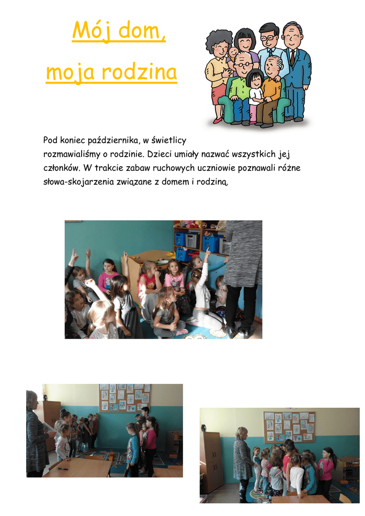 Mój dom, moja rodzina Pod koniec października, w świetlicy rozmawialiśmy o rodzinie. Dzieci umiały nazwać wszystkich jej członków. W trakcie zabaw ruchowych uczniowie poznawali różne słowa-skojarzenia związane z domem i rodziną. Dzieci z klas pierwszych układały puzzle z obrazka przedstawiającego rodzinę. Następnie mogły go pokolorować. Uczniowie z klasy trzeciej mieli trudniejsze zadanie. Musieli ułożyć zdania dotyczące oczywiście rodziny, z rozsypanek wyrazowych. Pod koniec zajęć wspólnie klasy młodsze i starsze budowały dom z papierowych cegiełek. Na cegiełkach zapisywaliśmy wyrazy-wartości związane ze słowami: „rodzina” i „dom”.