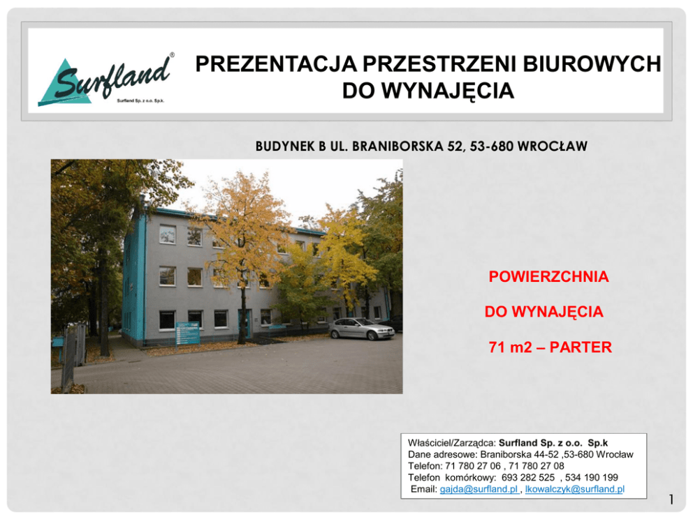 PREZENTACJA PRZESTRZENI BIUROWYCH DO WYNAJĘCIA BUDYNEK B UL. BRANIBORSKA 52, 53-680 WROCŁAW POWIERZCHNIA DO WYNAJĘCIA 71 m2 – PARTER Właściciel/Zarządca: Surfland Sp. z o.o. Sp.k Dane adresowe: Braniborska 44-52 ,53-680 Wrocław Telefon: 71 780 27 06 , 71 780 27 08 Telefon komórkowy: 693 282 525 , 534 190 199 Email: [email protected] , [email protected] 1 Szanowni Państwo, W ofercie Surfland Sp. z o.o. Sp.k znajdują się do wynajęcia lokale doskonale przystosowane do prowadzenia szkoleń, konferencji lub pracy biurowej o zróżnicowanych możliwościach funkcjonalnych pomieszczeń w obszarze każdego z lokali. Na stronie www.surfland.com.pl , znajdą Państwo dodatkowe informacje na temat : 1. Surfland – historia, rozwój, charakter działalności od 1987r. 2. Nieruchomości Spółki. 3. Oferty pozostałych obszarów działalności Spółki (m.in. mebli biurowych, ścianek oraz artykułów piśmienniczych). Zapraszamy 2 LOKALIZACJA AKTUALNEJ OFERTY DANE GPS: 51.10638 17.01759 3 ZDJĘCIA OBIEKTU PRZESTRZENI BIUROWYCH BRANIBORSKA 52 BUDYNEK „B” 4 BUDYNEK B-LOKAL LOKAL PARTER 71 m2 +udział w części wspólnej 7,05 m2 5 BUDYNEK B-LOKAL ZALETY • Pomieszczenie biurowe stanowi samodzielny lokal. • Lokal jasny, okna otwierane, • Oferujemy opcje wynajmu lokalu umeblowanego, (meble nowe, standardowa aranżacja) na zasadzie ratalna sprzedaż lub dzierżawa. Szczegóły do indywidualnych uzgodnień. • Możliwość wynajęcia magazynku. • Bardzo dobra lokalizacja. • Zapewnione miejsca parkingowe dla Najemcy i jego gości. • Dostęp 24/7. 6 INFORMACJE OGÓLNE O OBIEKCIE Obiekt zmodernizowany 1995r-1997r Kondygnacje 3 Powierzchnia całkowita do wynajęcia w obiekcie Powierzchnia biurowa aktualnie do wynajęcia Struktura powierzchni biurowej: pomieszczenia biurowe 660 m2 16,5m2 44,5m2 52,0m2 28,0m2 50,5m2 71,0 m2 123 m2 100 % Struktura powierzchni pomieszczenia biurowego lokalu : pomieszczenia biurowe Komunikacja wewnętrzna 98% 2% Dostęp do obiektu 24h Podjazd dla niepełnosprawnych Miejsca postojowe (ilość do indywidualnych uzgodnień) nie 2 miejsca postojowe w cenie najmu, dodatkowe miejsca odpłatne 7 ZABEZPIECZENIE TECHNICZNE OBIEKTU Centralna serwerownia nie Zasilanie: - podstawowe tak Winda osobowa nie Winda towarowa nie Okna otwierane tak Pomieszczenia klimatyzowane nie istnieje możliwość techniczna umieszczenia klimatyzacji , warunki do uzgodnienia Oświetlenie lokali raster półparabola Sufit podwieszany nie Rolety wewnętrzne w oknach tak Ochrona SSWIN ( firma z koncesja) tak Ogrzewanie centralne Lokalna kotłownia, gaz Światłowód Dialog /NETIA, TPSA ,SEEV Głowica telefoniczna Dialog/NETIA,TPSA , SEEV Podłoga techniczna System Kontroli Dostępu nie na życzenie klienta 8 INFORMACJE OFERTOWE Czynsz najmu – lokal klimatyzowany 45 zł /m2 netto Opłaty eksploatacyjne ( SERVICE CHARGE) 18 zł /m2 netto Opłata za udział w części wspólnej 18 zł /m2 netto Miejsce parkingowe płatne OPŁATY OGÓŁEM ŚREDNIA STAWKA Czynsz najmu Opłaty eksploatacyjne Udział w częściach wspólnych (7,05m2) 110 zł netto za 1 miejsce 4 600 zł/mc netto 65 zł/m2 netto 3 195 zł/mc 1 278 zł/mc 127 zł/mc Energia w opłatach eksploatacyjnych Ogrzewanie, woda , ścieki w opłatach eksploatacyjnych Opłaty telekomunikacyjne , internet Sprzątanie biura –opcja (możliwa umowa z Firmą zew współpracującą z Wynajmującym) Kaucja zabezpieczająca czynsz *(forma zabezpieczenia do uzgodnienia) Waloryzacja Możliwość montażu reklam Indywidualne umowy z Operatorem 4,50 zł/m2 netto tak kwartalna tak 9 STRUKTURA SERVICE CHARGE Koszty eksploatacyjne 18 zł/ m2/ mc + VAT MEDIA: 1) Ogrzewanie miejskie Obiektu. 2) Wywóz nieczystości z terenu posesji. 3) Dostawa wody w Obiekcie. 4) Energia elektryczna w Obiekcie * 5) Wentylacja Obiektu. 6) Klimatyzacja Obiektu. POZOSTAŁE: 1) Zarządzanie Obiektem i terenami przyległymi (parking, tereny zielone). 2) Obsługa techniczna tj. serwis techniczny związany z konserwacją, remontami i naprawami urządzeń oraz instalacji technicznych. Zakres prac konserwacyjnych w lokalu Najemcy oraz ich koszt reguluje umowa. 3) Przeglądy techniczne urządzeń i Obiektu. 4) Ochrona przeciwpożarowa, przeglądy gaśnic oraz ewakuacja Obiektu. 5) Opłaty związane z utrzymaniem części wspólnych Obiektu tj.: dezynfekcja, dezynsekcja i deratyzacja powierzchni wspólnych, materiały eksploatacyjne do wc, sprzątanie i utrzymanie porządku na zewnątrz w tym chodników, parkingów, terenów zielonych, mycie okien oraz elewacji na zewnątrz Obiektu. 6) Monitoring Obiektu i lokali. 7) Linia telefoniczna do obsługi alarmów. 8) Opłaty publicznoprawne związane z Obiektem (m.in. podatek od nieruchomości, wieczyste użytkowanie terenu). 9) Podatki i inne opłaty obciążające Wynajmującego związane z Obiektem. 10) Ubezpieczenie Obiektu. 11) Koszty utrzymania, konserwacji zewnętrznych szyldów, reklam, znaków, itp. 12) Wynajem dywaników na częściach wspólnych. 13) Inne uzasadnione koszty, które są użyteczne i potrzebne do prawidłowego funkcjonowania Obiektu. 10 INFORMACJE DODATKOWE 1) Energia elektryczna zużywana na powierzchni Najemcy – W KOSZTACH EKSPLOATACYJNYCH. * Wyjątkiem jest sytuacja, gdy Najemca posiada w lokalu urządzenia generujące większe zużycie energii wówczas na podstawie bilansu mocy kalkulowana jest dodatkowa stawka ryczałtowa. Energia zużywana do obsługi klimatyzacji ujęta jest w kosztach eksploatacyjnych. 2) Ogrzewanie i dostawa wody oraz odbiór ścieków– W KOSZTACH EKSPLOATACYJNYCH. 3) Sprzątanie powierzchni będącej przedmiotem najmu może być zlecone Firmie współpracującej z Wynajmującym i sprzątającej części wspólne w obiekcie. Najemca ustala warunku oraz zakres usług indywidulanie z Wykonawcą. 4) Opłata za telefon i Internet – Najemca rozlicza we własnym zakresie z dostawcą usług teleinformatycznych. Istnieje możliwość skorzystania z usług Dostawców takich jak DIALOG (