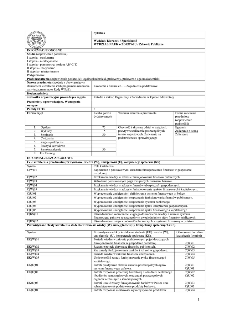 Syllabus Wydział / Kierunek / Specjalność WYDZIAŁ NAUK o ZDROWIU / Zdrowie Publiczne INFORMACJE OGÓLNE Studia (odpowiednie podkreślić) I stopnia - stacjonarne I stopnia - niestacjonarne I stopnia - pomostowe: poziom AB/ C/ D II stopnia - stacjonarne II stopnia - niestacjonarne Podyplomowe Profil kształcenia (odpowiednie podkreślić): ogólnoakademicki, praktyczny, praktyczno-ogólnoakademicki Nazwa przedmiotu (zgodnie z obowiązującym standardem kształcenia i/lub programem nauczania Ekonomia i finanse cz. I – Zagadnienia podstawowe zatwierdzonym przez Radę WNoZ). Kod przedmiotu Katedra i Zakład Organizacji i Zarządzania w Opiece Zdrowotnej Jednostka organizacyjna prowadząca zajęcia Przedmioty wprowadzające. Wymagania wstępne Punkty ECTS Forma zajęć 1. 2. 3. 4. 5. 6. 7. 8. Ogółem Wykłady Seminaria Ćwiczenia Zajęcia praktyczne Praktyki zawodowe Samokształcenie E – learning 3 Liczba godzin dydaktycznych 75 15 30 Warunki zaliczenia przedmiotu Obecność i aktywny udział w zajęciach, pozytywne zaliczenie poszczególnych testów wejściowych. Zaliczenie na podstawie testu sprawdzającego Forma zaliczenia przedmiotu (odpowiednie podkreślić) Egzamin Zaliczenie z oceną Zaliczenie 30 INFORMACJE SZCZEGÓŁOWE Cele kształcenia przedmiotu (C) wynikowe: wiedza (W), umiejętności (U), kompetencje społeczne (KS) Symbol Cele kształcenia C(W)01 Zapoznanie z podstawowymi zasadami funkcjonowania finansów w gospodarce narodowej. C(W)02 Przekazanie wiedzy w zakresie funkcjonowania finansów publicznych. C(W)03 Wdrożenie podstawowych pojęć związanych finansami banków. C(W)04 Przekazanie wiedzy w zakresie finansów ubezpieczeń gospodarczych. C(W)05 Przekazanie wiedzy w zakresie funkcjonowania rynków finansowych i kapitałowych. C(U)01 Wypracowanie umiejętności definiowania systemu finansowego w Polsce. C(U)02 Wypracowanie umiejętności rozpoznania funkcjonowania finansów publicznych. C(U)03 Wypracowania umiejętności rozpoznania systemu bankowego. C(U)04 Wypracowania umiejętności rozpoznania rynku ubezpieczeń gospodarczych. C(U)05 Wypracowania umiejętności rozpoznania rynku finansowego i kapitałowego. C(KS)01 Uświadomienie konieczności ciągłego doskonalenia wiedzy z zakresu systemu finansowego państwa ze szczególnym uwzględnieniem sfery finansów publicznych. C(KS)02 Uświadomienie miejsca podmiotów leczniczych w systemie finansowym państwa. Przewidywane efekty kształcenia studenta w zakresie wiedzy (W), umiejętności (U), kompetencji społecznych (KS). Symbol EK(W)01 EK(W)02 EK(W)03 EK(W)04 EK(W)05 EK(U)01 EK(U)02 EK(U)03 EK(U)04 Przewidywane efekty kształcenia studenta (EK): wiedza (W), umiejętności (U), kompetencje społeczne (KS). Posiada wiedzę w zakresie podstawowych pojęć dotyczących funkcjonowania finansów w gospodarce narodowej. Rozumie pojęcia dotyczące finansów publicznych. Zna zasady funkcjonowania banków i ich roli w gospodarce. Posiada wiedzę w zakresie finansów ubezpieczeń. Umie określić zasady funkcjonowania rynku finansowego i kapitałowego. Potrafi praktycznie określić zadania poszczególnych ogniw systemu finansowego państwa. Potrafi rozpoznać procedurę budżetową dla budżetu centralnego i budżetów samorządowych, oraz zadań poszczególnych organów centralnych i samorządowych. Potrafi ustalić zasady funkcjonowania banków w Polsce oraz scharakteryzować podstawowe produkty bankowe. Potrafi rozpoznać możliwości wykorzystywania produktów Odniesienie do celów kształcenia (symbol) C(W)01 C(W)02 C(W)03 C(W)04 C(W)05 C(W)01 C(U)01 C(W)02 C(U)02 C(W)03 C(U)03 C(W)04 1 ubezpieczeniowych funkcjonujących w Polsce. C(U)04 Potrafi określić możliwości wykorzystania rynku finansowego i C(W)05 kapitałowego w działalności gospodarczej. C(U)05 EK(KS)01 Rozumie potrzebę ciągłego zgłębiania wiedzy w zakresie C(KS)01 systemu finansowego państwa ze szczególnym uwzględnieniem finansów publicznych. EK(KS)02 Potrafi efektywnie współpracować w zespole zadaniowym w C(KS)02 zakresie rozpoznawania procedur tworzenia budżetów. Treści programowe (TP): opis przedmiotu wynikający z obowiązującego standardu kształcenia i/lub programu nauczania zatwierdzonego przez Radę WNoZ Symbol Forma realizacji treści kształcenia: np. wykład, seminaria, Odniesienie do ćwiczenia, zajęcia praktyczne, praktyki zawodowe, efektów kształcenia samokształcenie, E- learning (symbol) TP1- Wprowadzenie w problematykę Wykład EK(W)01 EK(U)01 TP2 – Finanse publiczne Wykład EK(W)02 EK(U)02 TP3 – Finanse banków Wykład EK(W)03 EK(U)03 TP4 – Finanse ubezpieczeń gospodarczych Wykład EK(W)04 EK(U)04 TP5 – Rynek finansowy i kapitałowy Wykład EK(W)05 EK(U)05 TP6 – Finanse publiczne Seminarium EK(W)02 EK(U)02 TP7 – Finanse banków Seminarium EK(W)03 EK(U)03 TP8 – Finanse ubezpieczeń gospodarczych Seminarium EK(W)04 EK(U)04 TP9 – Rynek finansowy i kapitałowy Seminarium EK(W)05 EK(U)05 Metody dydaktyczne (sposób pracy nauczyciela, Wykłady wspierać stosownymi prezentacjami. Seminaria prowadzić z zastosowaniem umożliwiający osiągnięcie celów kształcenia) technik konwersatoryjnych. Seminaria poprzedzać krótkimi testami (wejściówki). Praca indywidualna i w małych zespołach, praca na dokumentach. Rzutnik multimedialny lub rzutnik folii. Środki dydaktyczne wykorzystywane w procesie kształcenia Wykaz piśmiennictwa dla studenta S. Owsiak, Podstawy nauki finansów, PWE, Warszawa 2009 r. Piśmiennictwo podstawowe do 4 pozycji E. Jarocka, Finanse, Diffin, Warszawa 2008 r. Z. Dobosiewicz, Wprowadzenie do finansów i bankowości, PWN, Warszawa 2010 r. J. Monkiewicz (red.), Podstawy ubezpieczeń, Poltex, Warszawa 2001 r. W. Dąbski, Rynek finansowy i jego mechanizmy, Podstawy teorii i praktyki, PWN, Piśmiennictwo uzupełniające do 4 pozycji Warszawa 2009 r. E. Denek, J. Sobiech, J. Wolniak, Finanse publiczne, PWN, Warszawa 2010 r. Sposób oceny pracy studenta Typ oceny: diagnostyczne (D), fo