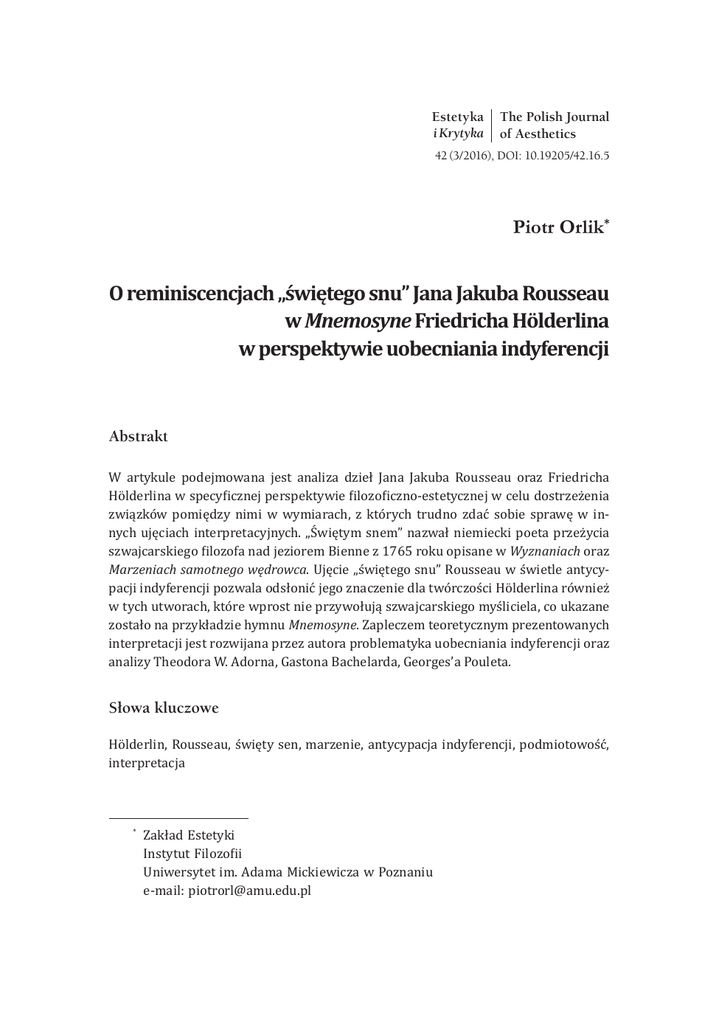 Estetyka i Krytyka The Polish Journal of Aesthetics 42 (3/2016), DOI: 10.19205/42.16.5 Piotr Orlik* O reminiscencjach „świętego snu” Jana Jakuba Rousseau w Mnemosyne Friedricha Hölderlina w perspektywie uobecniania indyferencji Abstrakt W artykule podejmowana jest analiza dzieł Jana Jakuba Rousseau oraz Friedricha Hölderlina w specyficznej perspektywie filozoficzno-estetycznej w celu dostrzeżenia związków pomiędzy nimi w wymiarach, z których trudno zdać sobie sprawę w innych ujęciach interpretacyjnych. „Świętym snem” nazwał niemiecki poeta przeżycia szwajcarskiego filozofa nad jeziorem Bienne z 1765 roku opisane w Wyznaniach oraz Marzeniach samotnego wędrowca. Ujęcie „świętego snu” Rousseau w świetle antycypacji indyferencji pozwala odsłonić jego znaczenie dla twórczości Hölderlina również w tych utworach, które wprost nie przywołują szwajcarskiego myśliciela, co ukazane zostało na przykładzie hymnu Mnemosyne. Zapleczem teoretycznym prezentowanych interpretacji jest rozwijana przez autora problematyka uobecniania indyferencji oraz analizy Theodora W. Adorna, Gastona Bachelarda, Georges’a Pouleta. Słowa kluczowe Hölderlin, Rousseau, święty sen, marzenie, antycypacja indyferencji, podmiotowość, interpretacja * Zakład Estetyki Instytut Filozofii Uniwersytet im. Adama Mickiewicza w Poznaniu e-mail: [email protected] 104 Piotr Orlik Kto tropi to podstępem, Nie ujrzy nic prócz złudy; Kto siłą chce to posiąść, Zostanie ukarany. Kto zaś zaledwie marzy, nieraz doznaje olśnienia. F. Hölderlin, Wędrówka1 Hölderlin podejmujący „zew” „samotnej mowy” Rousseau Chociaż w Mnemosyne Friedricha Hölderlina osoba Jana Jakuba Rousseau nie jest bezpośrednio przywoływana, a pojawiają się wyłącznie postaci ze starożytnej Grecji, przede wszystkim tytułowa bogini pamięci, córka Uranosa i Gai, matka muz, a także bohaterowie Iliady (Achilles, Ajas, Patrokles), pochopne byłoby ograniczanie poszukiwań źródeł inspiracji poety w tym utworze wyłącznie do kręgu starożytnej mitologii greckiej. Zauważmy, że w drugiej strofie autor hymnu pisze o „zielonej łące Alp”2, a przecież wydarzeń opisywanych przez Homera nie sposób łączyć z tymi odległymi dla Greków górami. Przypomnieć warto, że przez całe wieki – aż do XIX stulecia – Alpy postrzegane były jako ponura przeszkoda w komunikacji pomiędzy północą i południem Europy i dopiero piesze alpejskie wędrówki Rousseau – fascynująco opisane w Wyznaniach3 – diametralnie zmieniły F. Hölderlin, Wędrówka, [w:] idem, Co się ostaje, ustanawiają poeci, tłum. A. Libera, Kraków 2003, s. 189. 2 Idem, Mnemosyne, [w:] idem, Co się ostaje, ustanawiają poeci, op. cit., s. 237. 3 W Wyznaniach czytamy między innymi: „Wędrować pieszo w piękną pogodę, piękną okolicą, nie spiesząc się, mając wszelako, jako kres drogi, przedmiot pełen uroku – oto ze wszystkich sposobów życia ten, który najbardziej przypada mi do smaku. Wiadomo już czytelnikowi, co rozumiem pod piękną okolicą. Nigdy krajobraz równy, choćby najpiękniejszy, nie wydaje się piękny w mych oczach. Trzeba mi strumieni, skał, świerków, czarnych lasów, gór, stromych dróg, po których się to wchodzi, to zstępuje, przepaści przyprawiających o drżenie” (J.-J. Rousseau, Wyznania, tłum. T. Boy-Żeleński, Kraków 2003, s. 145). W związku z „zieloną łąką Alp” (przywołaną w Mnemosyne Hölderlina) warto przytoczyć uwagę Karola Augustyna Sainte-Beuve’a: „Dotychczas literatura francuska była idealnie obojętna na widok zieloności: dopiero Rousseau pierwszy wprowadził zieloność do naszej literatury” (K. A. Sainte-Beuve, „Wyznania” Jana Jakuba Rousseau, [w:] idem, Wybór pism krytycznych, tłum. i oprac. A. Jakubiszyn-Tatarkiewiczowa, Wrocław 1957, s. 334). 1 O r e m i n i s c e n c j a c h „ ś w i ę t e g o s n u ” J. J. R o u s s e a u . . . 105 do nich stosunek. Wspinanie się i zdobywanie wysokich szczytów staje się nowego rodzaju pasją, której oddają się odkrywcy i podróżnicy, tematyka alpejska inspiruje artystów, a wielu mieszkańców miast odkrywa zalety świeżego górskiego powietrza. O tym, że Hölderlin podąża – przecieranymi przez autora Nowej Heloizy – szlakami nowego postrzegania gór, świadczy wymownie list do Krystiana Landauera, w którym wyznaje: „W obliczu Alp [...] staję wciąż w zdumieniu, naprawdę jeszczem nie przeżył dotąd podobnego wrażenia; są one jak przecudowna legenda z czasów bohaterskiej młodości naszej Matki-Ziemi i przypominają prastary, powstający dopiero Chaos [...]”4. Alpy nieustannie pojawiają się w twórczości poety. W hymnie Ren czytamy o „[...] schodach niebotycznych Alp, / Które dla mnie są bosko zbudowanym zamkiem, / A wedle dawnych podań rezydencją Niebian, / Skąd jednak coś z tajemnic przenika do ludzi”5. Znamienne, że w dalszych partiach tego utworu Hölderlin bezpośrednio przywołuje osobę Jana Jakuba Rousseau, podkreślając specyficzne cechy myśliciela, który „[...] ma duszę [...] nieposkromioną i hardą, / I niezawodny umysł, i słodki dar słyszenia [...]”6, oraz zarysowując znaczenie bliskich relacji, jakie próbuje nawiązać z nieżyjącym już, ale inspirującym go filozofem, którego zalicza do „Jakże mi bliskich i chyba / Dobrze znajomych, bo często / Ich żywot mnie przejmuje i budzi w piersi tęsknotę”7. Ponieważ w hymnie Ren przywołany zostaje z nazwiska tylko jeden i to właśnie szwajcarski myśliciel, nasuwa się pytanie: cóż wspólnego może mieć on z tytułową rzeką? W związku z pytaniem zauważyć warto, że przeżycia nazywane przez niemieckiego poetę „świętym snem”8 Rousseau miały miejsce nad jeziorem Bienne (niem. Biel), przez które przepływa rzeka Aare, płynąca na całej długości w bliskich poecie Alpach, jednocześnie największy pod względem ilości wody dopływ Renu. Friedric