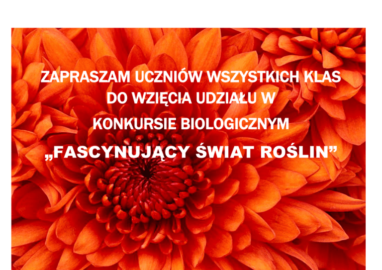 ZAPRASZAM UCZNIÓW WSZYSTKICH KLAS DO WZIĘCIA UDZIAŁU W KONKURSIE BIOLOGICZNYM „FASCYNUJĄCY ŚWIAT ROŚLIN” Forma: portfolio (minimum 20 stron), lub prezentacja multimedialna (minimum 20 slajdów). 1) Zakres tematyczny: 1. Jadalne owoce egzotyczne (np.: ananas, awokado, czerymoja, granat, guawa, kaki, karambola, kiwano, opuncja, pitaja, ręka buddy,t amarillo….). 2. Od rośliny do kosmetyków (np.: aloes, pokrzywa, rumianek, ginko biloba, kaktus, pluskwica groniasta, żyworódka pierzasta, ogórecznik chiński….). 3. Rośliny, które mogą uszczęśliwiać (kakaowiec, tytoń, herbata, Canabis sativa, Papaver somniferum….) 4. Rośliny-mordercy (np.: cliwia cynobrowa, wilczomlecz nadobny, lulek czarny, rącznik pospolity, naparstnica purpurowa, bieluń anielska trąba, tytoń szlachetny….. 2) Każde z 4 powyższych zagadnień proszę opracować na przykładzie 3-4 gatunków roślin, dowolnie przez siebie wybranych 3) Praca indywidualna, lub w parach 4) W opracowaniu mile widziane artykuły z prasy naukowej, z internetu (wydruki ), zdjęcia, ryciny, rysunki (własne rysunki), opisy, ciekawostki dotyczące fascynujących roślin 5) Termin oddawania prac: 15.05.2015 6) Autor najlepszej pracy otrzyma ocenę celującą z biologii, pozostali uczestnicy ocenę bardzo dobrą oraz nagrody-niespodzianki 7) Prezentacje multimedialne proszę przesyłać na adres [email protected] Monika Nowak-Bekier