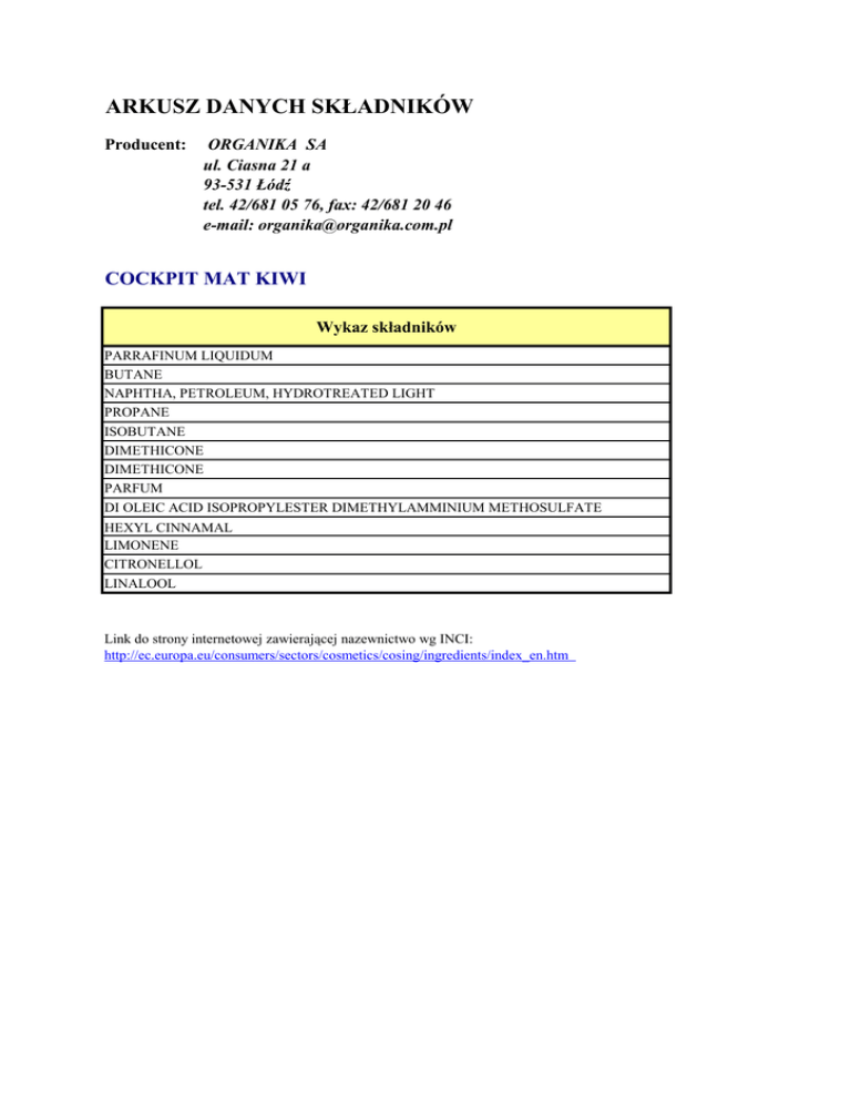 ARKUSZ DANYCH SKŁADNIKÓW Producent: ORGANIKA SA ul. Ciasna 21 a 93-531 Łódź tel. 42/681 05 76, fax: 42/681 20 46 e-mail: [email protected] COCKPIT MAT KIWI Wykaz składników PARRAFINUM LIQUIDUM BUTANE NAPHTHA, PETROLEUM, HYDROTREATED LIGHT PROPANE ISOBUTANE DIMETHICONE DIMETHICONE PARFUM DI OLEIC ACID ISOPROPYLESTER DIMETHYLAMMINIUM METHOSULFATE HEXYL CINNAMAL LIMONENE CITRONELLOL LINALOOL Link do strony internetowej zawierającej nazewnictwo wg INCI: http://ec.europa.eu/consumers/sectors/cosmetics/cosing/ingredients/index_en.htm