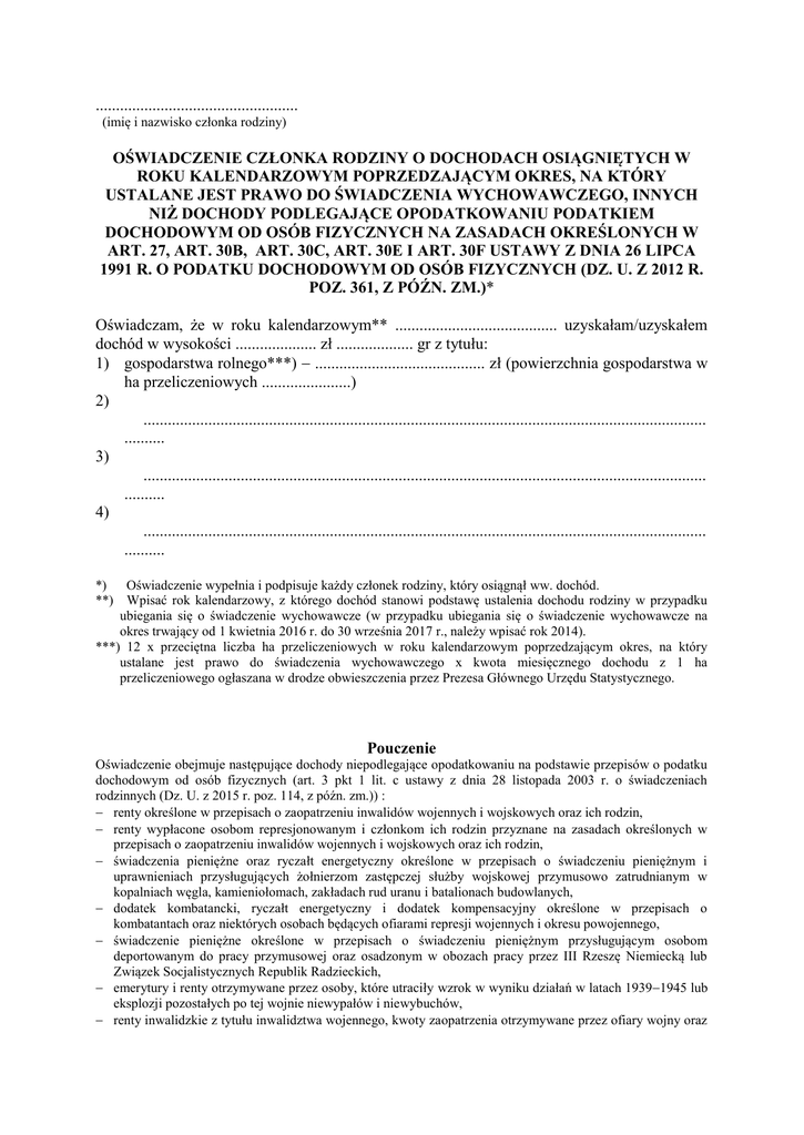 .................................................. (imię i nazwisko członka rodziny) OŚWIADCZENIE CZŁONKA RODZINY O DOCHODACH OSIĄGNIĘTYCH W ROKU KALENDARZOWYM POPRZEDZAJĄCYM OKRES, NA KTÓRY USTALANE JEST PRAWO DO ŚWIADCZENIA WYCHOWAWCZEGO, INNYCH NIŻ DOCHODY PODLEGAJĄCE OPODATKOWANIU PODATKIEM DOCHODOWYM OD OSÓB FIZYCZNYCH NA ZASADACH OKREŚLONYCH W ART. 27, ART. 30B, ART. 30C, ART. 30E I ART. 30F USTAWY Z DNIA 26 LIPCA 1991 R. O PODATKU DOCHODOWYM OD OSÓB FIZYCZNYCH (DZ. U. Z 2012 R. POZ. 361, Z PÓŹN. ZM.)* Oświadczam, że w roku kalendarzowym** ........................................ uzyskałam/uzyskałem dochód w wysokości .................... zł ................... gr z tytułu: 1) gospodarstwa rolnego***) .......................................... zł (powierzchnia gospodarstwa w ha przeliczeniowych ......................) 2) ........................................................................................................................................... .......... 3) ........................................................................................................................................... .......... 4) ........................................................................................................................................... .......... *) Oświadczenie wypełnia i podpisuje każdy członek rodziny, który osiągnął ww. dochód. **) Wpisać rok kalendarzowy, z którego dochód stanowi podstawę ustalenia dochodu rodziny w przypadku ubiegania się o świadczenie wychowawcze (w przypadku ubiegania się o świadczenie wychowawcze na okres trwający od 1 kwietnia 2016 r. do 30 września 2017 r., należy wpisać rok 2014). ***) 12 x przeciętna liczba ha przeliczeniowych w roku kalendarzowym poprzedzającym okres, na który ustalane jest prawo do świadczenia wychowawczego x kwota miesięcznego dochodu z 1 ha przeliczeniowego ogłaszana w drodze obwieszczenia przez Prezesa Głównego Urzędu Statystycznego. Pouczenie Oświadczenie obejmuje następujące dochody niepodlegające opodatkowaniu na podstawie przepisów o podatku dochodowym od osób fizycznych (art. 3 pkt 1 lit. c ustawy z dnia 28 listopada 2003 r. o świadczeniach rodzinnych (Dz. U. z 2015 r. poz. 114, z późn. zm.)) : renty określone w przepisach o zaopatrzeniu inwalidów wojennych i wojskowych oraz ich rodzin, renty wypłacone osobom represjonowanym i członkom ich rodzin przyznane na zasadach określonych w przepisach o zaopatrzeniu inwalidów wojennych i wojskowych oraz ich rodzin, świadczenia pieniężne oraz ryczałt energetyczny określone w przepisach o świadczeniu pieniężnym i uprawnieniach przysługujących żołnierzom zastępczej służby wojskowej przymusowo zatrudnianym w kopalniach węgla, kamieniołomach, zakładach rud uranu i batalionach budowlanych, dodatek kombatancki, ryczałt energetyczny i dodatek kompensacyjny określone w przepisach o kombatantach oraz niektórych osobach będących ofiarami represji wojennych i okresu powojennego, świadczenie pieniężne określone w przepisach o świadczeniu pieniężnym przysługującym osobom deportowanym do pracy przymusowej oraz osadzonym w obozach pracy przez III Rzeszę Niemiecką lub Związek Socjalistycznych Republik Radzieckich, emerytury i renty otrzymywane przez osoby, które utraciły wzrok w wyniku działań w latach 19391945 lub eksplozji pozostałych po tej wojnie niewypałów i niewybuchów, renty inwalidzkie z tytułu inwalidztwa wojennego, kwoty zaopatrzenia otrzymywane przez ofiary wojny oraz członków ich rodzin, renty wypadkowe osób, których inwalidztwo powstało w związku z przymusowym pobytem na robotach w III Rzeszy Niemieckiej w latach 19391945, otrzymywane z zagranicy, zasiłki chorobowe określone w przepisach o ubezpieczeniu społecznym rolników oraz w przepisach o systemie ubezpieczeń społecznych, środki bezzwrotnej pomocy zagranicznej otrzymywane od rządów państw obcych, organizacji międzynarodowych lub międzynarodowych instytucji finansowych pochodzące ze środków bezzwrotnej pomocy przyznanych na podstawie jednostronnej deklaracji lub umów zawartych z tymi państwami, organizacjami lub instytucjami przez Radę Ministrów, właściwego ministra lub agencje rządowe, w tym również w przypadkach, gdy przekazanie tych środków jest dokonywane za pośrednictwem podmiotu upoważnionego do rozdzielania środków bezzwrotnej pomocy zagranicznej na rzecz podmiotów, którym ma służyć ta pomoc, należności ze stosunku pracy lub z tytułu stypendium osób fizycznych mających miejsce zamieszkania na terytorium Rzeczypospolitej Polskiej, przebywających czasowo za granicą w wysokości odpowiadającej równowartości diet z tytułu podróży służbowej poza granicami kraju ustalonych dla pracowników zatrudnionych w państwowych lub samorządowych jednostkach sfery budżetowej na podstawie ustawy z dnia 26 czerwca 1974 r. – Kodeks pracy (Dz. U. z 2014 r. poz. 1502, z późn. zm.), należności pieniężne wypłacone policjantom, żołnierzom, celnikom i pracownikom jednostek wojskowych i jednostek policyjnych użytych poza granicami państwa w celu udziału w konflikcie zbrojnym lub wzmocnienia sił państwa albo państw sojuszniczych, misji pokojowej, akcji zapobieżenia aktom terroryzmu lub ich skutkom, a także należności pieniężne wypłacone żołnierzom, policjantom, celnikom i pracownikom pełniącym funkcje obserwatorów w misjach pokojowych organizacji międzynarodowych i sił wielonarodowych, należności pieniężne ze stosunku służbowego otrzymywane w czasie służby kandydackiej przez funkcjonariuszy Policji, Państwowej Straży Pożarnej, Straży Granicznej, Biura Ochrony Rządu, obliczone za okres, w którym osoby te uzyskały dochód, dochody członków rolniczych spółdzielni produkcyjnych z tytułu członkostwa w rolniczej spółdzielni produkcyjnej, pomniejszone o składki na ubezpieczenia społeczne, alimenty na rzecz dzieci, 