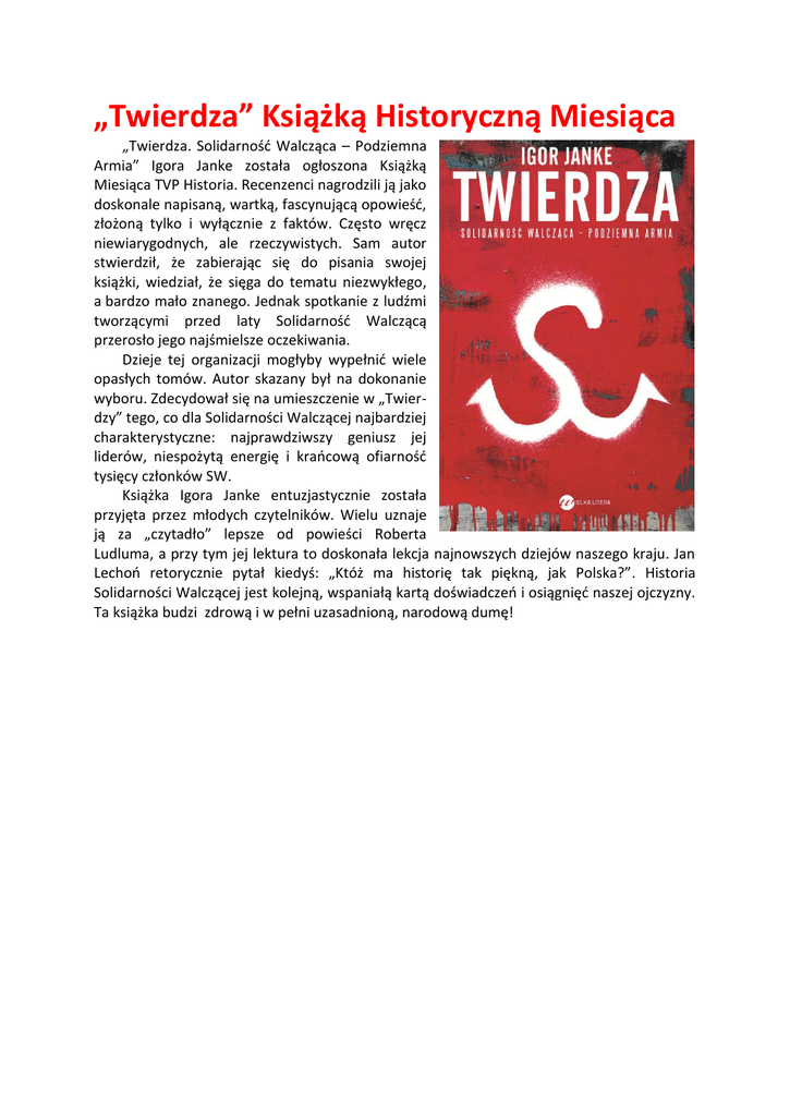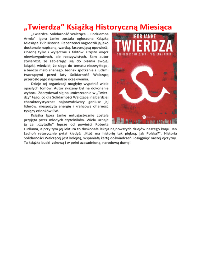 „Twierdza” Książką Historyczną Miesiąca „Twierdza. Solidarność Walcząca – Podziemna Armia” Igora Janke została ogłoszona Książką Miesiąca TVP Historia. Recenzenci nagrodzili ją jako doskonale napisaną, wartką, fascynującą opowieść, złożoną tylko i wyłącznie z faktów. Często wręcz niewiarygodnych, ale rzeczywistych. Sam autor stwierdził, że zabierając się do pisania swojej książki, wiedział, że sięga do tematu niezwykłego, a bardzo mało znanego. Jednak spotkanie z ludźmi tworzącymi przed laty Solidarność Walczącą przerosło jego najśmielsze oczekiwania. Dzieje tej organizacji mogłyby wypełnić wiele opasłych tomów. Autor skazany był na dokonanie wyboru. Zdecydował się na umieszczenie w „Twierdzy” tego, co dla Solidarności Walczącej najbardziej charakterystyczne: najprawdziwszy geniusz jej liderów, niespożytą energię i krańcową ofiarność tysięcy członków SW. Książka Igora Janke entuzjastycznie została przyjęta przez młodych czytelników. Wielu uznaje ją za „czytadło” lepsze od powieści Roberta Ludluma, a przy tym jej lektura to doskonała lekcja najnowszych dziejów naszego kraju. Jan Lechoń retorycznie pytał kiedyś: „Któż ma historię tak piękną, jak Polska?”. Historia Solidarności Walczącej jest kolejną, wspaniałą kartą doświadczeń i osiągnięć naszej ojczyzny. Ta książka budzi zdrową i w pełni uzasadnioną, narodową dumę!