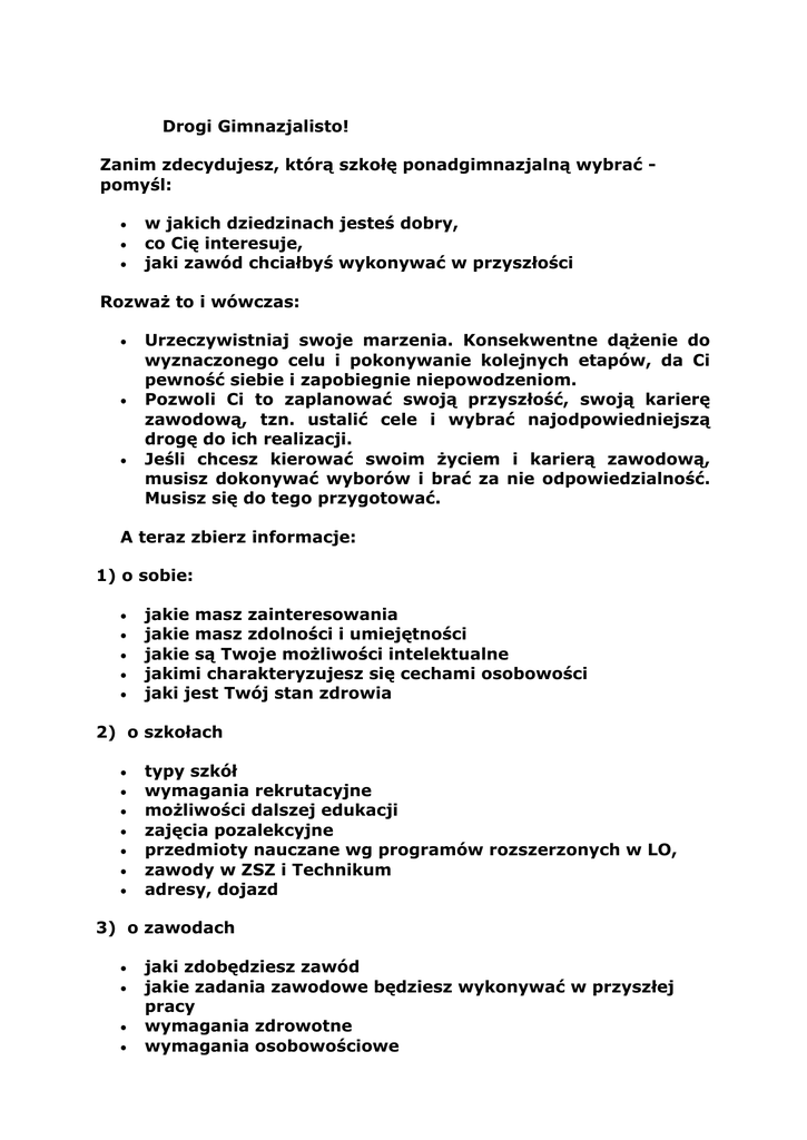 Drogi Gimnazjalisto! Zanim zdecydujesz, którą szkołę ponadgimnazjalną wybrać pomyśl: w jakich dziedzinach jesteś dobry, co Cię interesuje, jaki zawód chciałbyś wykonywać w przyszłości Rozważ to i wówczas: Urzeczywistniaj swoje marzenia. Konsekwentne dążenie do wyznaczonego celu i pokonywanie kolejnych etapów, da Ci pewność siebie i zapobiegnie niepowodzeniom. Pozwoli Ci to zaplanować swoją przyszłość, swoją karierę zawodową, tzn. ustalić cele i wybrać najodpowiedniejszą drogę do ich realizacji. Jeśli chcesz kierować swoim życiem i karierą zawodową, musisz dokonywać wyborów i brać za nie odpowiedzialność. Musisz się do tego przygotować. A teraz zbierz informacje: 1) o sobie: jakie masz zainteresowania jakie masz zdolności i umiejętności jakie są Twoje możliwości intelektualne jakimi charakteryzujesz się cechami osobowości jaki jest Twój stan zdrowia 2) o szkołach typy szkół wymagania rekrutacyjne możliwości dalszej edukacji zajęcia pozalekcyjne przedmioty nauczane wg programów rozszerzonych w LO, zawody w ZSZ i Technikum adresy, dojazd 3) o zawodach jaki zdobędziesz zawód jakie zadania zawodowe będziesz wykonywać w przyszłej pracy wymagania zdrowotne wymagania osobowościowe Porównaj zebrane informacje z modelowymi sylwetkami uczniów typów szkół ponadgimnazjalnych. Zastanów się, która szkoła da Ci najlepsze szanse rozwoju i będzie optymalną z punktu widzenia założonych przez Ciebie celów. Sylwetki uczniów Uczeń liceum ogólnokształcącego - jeżeli masz (lub możesz mieć) dobre oceny, wiesz, że nauka nie sprawia Ci trudności, jesteś ambitny, rozumiesz i akceptujesz konieczność ciągłego powiększania swojej wiedzy, plany na przyszłość wiążesz z ukończeniem studiów wyższych, masz różnorodne zainteresowania, jesteś ciekawy świata i otwarty na szybkie zmiany zachodzące w świecie to liceum ogólnokształcące jest szkołą odpowiednią dla Ciebie. Uczeń czteroletniego technikum - jeśli masz dobre oceny, nauka nie sprawia Ci trudności, chcesz zdobyć wykształcenie ogólne i nie wiesz jeszcze, czy będziesz studiować, a chciałbyś zdobyć tytuł technika w interesującym Cię zawodzie wraz z dobrym przygotowaniem ogólnym to jesteś kandydatem do czteroletniego technikum. Uczeń zasadniczej szkoły zawodowej - jeżeli dzisiaj bardziej wolisz wykonywać konkretną pracę, masz zainteresowania i uzdolnienia praktyczne, lubisz i potrafisz wykonywać niektóre czynności związane z interesującym Cię zawodem (np. majsterkowanie, gotowanie) lub chcesz szybko zakończyć naukę i usamodzielnić się, możesz wybrać zasadniczą szkołę zawodową. Drogi Gimnazjalisto Pamiętaj o tym, że znajdujesz się w okresie intensywnego rozwoju psychofizycznego i że Twoje dzisiejsze preferencje mogą w przyszłości się zmienić, mogą rozwinąć się inne zainteresowania i pojawić się chęć ich zgłębiania. Zawsze wtedy możesz kontynuować naukę w szkołach wyższego szczebla lub przez inne formy np. kursy.