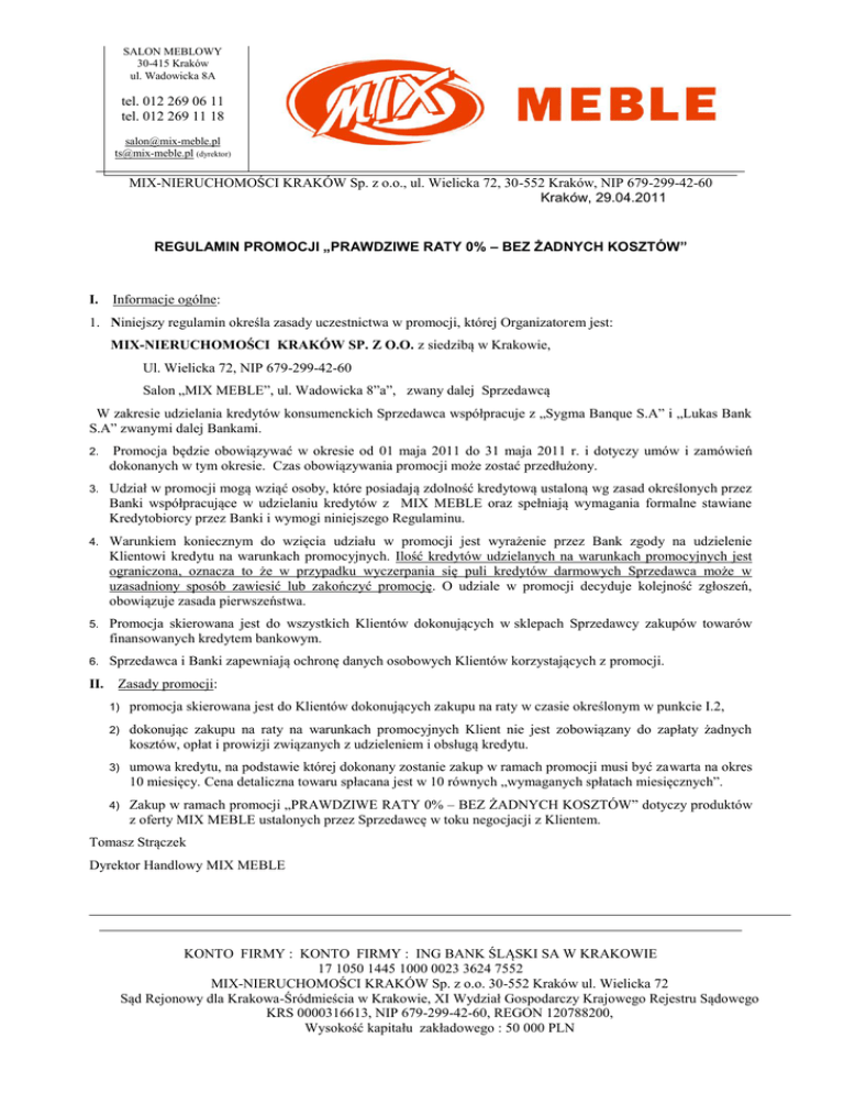 SALON MEBLOWY 30-415 Kraków ul. Wadowicka 8A tel. 012 269 06 11 tel. 012 269 11 18 [email protected] [email protected] (dyrektor) MIX-NIERUCHOMOŚCI KRAKÓW Sp. z o.o., ul. Wielicka 72, 30-552 Kraków, NIP 679-299-42-60 Kraków, 29.04.2011 REGULAMIN PROMOCJI „PRAWDZIWE RATY 0% – BEZ ŻADNYCH KOSZTÓW” I. Informacje ogólne: 1. Niniejszy regulamin określa zasady uczestnictwa w promocji, której Organizatorem jest: MIX-NIERUCHOMOŚCI KRAKÓW SP. Z O.O. z siedzibą w Krakowie, Ul. Wielicka 72, NIP 679-299-42-60 Salon „MIX MEBLE”, ul. Wadowicka 8”a”, zwany dalej Sprzedawcą W zakresie udzielania kredytów konsumenckich Sprzedawca współpracuje z „Sygma Banque S.A” i „Lukas Bank S.A” zwanymi dalej Bankami. 2. Promocja będzie obowiązywać w okresie od 01 maja 2011 do 31 maja 2011 r. i dotyczy umów i zamówień dokonanych w tym okresie. Czas obowiązywania promocji może zostać przedłużony. 3. Udział w promocji mogą wziąć osoby, które posiadają zdolność kredytową ustaloną wg zasad określonych przez Banki współpracujące w udzielaniu kredytów z MIX MEBLE oraz spełniają wymagania formalne stawiane Kredytobiorcy przez Banki i wymogi niniejszego Regulaminu. 4. Warunkiem koniecznym do wzięcia udziału w promocji jest wyrażenie przez Bank zgody na udzielenie Klientowi kredytu na warunkach promocyjnych. Ilość kredytów udzielanych na warunkach promocyjnych jest ograniczona, oznacza to że w przypadku wyczerpania się puli kredytów darmowych Sprzedawca może w uzasadniony sposób zawiesić lub zakończyć promocję. O udziale w promocji decyduje kolejność zgłoszeń, obowiązuje zasada pierwszeństwa. 5. Promocja skierowana jest do wszystkich Klientów dokonujących w sklepach Sprzedawcy zakupów towarów finansowanych kredytem bankowym. 6. Sprzedawca i Banki zapewniają ochronę danych osobowych Klientów korzystających z promocji. II. Zasady promocji: 1) promocja skierowana jest do Klientów dokonujących zakupu na raty w czasie określonym w punkcie I.2, 2) dokonując zakupu na raty na warunkach promocyjnych Klient nie jest zobowiązany do zapłaty żadnych kosztów, opłat i prowizji związanych z udzieleniem i obsługą kredytu. 3) umowa kredytu, na podstawie której dokonany zostanie zakup w ramach promocji musi być zawarta na okres 10 miesięcy. Cena detaliczna towaru spłacana jest w 10 równych „wymaganych spłatach miesięcznych”. 4) Zakup w ramach promocji „PRAWDZIWE RATY 0% – BEZ ŻADNYCH KOSZTÓW” dotyczy produktów z oferty MIX MEBLE ustalonych przez Sprzedawcę w toku negocjacji z Klientem. Tomasz Strączek Dyrektor Handlowy MIX MEBLE KONTO FIRMY : KONTO FIRMY : ING BANK ŚLĄSKI SA W KRAKOWIE 17 1050 1445 1000 0023 3624 7552 MIX-NIERUCHOMOŚCI KRAKÓW Sp. z o.o. 30-552 Kraków ul. Wielicka 72 Sąd Rejonowy dla Krakowa-Śródmieścia w Krakowie, XI Wydział Gospodarczy Krajowego Rejestru Sądowego KRS 0000316613, NIP 679-299-42-60, REGON 120788200, Wysokość kapitału zakładowego : 50 000 PLN