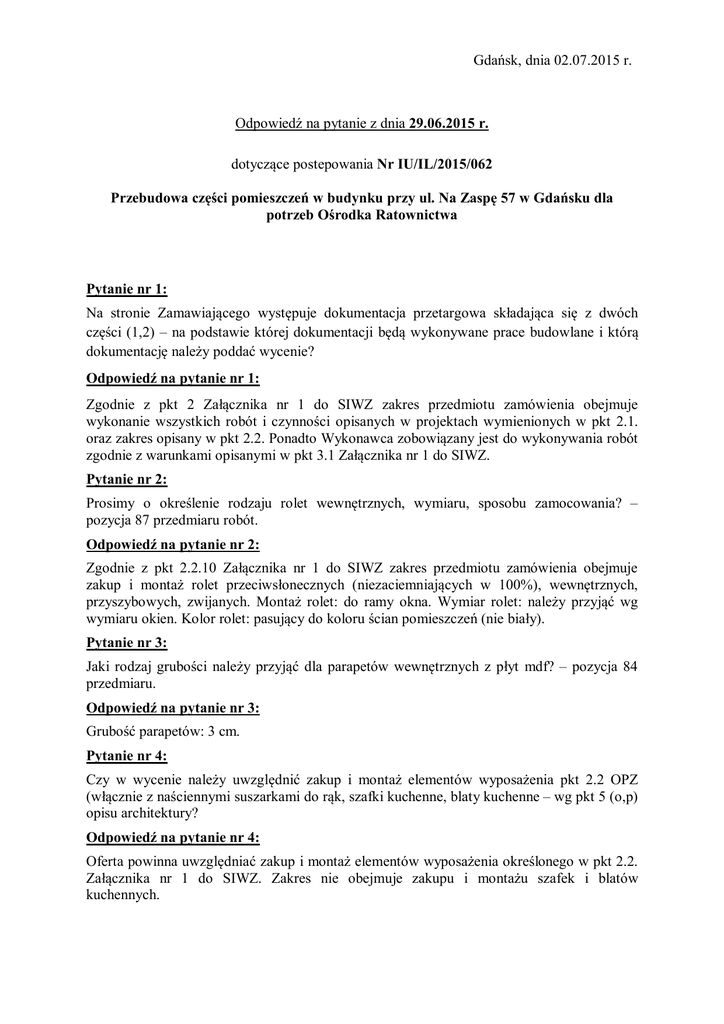 Gdańsk, dnia 02.07.2015 r. Odpowiedź na pytanie z dnia 29.06.2015 r. dotyczące postepowania Nr IU/IL/2015/062 Przebudowa części pomieszczeń w budynku przy ul. Na Zaspę 57 w Gdańsku dla potrzeb Ośrodka Ratownictwa Pytanie nr 1: Na stronie Zamawiającego występuje dokumentacja przetargowa składająca się z dwóch części (1,2) – na podstawie której dokumentacji będą wykonywane prace budowlane i którą dokumentację należy poddać wycenie? Odpowiedź na pytanie nr 1: Zgodnie z pkt 2 Załącznika nr 1 do SIWZ zakres przedmiotu zamówienia obejmuje wykonanie wszystkich robót i czynności opisanych w projektach wymienionych w pkt 2.1. oraz zakres opisany w pkt 2.2. Ponadto Wykonawca zobowiązany jest do wykonywania robót zgodnie z warunkami opisanymi w pkt 3.1 Załącznika nr 1 do SIWZ. Pytanie nr 2: Prosimy o określenie rodzaju rolet wewnętrznych, wymiaru, sposobu zamocowania? – pozycja 87 przedmiaru robót. Odpowiedź na pytanie nr 2: Zgodnie z pkt 2.2.10 Załącznika nr 1 do SIWZ zakres przedmiotu zamówienia obejmuje zakup i montaż rolet przeciwsłonecznych (niezaciemniających w 100%), wewnętrznych, przyszybowych, zwijanych. Montaż rolet: do ramy okna. Wymiar rolet: należy przyjąć wg wymiaru okien. Kolor rolet: pasujący do koloru ścian pomieszczeń (nie biały). Pytanie nr 3: Jaki rodzaj grubości należy przyjąć dla parapetów wewnętrznych z płyt mdf? – pozycja 84 przedmiaru. Odpowiedź na pytanie nr 3: Grubość parapetów: 3 cm. Pytanie nr 4: Czy w wycenie należy uwzględnić zakup i montaż elementów wyposażenia pkt 2.2 OPZ (włącznie z naściennymi suszarkami do rąk, szafki kuchenne, blaty kuchenne – wg pkt 5 (o,p) opisu architektury? Odpowiedź na pytanie nr 4: Oferta powinna uwzględniać zakup i montaż elementów wyposażenia określonego w pkt 2.2. Załącznika nr 1 do SIWZ. Zakres nie obejmuje zakupu i montażu szafek i blatów kuchennych. Pytanie nr 5: Czy rysunki, opis techniczny, zawierają 100% prac przewidzianych do realizacji? Odpowiedź na pytanie nr 5: Według odpowiedzi na pytanie nr 1. Pytanie nr 6: Przy wymianie stolarki drzwiowej dla drzwi D1 prosimy o określenie: - Czy może być zastosowana ościeżnica stała. - Czy mogą to być drzwi „cało drewniane”, nie okleinowe, tylko drewniane. - Jeżeli mogą być drzwi drewniane, to czy mają to być drzwi na dębie czy na sośnie? - Czy dostawka ma być stała / czy ruchoma? - Czy w dostawce musi być przeszklenie? Odpowiedź na pytanie nr 6: Zamawiający wyjaśnia kwestie dotyczące drzwi D1: może być ościeżnica stała, mogą być drzwi „cało drewniane”, drzwi mogą być sosnowe, dostawka ma być ruchoma, w obu skrzydłach (90+50) drzwi D1 i D2 występuje szklenie - zgodnie z rysunkiem drzwi, kolor drzwi: złoty dąb - identyczny z aktualnie zamontowanymi drzwiami.