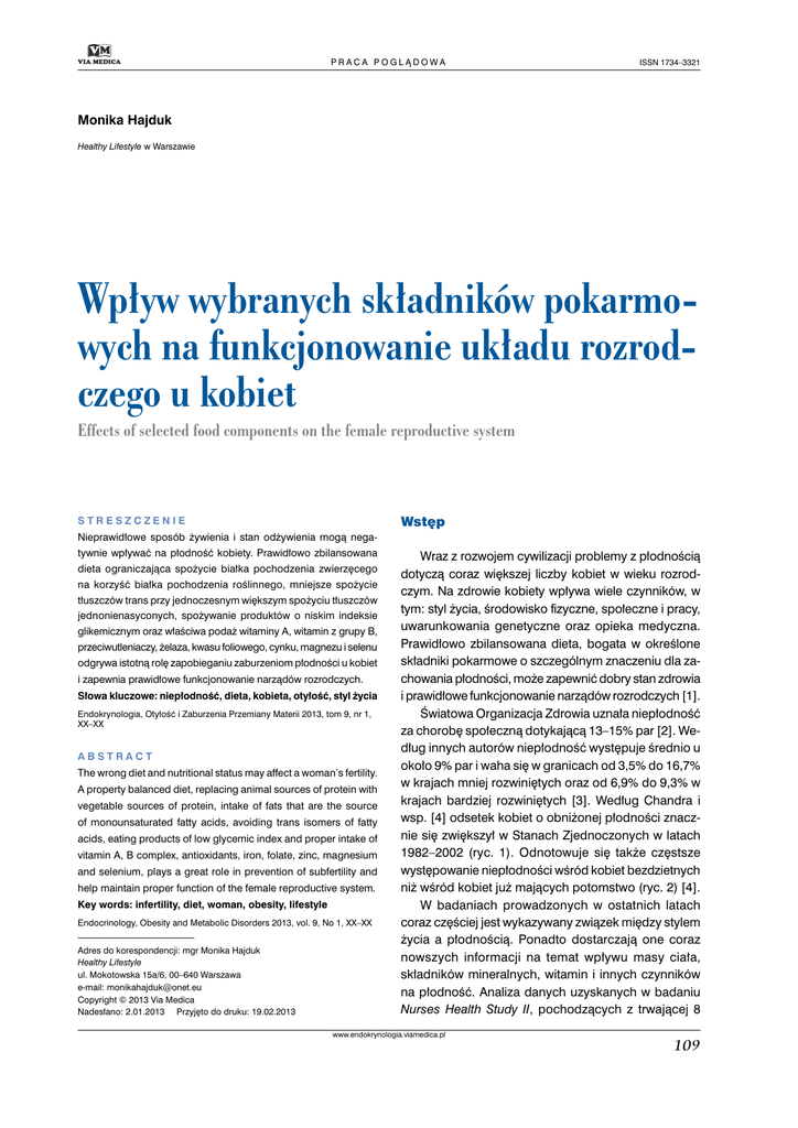 PRACA POGLĄDOWA ISSN 1734–3321 Monika Hajduk Healthy Lifestyle w Warszawie Wpływ wybranych składników pokarmowych na funkcjonowanie układu rozrodczego u kobiet Effects of selected food components on the female reproductive system Wstęp STRESZCZENIE Nieprawidłowe sposób żywienia i stan odżywienia mogą negatywnie wpływać na płodność kobiety. Prawidłowo zbilansowana dieta ograniczająca spożycie białka pochodzenia zwierzęcego na korzyść białka pochodzenia roślinnego, mniejsze spożycie tłuszczów trans przy jednoczesnym większym spożyciu tłuszczów jednonienasyconych, spożywanie produktów o niskim indeksie glikemicznym oraz właściwa podaż witaminy A, witamin z grupy B, przeciwutleniaczy, żelaza, kwasu foliowego, cynku, magnezu i selenu odgrywa istotną rolę zapobieganiu zaburzeniom płodności u kobiet i zapewnia prawidłowe funkcjonowanie narządów rozrodczych. Słowa kluczowe: niepłodność, dieta, kobieta, otyłość, styl życia Endokrynologia, Otyłość i Zaburzenia Przemiany Materii 2013, tom 9, nr 1, XX–XX ABSTRACT The wrong diet and nutritional status may affect a woman’s fertility. A property balanced diet, replacing animal sources of protein with vegetable sources of protein, intake of fats that are the source of monounsaturated fatty acids, avoiding trans isomers of fatty acids, eating products of low glycemic index and proper intake of vitamin A, B complex, antioxidants, iron, folate, zinc, magnesium and selenium, plays a great role in prevention of subfertility and help maintain proper function of the female reproductive system. Key words: infertility, diet, woman, obesity, lifestyle Endocrinology, Obesity and Metabolic Disorders 2013, vol. 9, No 1, XX–XX Adres do korespondencji: mgr Monika Hajduk Healthy Lifestyle ul. Mokotowska 15a/6, 00–640 Warszawa e-mail: [email protected] Copyright © 2013 Via Medica Nadesłano: 2.01.2013 Przyjęto do druku: 19.02.2013 Wraz z rozwojem cywilizacji problemy z płodnością dotyczą coraz większej liczby kobiet w wieku rozrodczym. Na zdrowie kobiety wpływa wiele czynników, w tym: styl życia, środowisko fizyczne, społeczne i pracy, uwarunkowania genetyczne oraz opieka medyczna. Prawidłowo zbilansowana dieta, bogata w określone składniki pokarmowe o szczególnym znaczeniu dla zachowania płodności, może zapewnić dobry stan zdrowia i prawidłowe funkcjonowanie narządów rozrodczych [1]. Światowa Organizacja Zdrowia uznała niepłodność za chorobę społeczną dotykającą 13–15% par [2]. Według innych autorów niepłodność występuje średnio u około 9% par i waha się w granicach od 3,5% do 16,7% w krajach mniej rozwiniętych oraz od 6,9% do 9,3% w krajach bardziej rozwiniętych [3]. Według Chandra i wsp. [4] odsetek kobiet o obniżonej płodności znacznie się zwiększył w Stanach Zjednoczonych w latach 1982–2002 (ryc. 1). Odnotowuje się także częstsze występowanie niepłodności wśród kobiet bezdzietnych niż wśród kobiet już mających potomstwo (ryc. 2) [4]. W badaniach prowadzonych w ostatnich latach coraz częściej jest wykazywany związek między stylem życia a płodnością. Ponadto dostarczają one coraz nowszych informacji na temat wpływu masy ciała, składników mineralnych, witamin i innych czynników na płodność. Analiza danych uzyskanych w badaniu Nurses Health Study II, pochodzących z trwającej 8 www.endokrynologia.viamedica.pl 109 Endokrynologia, Otyłość i Zaburzenia Przemiany Materii 2012, tom 8, nr 4 20 Odsetek (%) 15 Zmniejszenie płodności 15 Niepłodność 5 0 1982 1988 1995 2002 Rycina 1. Odsetek zamężnych kobiet w wieku 15–44 lat z obniżoną płodnością i niepłodnością w Stanach Zjednoczonych w latach 1982–2002 (źródło [4]) 30 27 Odsetek (%) 23 20 17 15–29 lat 30–34 lata 35–39 lat 40–44 lata 11 10 7 6 4 0 Brak dzieci 4 Jedno lub więcej dzieci Rycina 2. Odsetek zamężnych kobiet z niepłodnością według kryterium płci [wieku?] i liczby posiadanych dzieci; Stany Zjednoczone, 2002 (źródło [4]) lat obserwacji 17 544 kobiet w wieku 25–42 lat, które próbowały zajść w ciążę, wykazała, że niektóre cechy modelu żywienia mogą znacząco wpływać na zmniejszenie ryzyka niepłodności wynikającej z zaburzeń owulacji. W badaniu dowiedziono, że większy stopień zgodności z wzorcem „diety płodności” wiązał się z mniejszym ryzykiem niepłodności spowodowanej brakiem owulacji. Odpowiednie nawyki żywieniowe i styl życia mogą obniżyć ryzyko wystąpienia niepłodności z powodu zaburzeń owulacji o około 69% [5]. Do czynników dotyczących diety i stylu życia, które mogą wpływać na zaburzenia owulacji, można zaliczyć: odpowiedni stosunek jednonienasyconych kwasów tłuszczowych (MUFA, mono-unsaturated fatty acids) do izomerów trans kwasów tłuszczowych (trans 110 fat), spożycie białka, węglowodanów i nabiału, ilość żelaza w diecie, wskaźnik masy ciała (BMI, body mass index), aktywność fizyczną oraz suplementację diety. Według Chavarro i wsp. [5] większości przypadków niepłodności z powodu zaburzeń owulacji można zapobiec poprzez zmianę stylu życia, w tym mniejsze spożycie tłuszczów trans przy jednoczesnym większym spożyciu tłuszczów jednonienasyconych, ograniczenie spożycia białka pochodzenia zwierzęcego na korzyść białka pochodzenia roślinnego, częstsze spożywanie produktów bogatych w błonnik pokarmowy, spożywanie produktów o niskim indeksie glikemicznym (IG), bogatotłuszczowych produktów mlecznych, produktów będących dobrym źródłem żelaza oraz suplementację preparatami wielowitaminowymi. Wykazano, że kobiety modyfikujące jeden z wyżej wymienionych czynników w porównaniu z kobietami, których styl życia nie podlegał modyfikacjom, cechowało o 30% niższe ryzyko zaburzeń płodności [5]. Ryzyko niepłodności spowodowanej zaburzeniami owulacji skorygowane o pięć czynników stylu życia, w tym stosowanie odpow