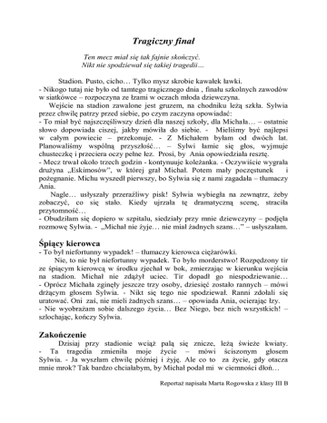 Tragiczny finał Ten mecz miał się tak fajnie skończyć. Nikt nie spodziewał się takiej tragedii… Stadion. Pusto, cicho… Tylko mysz skrobie kawałek ławki. - Nikogo tutaj nie było od tamtego tragicznego dnia , finału szkolnych zawodów w siatkówce – rozpoczyna ze łzami w oczach młoda dziewczyna. Wejście na stadion zawalone jest gruzem, na chodniku leżą szkła. Sylwia przez chwilę patrzy przed siebie, po czym zaczyna opowiadać: - To miał być najszczęśliwszy dzień dla naszej szkoły, dla Michała… – ostatnie słowo dopowiada ciszej, jakby mówiła do siebie. - Mieliśmy być najlepsi w całym powiecie – przekonuje. - Z Michałem byłam od dwóch lat. Planowaliśmy wspólną przyszłość… – Sylwi łamie się głos, wyjmuje chusteczkę i przeciera oczy pełne łez. Prosi, by Ania opowiedziała resztę. - Mecz trwał około trzech godzin - kontynuuje koleżanka. - Oczywiście wygrała drużyna „Eskimosów”, w której grał Michał. Potem mały poczęstunek i pożegnanie. Michu wyszedł pierwszy, bo Sylwia się z nami zagadała – tłumaczy Ania. Nagle… usłyszały przeraźliwy pisk! Sylwia wybiegła na zewnątrz, żeby zobaczyć, co się stało. Kiedy ujrzała tę dramatyczną scenę, straciła przytomność… - Obudziłam się dopiero w szpitalu, siedziały przy mnie dziewczyny – podjęła rozmowę Sylwia. - „Michał nie żyje… nie miał żadnych szans…” – usłyszałam. Śpiący kierowca - To był niefortunny wypadek! – tłumaczy kierowca ciężarówki. Nie, to nie był niefortunny wypadek. To było morderstwo! Rozpędzony tir ze śpiącym kierowcą w środku zjechał w bok, zmierzając w kierunku wejścia na stadion. Michał nie zdążył uciec. Tir dopadł go niespodziewanie… - Oprócz Michała zginęły jeszcze trzy osoby, dziesięć zostało rannych – mówi drżącym głosem Sylwia. - Nikt się tego nie spodziewał. Ranni zdołali się uratować. Oni zaś, nie mieli żadnych szans… – opowiada Ania, ocierając łzy. - Nie wyobrażam sobie dalszego życia… Bez Niego, bez nich wszystkich! – szlochając, kończy Sylwia. Zakończenie Dzisiaj przy stadionie wciąż palą się znicze, leżą świeże kwiaty. - Ta tragedia zmieniła moje życie – mówi ściszonym głosem Sylwia. - Ja wyszłam chwilę później i żyję. Ale co to za życie, gdy otacza mnie mrok? Tak bardzo chciałabym, by Michał podał mi w ciemności dłoń… Reportaż napisała Marta Rogowska z klasy III B