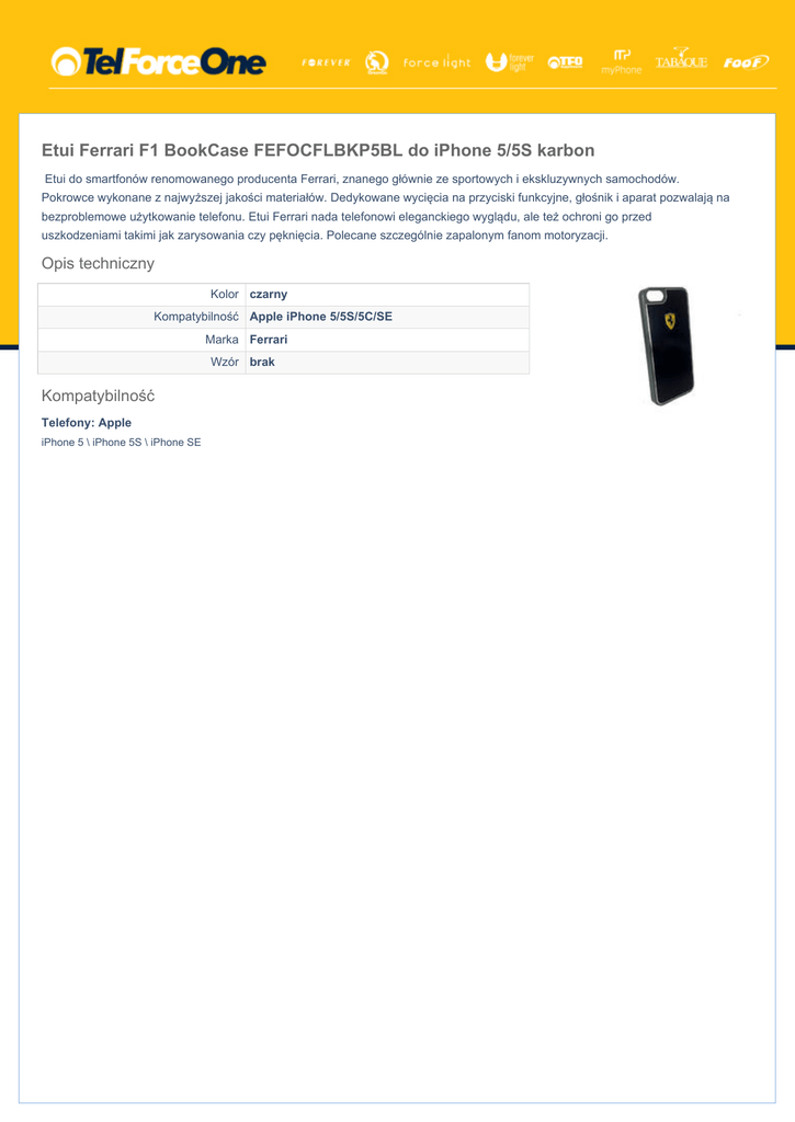 Etui Ferrari F1 BookCase FEFOCFLBKP5BL do iPhone 5/5S karbon Etui do smartfonów renomowanego producenta Ferrari, znanego głównie ze sportowych i ekskluzywnych samochodów. Pokrowce wykonane z najwyższej jakości materiałów. Dedykowane wycięcia na przyciski funkcyjne, głośnik i aparat pozwalają na bezproblemowe użytkowanie telefonu. Etui Ferrari nada telefonowi eleganckiego wyglądu, ale też ochroni go przed uszkodzeniami takimi jak zarysowania czy pęknięcia. Polecane szczególnie zapalonym fanom motoryzacji. Opis techniczny Kolor czarny Kompatybilność Apple iPhone 5/5S/5C/SE Marka Ferrari Wzór brak Kompatybilność Telefony: Apple iPhone 5 \ iPhone 5S \ iPhone SE