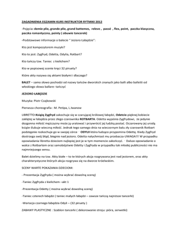 ZAGADNIENIA EGZAMIN KURS INSTRUKTOR RYTMIKI 2012 -Pojęcia: demie plie, grande plie, grand battemes, releve , passé , flex, point, paczka klasyczna, paczka romantyczna, pointy ( obuwie tancerek) -Podstawowe informacje o balecie “ Jezioro Łabędzie”: Kto jest kompozytorem muzyki? Kto to jest: Zygfryd, Odetta, Odylia, Rotbart? Kto tańczy tzw. Taniec z kielichem? Kto w popisowej scenie kręci 32 piruety? Które akty nazywa się aktami białymi i dlaczego? BALET – samo słowo pochodzi od nazwy tańców dworskich znanych jako balli albo balletti od włoskiego słowa ballare- tańczyć JEZIORO ŁABĘDZIE Muzyka: Piotr Czajkowski Pierwsza choreografia : M. Petipa, L.Iwanow LIBRETTO:Książę Zygfryd zakochuje się w czarującej królowej łabędzi, Odetcie-pięknej kobiecie zaklętej w łabędzia przez złego czarownika ROTBARTA. Odetta wyjaśnia Zygfrydowi, że jedynie dozgonna miłość mężczyzny może ją uratować i przywrócić jej ludzką postać. Oczarowany jej urodą książe ślubuje wieczną miłość. Jednak tego samego dnia na wieczornym balu zły czarownik Rotbart podstępnie rozkochuje go w swojej córce – ODYLII która łudząco przypomina Odettę. Kiedy Zygfryd dostrzega swój błąd, biegnie nad jezioro. Odetta natychmiast mu przebacza-UWAGA!!! W przypadku opowiadania libretta dzieciom najlepiej jest je w tym momencie zakończyć. – Dalsze opowiadanie o walce z Rotbartem oraz samobójstwie Odetty i Zygfryda w przypadku tak młodej publiczności nie ma najmniejszego sensu. Balet dzielimy na tzw. Akty białe – to te których akcja rozgrywana jest nad jeziorem, oraz akty charakterystyczne których akcja rozgrywa się na dworze króelwskim. SCENY WARTE POKAZANIA DZIECIOM: - Prezentacja Zygfryda ( można wybrać dowolną scenę) -Taniec Zygfryda z kielichem –akt 1 -Prezentacja Odetty ( można wybrać dowolną scenę) -Taniec czterech łabędzi ( taniec małych łabędzi – zawsze tańczą najniższe tancerki) -Wariacja czarnego łabędzia Odyli – (32 piruety ) ZABAWY PLASTYCZNE : Szablon tancerki ( dekorowanie stroju: pióra, serwetki)
