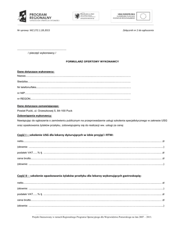 Nr sprawy: WZ.272.1.28.2015 Załącznik nr 2 do ogłoszenia ........................................................ / pieczęć wykonawcy / FORMULARZ OFERTOWY WYKONAWCY Dane dotyczące wykonawcy: Nazwa............................................................................................................................................ Siedziba......................................................................................................................................... Nr telefonu/faks.............................................................................................................................. nr NIP............................................................................................................................................. nr REGON..................................................................................................................................... Dane dotyczące zamawiającego: Powiat Pucki, ul. Orzeszkowej 5, 84-100 Puck Zobowiązania wykonawcy: Nawiązując do ogłoszenia o zamówieniu publicznym na przeprowadzenie usługi szkolenia specjalistycznego w zakresie USG oraz opaskowania żylaków przełyku, zobowiązujemy się do realizacji ww. usługi za cenę: Część I – szkolenie USG dla lekarzy dyżurujących w izbie przyjęć i RTM: netto........................................................................................................................................................................................ zł (słownie: ...................................................................................................................................................................................) podatek VAT......% tj. ............................................................................................................................................................. zł cena brutto.............................................................................................................................................................................. zł (słownie: ...................................................................................................................................................................................) Część II – szkolenie opaskowania żylaków przełyku dla lekarzy wykonujących gastroskopię: netto........................................................................................................................................................................................ zł (słownie: ...................................................................................................................................................................................) podatek VAT......% tj. ............................................................................................................................................................. zł cena brutto.............................................................................................................................................................................. zł (słownie: ...................................................................................................................................................................................) ______________________________________________________________________________________________________________________________________________________ Projekt finansowany w ramach Regionalnego Programu Operacyjnego dla Województwa Pomorskiego na lata 2007 – 2013. Cena łączna szkoleń obejmująca część I i część II: netto........................................................................................................................................................................................ zł (słownie: ...................................................................................................................................................................................) podatek VAT......% tj. ............................................................................................................................................................. zł cena brutto.............................................................................................................................................................................. zł (słownie: ...................................................................................................................................................................................) Oświadczamy, że: a) oświadczamy, że posiadamy wiedzę i doświadczenie, dysponujemy odpowiednim potencjałem technicznym oraz osobami zdolnymi do wykonania zamówienia oraz znajdujemy się w sytuacji ekonomicznej i finansowej umożliwiającej jego realizację. b) oświadczamy, że zamówienie publiczne wykonamy w terminie do 21.11.2015 r., c) oświadczamy, że uważamy się za związanych ofertą przez czas wskazany w ogłoszeniu, d) postanowienia projektu umowy zostały przez nas zaakceptowane bez zastrzeżeń i zobowiązujemy się w przypadku wyboru naszej oferty do zawarcia umowy w miejscu i terminie wyznaczonym przez Zamawiającego. Osoby do kontaktów z Zamawiającym: ........................................................ nr tel. ...................................................................................... ........................................................ nr tel. ...................................................................................... …………………..dnia……………….. ………………………………………………………. (pieczęć i podpis upoważnionego przedstawiciela Wykonawcy) ______________________________________________________________________________________________________________________________________________________ Projekt finansowany w ramach Regionalnego Programu Operacyjnego dla Wojewód
