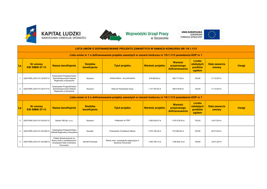 LISTA UMÓW O DOFINANSOWANIE PROJEKTU ZAWARTYCH W RAMACH KONKURSU NR 1/9.1.1/13 Lista umów nr 1 o dofinansowanie projektu zawartych w ramach konkursu nr 1/9.1.1/13 posiedzenia KOP nr 1 Lp. Nr umowy KSI SIMIK 07-13 1 2 Wartość projektu Wartość przyznanego dofinansowania Liczba zdobytych punktów ogółem Data zawarcia umowy Dokąd idziesz - do przedszkola 619 660,80 zł 526 711,68 zł 125,00 17.12.2013 r. Pędź do Przedszkola Sowy 1 131 787,00 zł 926 018,95 zł 122,50 17.12.2013 r. Nazwa beneficjenta Siedziba beneficjenta Tytuł projektu UDA-POKL.09.01.01-32-007/13 Towarzystwo Przyjaciół Dzieci Zachodniopomorski Oddział Regionalny w Szczecinie Szczecin UDA-POKL.09.01.01-32-011/13 Towarzystwo Przyjaciół Dzieci Zachodniopomorski Oddział Regionalny w Szczecinie Szczecin Uwagi Lista umów nr 2 o dofinansowanie projektu zawartych w ramach konkursu nr 1/9.1.1/13 posiedzenia KOP nr 1 Lp. Nr umowy KSI SIMIK 07-13 3 Wartość projektu Wartość przyznanego dofinansowania Liczba zdobytych punktów ogółem Data zawarcia umowy Integracja na TAK! 1 265 034,47 zł 1 075 279,30 zł 103,00 10.01.2014 r. Koszalin Przedszkole Troskliwych Misiów 1 074 192,35 zł 913 063,50 zł 125,50 22.01.2014 r. Kamień Pomorski Równy start - przedszkole integracyjne w Kamieniu Pomorskim 1 653 700,13 zł 1 405 645,12 zł 129,50 24.01.2014 r Nazwa beneficjenta Siedziba beneficjenta Tytuł projektu UDA-POKL.09.01.01-32-001/13 Szkoła TAK Sp. z o.o. Szczecin 4 UDA-POKL.09.01.01-32-022/13 Towarzystwo Przyjaciół Dzieci Oddział Regionalny w Koszalinie 5 UDA-POKL.09.01.01-32-029/13 Polskie Stowarzyszenie na Rzecz Osób z Upośledzeniem Umysłowym Koło w Kamieniu Pomorskim Uwagi Lista umów nr 3 o dofinansowanie projektu zawartych w ramach konkursu nr 1/9.1.1/13 posiedzenia KOP nr 1 Lp. Nr umowy KSI SIMIK 07-13 Nazwa beneficjenta Siedziba beneficjenta Tytuł projektu Wartość projektu Wartość przyznanego dofinansowania Liczba zdobytych punktów ogółem Data zawarcia umowy 6 UDA-POKL.09.01.01-32-009/13 Fenix Group Polska Poznań "Kolorowy Świat" 726 085,00 zł 617 172,25 zł 77,00 10.02.2014 r. 7 UDA-POKL.09.01.01-32-028/13 Gmina Radowo Małe Radowo Małe Niech się dzieci śmieją 460 852,00 zł 391 724,20 zł 106,00 12.02.2014 8 UDA-POKL.09.01.01-32-031/13 EDUKEY - Centrum Nauki Katarzyna Dąbrowska Wałcz Pluszaki na plus 550 914,48 zł 468 277,31 zł 99,00 14.02.2014 9 UDA-POKL.09.01.01-32-020/13 ERUDITIO Kancelaria Usług Oświatowych Maria Biernat Szczecin Tęczowa edukacja przedszkolaka - integracja dzieci 221 774,12 zł 188 508,00 zł 126,00 14.02.2014 Uwagi Lista umów nr 4 o dofinansowanie projektu zawartych w ramach konkursu nr 1/9.1.1/13 posiedzenia KOP nr 1 Lp. Nr umowy KSI SIMIK 07-13 Nazwa beneficjenta Siedziba beneficjenta Tytuł projektu Wartość projektu Wartość przyznanego dofinansowania Liczba zdobytych punktów ogółem Data zawarcia umowy 10 UDA-POKL.09.01.01-32-010/13 Gmina Chojna/ Przedszkole Miejskie w Chojnie Chojna Pomóż mi, a będę miał równy start 1 133 780,00 zł 963 713,00 zł 118,00 10.03.2014 r. 11 UDA-POKL.09.01.01-32-034/13 Centrum Edukacyjne "Urwisek" Katarzyna Szulecka Tanowo Urwisek II 751 877,64 zł 639 095,99 zł 99,50 10.03.2014 r. 12 UDA-POKL.09.01.01-32-040/13 AGNIESZKA MARLIŃSKACZYŻEWSKA "RANGDZIN" W3A.PL FRESHVIEW Poznań Dobry start dla najmłodszych 833 160,00 zł 708 186,00 zł 121,00 25.03.2014 Uwagi Lista umów nr 5 o dofinansowanie projektu zawartych w ramach konkursu nr 1/9.1.1/13 posiedzenia KOP nr 1 Lp. Nr umowy KSI SIMIK 07-13 13 UDA-POKL.09.01.01-32-035/13 14 UDA-POKL.09.01.01-32-017/13 Fundacja Edukacji Przedszkolnej Wartość projektu Wartość przyznanego dofinansowania Liczba zdobytych punktów ogółem Data zawarcia umowy Radosne przedszkolaki 974 657,65 828 459,00 75,50 09.04.2014 Przedszkolaki 729 973,08 620 477,12 84,50 25.04.2014 Nazwa beneficjenta Siedziba beneficjenta Tytuł projektu Lider Wałecki Wałcz Wrocław Uwagi Lista umów nr 6 o dofinansowanie projektu zawartych w ramach konkursu nr 1/9.1.1/13 posiedzenia KOP nr 1 Lp. Nr umowy KSI SIMIK 07-13 15 UDA-POKL.09.01.01-32-036/13 Nazwa beneficjenta Siedziba beneficjenta Tytuł projektu Gmina Gryfice/Szkoła Podstawowa nr 3 Gryfice Nasze przedszkole Wartość projektu Wartość przyznanego dofinansowania Liczba zdobytych punktów ogółem Data zawarcia umowy 700 623,00 595 529,55 75,50 24.06.2014 Uwagi Lista umów nr 7 o dofinansowanie projektu zawartych w ramach konkursu nr 1/9.1.1/13 posiedzenia KOP nr 1 Lp. Nr umowy KSI SIMIK 07-13 16 UDA-POKL.09.01.01-32-021/13 Nazwa beneficjenta Siedziba beneficjenta Tytuł projektu Pracownia Oświatowa, Agnieszka Chwastek Kalisz Pomorski Przedszkole Wesołe Nutki w Dębsku Wartość projektu Wartość przyznanego dofinansowania Liczba zdobytych punktów ogółem Data zawarcia umowy 816 164,64 693 739,94 66,50 08.08.2014 Uwagi Lista umów nr 8 o dofinansowanie projektu zawartych w ramach konkursu nr 1/9.1.1/13 posiedzenia KOP nr 1 Lp. Nr umowy KSI SIMIK 07-13 Nazwa beneficjenta Siedziba beneficjenta Tytuł projektu Wartość projektu Wartość przyznanego dofinansowania 17 UDA-POKL.09.01.01-32-018/13 PROFECKTUS Katarzyna Krysiak Liczba zdobytych punktów ogółem Szczecin Różne dzieci, równe prawa, jedno przedszkole! 480 000,00 408 000,00 73,00 Data zawarcia umowy Uwagi 09.09.2014 Lista umów nr 9 o dofinansowanie projektu zawartych w ramach konkursu nr 1/9.1.1/13 posiedzenia KOP nr 1 Lp. Nr umowy KSI SIMIK 07-13 18. UDA-POKL.09.01.01-32-002/13 Nazwa beneficjenta Siedziba beneficjenta Tytuł projektu Szkoła TAK Sp. z o.o. Szczecin Sprawnym być to podstawa, sport to również zabawa Wartość projektu Wartość przyznanego dofinansowania Liczba zdobytych punktów ogółem Data zawarcia umowy 765 076,69 650 315,19 60,50 09.10.2014 Uwagi Lista umów nr 10 o dofinansowanie projektu zawartych w ramach konkursu nr 1/9.1.1/13 posiedzenia KOP nr 2 Lp. Nr umowy KSI SIMIK 07-13 19. UDA-POKL.09.01.01-32-046/13 Nazwa beneficjenta Siedziba beneficj