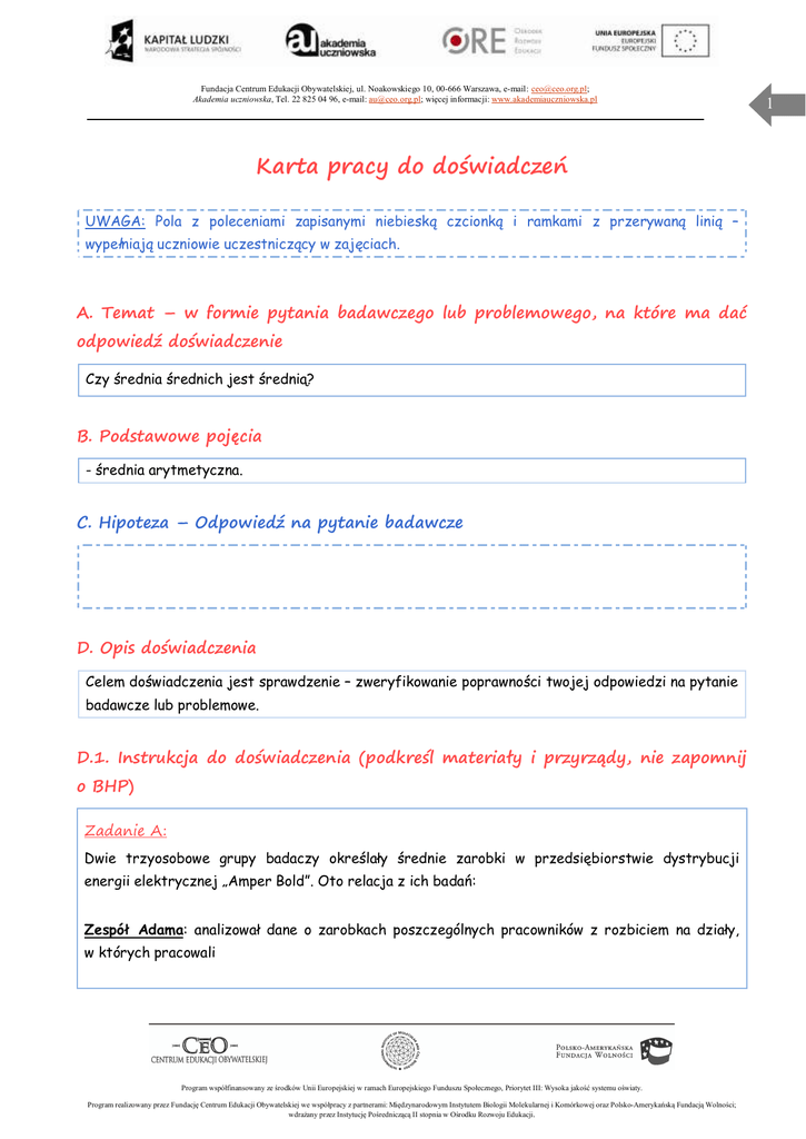Fundacja Centrum Edukacji Obywatelskiej, ul. Noakowskiego 10, 00-666 Warszawa, e-mail: [email protected]; Akademia uczniowska, Tel. 22 825 04 96, e-mail: [email protected]; więcej informacji: www.akademiauczniowska.pl Karta pracy do doświadczeń UWAGA: Pola z poleceniami zapisanymi niebieską czcionką i ramkami z przerywaną linią – wypełniają uczniowie uczestniczący w zajęciach. A. Temat – w formie pytania badawczego lub problemowego, na które ma dać odpowiedź doświadczenie Czy średnia średnich jest średnią? B. Podstawowe pojęcia - średnia arytmetyczna. C. Hipoteza – Odpowiedź na pytanie badawcze D. Opis doświadczenia Celem doświadczenia jest sprawdzenie – zweryfikowanie poprawności twojej odpowiedzi na pytanie badawcze lub problemowe. D.1. Instrukcja do doświadczenia (podkreśl materiały i przyrządy, nie zapomnij o BHP) Zadanie A: Dwie trzyosobowe grupy badaczy określały średnie zarobki w przedsiębiorstwie dystrybucji energii elektrycznej „Amper Bold”. Oto relacja z ich badań: Zespół Adama: analizował dane o zarobkach poszczególnych pracowników z rozbiciem na działy, w których pracowali Program współfinansowany ze środków Unii Europejskiej w ramach Europejskiego Funduszu Społecznego, Priorytet III: Wysoka jakość systemu oświaty. Program realizowany przez Fundację Centrum Edukacji Obywatelskiej we współpracy z partnerami: Międzynarodowym Instytutem Biologii Molekularnej i Komórkowej oraz Polsko-Amerykańską Fundacją Wolności; wdrażany przez Instytucję Pośredniczącą II stopnia w Ośrodku Rozwoju Edukacji. 1 Fundacja Centrum Edukacji Obywatelskiej, ul. Noakowskiego 10, 00-666 Warszawa, e-mail: [email protected]; Akademia uczniowska, Tel. 22 825 04 96, e-mail: [email protected]; więcej informacji: www.akademiauczniowska.pl Obliczenie średniego zarobku w firmie: 3000 + 3200 + 5200 = 3800 3 Zespół Oli: analizował dane o zarobkach tych samych pracowników zebrane w tabeli – osobno mężczyźni, a osobno kobiety: 1) Oceń, która hipoteza jest prawdziwa: 1. Poprawnie średnie zarobki firmy ustalił zespół Adama. 2. Poprawnie średnie zarobki firmy ustalił zespół Oli. 3. Żaden z zespołów nie określił poprawnie średnich zarobków firmy. 2) Zbierz w jedną tabelę dane o zarobkach pracowników firmy (bez rozbicia na kategorie - czyli nie tak, tak, jak to uczyniły zespoły badawcze Adama bądź Oli) 3) Oblicz średnią arytmetyczną dla tego zbioru. 4) Porównaj z wynikami poszczególnych zespołów badawczych i zweryfikuj swoją hipotezę. Program współfinansowany ze środków Unii Europejskiej w ramach Europejskiego Funduszu Społecznego, Priorytet III: Wysoka jakość systemu oświaty. Program realizowany przez Fundację Centrum Edukacji Obywatelskiej we współpracy z partnerami: Międzynarodowym Instytutem Biologii Molekularnej i Komórkowej oraz Polsko-Amerykańską Fundacją Wolności; wdrażany przez Instytucję Pośredniczącą II stopnia w Ośrodku Rozwoju Edukacji. 2 Fundacja Centrum Edukacji Obywatelskiej, ul. Noakowskiego 10, 00-666 Warszawa, e-mail: [email protected]; Akademia uczniowska, Tel. 22 825 04 96, e-mail: [email protected]; więcej informacji: www.akademiauczniowska.pl 3 D.2. Zmienne występujące w doświadczeniu 1. Jaką zmienną/wielkość będziemy zmieniać? (zmienna niezależna): - liczebność podzbiorów, dla których obliczano średnie cząstkowe, 2. Jaką zmienną/wielkość będziemy mierzyć – obserwować? (zmienna zależna): - średnia obliczona jako średnia ze średnich, 3. Czego w naszym eksperymencie nie będziemy zmieniać? (zmienne kontrolne): - zbiór płac wszystkich pracowników firmy. Nie zawsze wypełniamy wszystkie trzy punkty; np. w niektórych obserwacjach punkt 1. może być pominięty. D.3. Odnośniki literaturowe 1. Matematyka 2. Podręcznik dla gimnazjum. Wydanie 2010. Praca zbiorowa pod redakcją M. Dobrowolskiej. 2. Matematyka Europejczyka. Podręcznik dla gimnazjum. Klasa 2 Ewa Madziąg, Małgorzata Muchowska. Wydawnictwo Helion – rok wydania: 2013. 3. Matematyka 2001. Podręcznik do gimnazjum 2. Anna Bazyluk, Anna Dubiecka, Barbara Dubiecka-Kruk, Zbigniew Góralewicz, Tomasz Malicki, Piotr Piskorski, Henryk Sienkiewicz, Andrzej Ziemieńczuk. D.4. Uczniowska dokumentacja doświadczenia (wyniki pomiarów, tabelki, rysunki, obliczenia) Dane potrzebne do obliczenia średniej można zebrać w tabeli. Można także skopiować dane z tabeli Oli do utworzonej elektronicznie w arkuszu kalkulacyjnym i wykorzystać funkcję obliczania średniej. Poniżej proponowany wzór: nr pracownika 1 2 3 4 5 6 7 8 9 10 11 12 13 14 15 16 17 18 średni zarobek zarobek Program współfinansowany ze środków Unii Europejskiej w ramach Europejskiego Funduszu Społecznego, Priorytet III: Wysoka jakość systemu oświaty. Program realizowany przez Fundację Centrum Edukacji Obywatelskiej we współpracy z partnerami: Międzynarodowym Instytutem Biologii Molekularnej i Komórkowej oraz Polsko-Amerykańską Fundacją Wolności; wdrażany przez Instytucję Pośredniczącą II stopnia w Ośrodku Rozwoju Edukacji. Fundacja Centrum Edukacji Obywatelskiej, ul. Noakowskiego 10, 00-666 Warszawa, e-mail: [email protected]; Akademia uczniowska, Tel. 22 825 04 96, e-mail: [email protected]; więcej informacji: www.akademiauczniowska.pl 4 E. Wnioski z doświadczenia Czy wyniki doświadczenia są zgodne z hipotezą? TAK o NIE o Wypowiedź uzasadnij. Program współfinansowany ze środków Unii Europejskiej w ramach Europejskiego Funduszu Społecznego, Priorytet III: Wysoka jakość systemu oświaty. Program realizowany przez Fundację Centrum Edukacji Obywatelskiej we współpracy z partnerami: Międzynarodowym Instytutem Biologii Molekularnej i Komórkowej oraz Polsko-Amerykańską Fundacją Wolności; wdrażany przez Instytucję Pośredniczącą II stopnia w Ośrodku Rozwoju Edukacji. Fundacja Centrum Edukacji Obywatelskiej, ul. Noakowskiego 10, 00-666 Warszawa, e-mail: [email protected