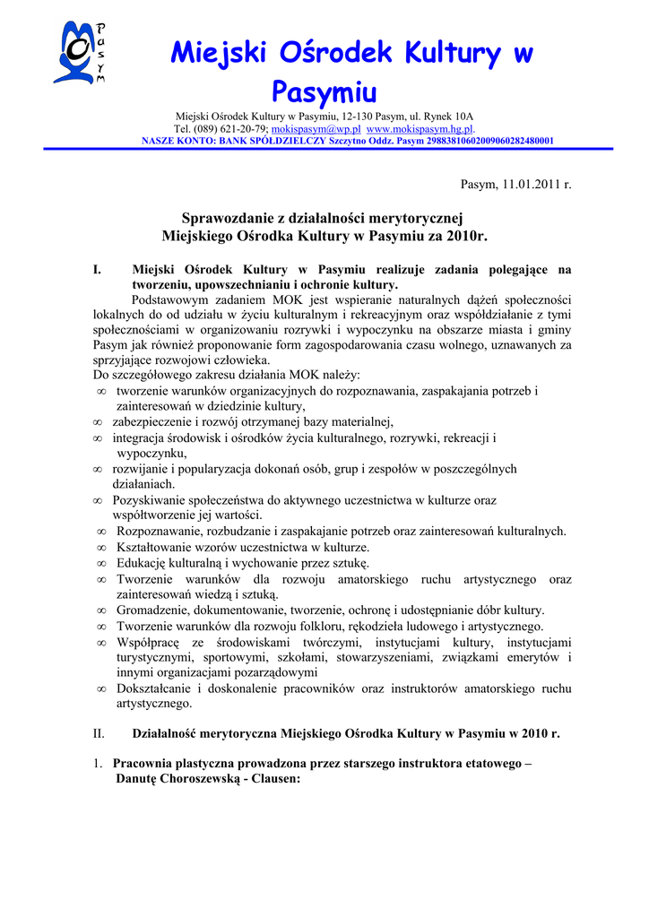 Miejski Ośrodek Kultury w Pasymiu Miejski Ośrodek Kultury w Pasymiu, 12-130 Pasym, ul. Rynek 10A Tel. (089) 621-20-79; [email protected] www.mokispasym.hg.pl. NASZE KONTO: BANK SPÓŁDZIELCZY Szczytno Oddz. Pasym 29883810602009060282480001 Pasym, 11.01.2011 r. Sprawozdanie z działalności merytorycznej Miejskiego Ośrodka Kultury w Pasymiu za 2010r. I. Miejski Ośrodek Kultury w Pasymiu realizuje zadania polegające na tworzeniu, upowszechnianiu i ochronie kultury. Podstawowym zadaniem MOK jest wspieranie naturalnych dążeń społeczności lokalnych do od udziału w życiu kulturalnym i rekreacyjnym oraz współdziałanie z tymi społecznościami w organizowaniu rozrywki i wypoczynku na obszarze miasta i gminy Pasym jak również proponowanie form zagospodarowania czasu wolnego, uznawanych za sprzyjające rozwojowi człowieka. Do szczegółowego zakresu działania MOK należy: • tworzenie warunków organizacyjnych do rozpoznawania, zaspakajania potrzeb i zainteresowań w dziedzinie kultury, • zabezpieczenie i rozwój otrzymanej bazy materialnej, • integracja środowisk i ośrodków życia kulturalnego, rozrywki, rekreacji i wypoczynku, • rozwijanie i popularyzacja dokonań osób, grup i zespołów w poszczególnych działaniach. • Pozyskiwanie społeczeństwa do aktywnego uczestnictwa w kulturze oraz współtworzenie jej wartości. • Rozpoznawanie, rozbudzanie i zaspakajanie potrzeb oraz zainteresowań kulturalnych. • Kształtowanie wzorów uczestnictwa w kulturze. • Edukację kulturalną i wychowanie przez sztukę. • Tworzenie warunków dla rozwoju amatorskiego ruchu artystycznego oraz zainteresowań wiedzą i sztuką. • Gromadzenie, dokumentowanie, tworzenie, ochronę i udostępnianie dóbr kultury. • Tworzenie warunków dla rozwoju folkloru, rękodzieła ludowego i artystycznego. • Współpracę ze środowiskami twórczymi, instytucjami kultury, instytucjami turystycznymi, sportowymi, szkołami, stowarzyszeniami, związkami emerytów i innymi organizacjami pozarządowymi • Dokształcanie i doskonalenie pracowników oraz instruktorów amatorskiego ruchu artystycznego. II. Działalność merytoryczna Miejskiego Ośrodka Kultury w Pasymiu w 2010 r. 1. Pracownia plastyczna prowadzona przez starszego instruktora etatowego – Danutę Choroszewską - Clausen: W/W pracownia skupiała dzieci w 3 grupach, w przedziale wiekowym kl. I-III i IVI szkoły podstawowej oraz gimnazjum. Zajęcia odbywały się 2 razy w tygodniu, po 1,1/2 godz. dla każdej grupy. Ponad to Pani Choroszewską - Clausen odpowiedzialna była za realizację i przygotowania dzieci do udziału w konkursach plastycznych organizowanych przez MOK w Pasymiu oraz inne instytucje na terenie całego powiatu szczycieńskiego. Prowadziła również indywidualne zajęcia plastyczne przygotowujące uczniów Publicznego Gimnazjum w Pasymiu do egzaminu praktycznego do Liceum Plastycznego w Olsztynie. Przygotowywała wystawy artystyczne w MOK oraz wykonywała scenografię i reklamę imprez organizowanych przez MOK w Pasymiu. 2. Pracownia teatralna prowadzona przez instruktora godzinowego – Wojciecha Grochowalskiego – zawodowego aktora W/W pracownia skupiała dzieci z klas I-IV szkoły podstawowej. Zajęcia odbywały się raz w tygodniu we czwartki, po 2 godz. lekcyjne i miały formę zabawy w teatr. Dzieci czytały teksty i pracowały nad nimi, poznając techniki poprawnej recytacji oraz tajniki gry aktorskiej. 3. Pracownia muzyczno-wokalna prowadzona przez instruktora godzinowego - Krzysztofa Kuczerę: W/W pracownia skupiała na zajęciach wokalnych oraz zajęciach nauki gry na pianinie dzieci w 3 grupach wiekowych: kl. I-III i I-VI szkoły podstawowej oraz gimnazjum. Były to zajęcia indywidualne i odbywały się 2 razy w tygodniu, w godz.15.00 – 20.00, po 1 godz. dla każdej osoby. Z każdą osoba uczestniczącą w zajęciach instruktor przygotował po 2 elementy programu artystycznego na Wieczór Wigilijny 2010 organizowany przez MOK w Pasymiu. 4. Pracownia muzyczna prowadzona instruktora godzinowego – Roberta Otwinowskiego W/W pracownia skupiała dzieci przedziale wiekowym kl. I-III i I-VI szkoły podstawowej oraz gimnazjum. Zajęcia odbywały się dwa raz w tygodniu, w godz.15.00 – 20.00, po 1 godz. dla każdego dziecka. Obie grupy pracowały nad przygotowaniem programu artystycznego na imprezy okolicznościowe organizowane przez MOK w Pasymiu. 5. Warsztaty informatyczne – prowadzone przez prowadzone przez instruktora etatowego – Kamila Kosakowskiego: W/W warsztatach uczestniczyły dzieci, młodzież i osoby dorosłe. Indywidualne zajęcia odbywały się raz w tygodniu w zależności od możliwości czasowych zainteresowanych. Instruktor realizował własny program autorski, opracowany na potrzeby zróżnicowanej wiekowo grupy beneficjentów dysponujących określoną wiedzą informatyczną. Ponad to Pan Kosakowski przygotowywał młodzież gimnazjalną do udziału w konkursie informatycznym. 6. Pracownia taneczna prowadzona przez instruktora stażystę – Lidię Podlecką W/W pracownia skupiała dzieci w 2 grupach wiekowych - kl. I-IV szkoły podstawowej i gimnazjum. Zajęcia odbywały się 2 razy w tygodniu we środy i piątki, po 2 godz. dla każdej grupy. Obie grupy pracowały nad przygotowaniem programu artystycznego na imprezy wewnętrzne organizowane przez MOK w Pasymiu. 7. Warsztaty kulinarne– prowadzone przez prowadzone przez instruktora etatowego – Kamila Kosakowskiego: W/W warsztatach uczestniczyły dzieci, młodzież gimnazjalna. Zajęcia odbywały się w 2 grupach wiekowych raz w tygodniu dla każdej grupy. Dzieci i młodzież poznawała tajniki sztuki kulinarnej, dekoracji potraw, nakrywania stołu oraz podstawowe zasady BHP podczas pracy w kuchni. Nowo nabyte umiejętności kulinarne obie grupy prezentowały przygotowując promocyjne stoisko z wypiekami podczas Wianków’2010 8. Czytelnia Internetowa IKONKA prowadzona przez instruktora etatowego – Kamila Kosakowskiego