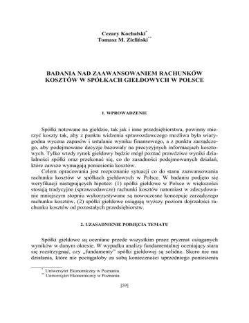 Cezary Kochalski* Tomasz M. Zieliński** BADANIA NAD ZAAWANSOWANIEM RACHUNKÓW KOSZTÓW W SPÓŁKACH GIEŁDOWYCH W POLSCE 1. WPROWADZENIE Spółki notowane na giełdzie, tak jak i inne przedsiębiorstwa, powinny mierzyć koszty tak, aby z punktu widzenia sprawozdawczego moŜliwa była wiarygodna wycena zapasów i ustalanie wyniku finansowego, a z punktu zarządczego, aby podejmowane decyzje bazowały na precyzyjnych informacjach kosztowych. Tylko wtedy rynek giełdowy będzie mógł poznać prawdziwe wyniki działalności spółki oraz przekonać się, co do zasadności podejmowanych działań, które zawsze wymagają poniesienia kosztów. Celem opracowania jest rozpoznanie sytuacji co do stanu zaawansowania rachunku kosztów w spółkach giełdowych w Polsce. W badaniu podjęto się weryfikacji następujących hipotez: (1) spółki giełdowe w Polsce w większości stosują tradycyjne (sprawozdawcze) rachunki kosztów natomiast w zdecydowanie mniejszym stopniu wykorzystywane są nowoczesne koncepcje zarządczego rachunku kosztów, (2) spółki giełdowe osiągają wyŜszy poziom dojrzałości rachunku kosztów od pozostałych przedsiębiorstw. 2. UZASADNIENIE PODJĘCIA TEMATU Spółki giełdowe są oceniane przede wszystkim przez pryzmat osiąganych wyników w danym okresie. W wypadku analizy fundamentalnej oceniający stara się rozstrzygnąć, czy „fundamenty” spółki giełdowej są solidne. Skoro nie ma działania, które nie pociągałoby za sobą konieczności uprzedniego poniesienia * ** Uniwersytet Ekonomiczny w Poznaniu. Uniwersytet Ekonomiczny w Poznaniu. [59] 60 Cezary Kochalski, Tomasz M. Zieliński kosztów, to za ten fundament trzeba uznać zarządzanie kosztami, a więc zdolność przedsiębiorstwa do kształtowania wielkości i struktury kosztów pod kątem tworzenia wartości. O tym, czy i w jakim stopniu ponoszone koszty przyczyniają się do tworzenia wartości w spółce giełdowej, powinien (a wręcz musi) informować rachunek kosztów. Musi być to rachunek, który umoŜliwia mierzenie kosztów w warunkach, gdy w spółkach giełdowych coraz większe znaczenie odgrywają koszty pośrednie, musi to być rachunek, który zwraca uwagę na koszty kapitału. A wiec, musi to być odpowiednio zaawansowany rachunek kosztów. Rosnące koszty pośrednie oraz koszty kapitału są konsekwencją zmian w wielkości i strukturze zasobów, które są wykorzystywane w procesach wytwórczych i sprzedaŜowych współczesnych przedsiębiorstw dla dostarczania wartości klientom. Spółki giełdowe zmuszone są do inwestowania w nowoczesne technologie, logistykę oraz marketing. Chcąc zapanować nad zuŜywanymi i angaŜowanymi zasobami, spółki giełdowe powinny więc posługiwać się coraz bardziej zaawansowanym rachunkiem kosztów. Spółki giełdowe powinny posługiwać się takim rachunkiem kosztów, który pozwoli na wiarygodną kalkulację, a przez to na poznanie, jaka jest prawdziwa rentowność produktów (klientów). Tylko wtedy będzie moŜliwe podejmowanie trafnych decyzji w przedsiębiorstwie, i tylko wtedy inwestorzy będą mogli mieć przesłanki do oceny wyników działalności spółki z punktu widzenia kreacji wartości. JeŜeli w spółce giełdowej nie stosuje się odpowiednio zaawansowanego rachunku kosztów, to nie moŜna stwierdzić do końca, jaka jest faktyczna efektywność przedsiębiorstwa. 3. POZIOMY ZAAWANSOWANIA RACHUNKU KOSZTÓW Przeprowadzenie badania nad zaawansowaniem rachunku kosztów w polskich spółkach giełdowych wymagało rozpoznania, zdefiniowania i przyjęcia określonej koncepcji hierarchizacji rachunków kosztów1. Jako podstawę odniesienia wykorzystaną do oceny stopnia dojrzałości rachunków kosztów stosowanych w spółkach giełdowych w Polsce przyjęto tzw. „Model 12 Poziomów Dojrzałości Rachunku Kosztów”, który pierwotnie został zaprezentowany w publikacji (dotyczącej międzynarodowych wytycznych dobrych praktyk) o tytule „Ocena i doskonalenie rachunku kosztów w organizacjach” (Evaluating and 1 Badania nad dojrzałością rachunków kosztów w polskich przedsiębiorstwach prowadzone są przez T. M. Zielińskiego w ramach przygotowywanej rozprawy doktorskiej na Uniwersytecie Ekonomicznym w Poznaniu pt.: „Zasobowo-Procesowy Rachunek Kosztów” pod opieką naukową C. Kochalskiego. Badania nad zaawansowaniem rachunków… 61 Improving Costing in Organizations2) oraz w towarzyszącym tej publikacji dokumencie Evaluating the Costing Journey: A Costing Levels Continuum Maturity Model3. Prace badawcze nad tym modelem i jego modyfikacją prowadzone są równieŜ na gruncie polskim4. W rozpatrywanym modelu uszeregowania koncepcji rachunków kosztów dokonano przy uwzględnieniu dwóch kryteriów5: − moŜliwości prawidłowego modelowania kosztów, zarówno historycznych, jak i przyszłych oraz − jakości informacji o kosztach krańcowych (marginalnych), jaką zapewnia dany rachunek kosztów. WyróŜniono następujące poziomy zawansowania rachunku kosztów: − Poziom 1 – koszty ujmowane są w wyłącznie w układzie rodzajowym bez podziałów na centra kosztów. Nie są prowadzone kalkulacje kosztów jednostkowych, − Poziom 2 – koszty są ujmowane w centrach kosztów (wyodrębnianych dla działów i wydziałów). Kalkulacja kosztów jednostkowych, albo nie jest realizowana, albo wykorzystane są zasady kalkulacji podziałowej prostej, − Poziom 3 – kalkulacja kosztu jednostkowego (pełnego) jest realizowana do poziomu grup produktowych/usługowych i jest ograniczona do kosztów bezpośrednich, które mogą być wprost przypisane do grup produktowych i usługowych, − Poziom 4 − kalkulacja kosztu jednostkowego realizowana jest ze szczegółowością do poziomu grup produktowych/usługowych. Koszty pośrednie są doliczane jako arbitralny narzut kosztów w oparciu o tradycyjne klucze doliczeniowe, jak np. roboczogodziny, kilogramy, sztuki itp., − Poziom 5 – rachunek kosztów standardowych lub kalk