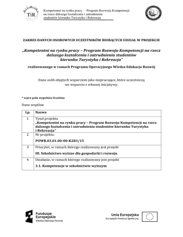 Kompetentni na rynku pracy – Program Rozwoju Kompetencji na rzecz dalszego kształcenia i zatrudnienia studentów kierunku Turystyka i Rekreacja ZAKRES DANYCH OSOBOWYCH UCZESTNIKÓW BIORĄCYCH UDZIAŁ W PROJEKCIE „Kompetentni na rynku pracy – Program Rozwoju Kompetencji na rzecz dalszego kształcenia i zatrudnienia studentów kierunku Turystyka i Rekreacja” realizowanego w ramach Programu Operacyjnego Wiedza Edukacja Rozwój Dane osób objętych wsparciem jako niepracujące, które uczestniczą we wsparciu z własnej inicjatywy. * szare pola wypełnia Uczelnia Dane wspólne Lp. 1 2 Nazwa Tytuł projektu „Kompetentni na rynku pracy – Program Rozwoju Kompetencji na rzecz dalszego kształcenia i zatrudnienia studentów kierunku Turystyka i Rekreacja” Nr projektu: POWR.03.01.00-00-K283/15 3 Priorytet, w ramach którego realizowany jest projekt III. Szkolnictwo wyższe dla gospodarki i rozwoju 4 Działanie, w ramach którego realizowany jest projekt 3.1. Kompetencje w szkolnictwie wyższym Kompetentni na rynku pracy – Program Rozwoju Kompetencji na rzecz dalszego kształcenia i zatrudnienia studentów kierunku Turystyka i Rekreacja Lp. Nazwa Dane uczestnika 1. Imię: 2. Nazwisko: 3. Płeć: 4. Wiek w chwili przystępowania do projektu: 5. PESEL: 6. Wykształcenie: KOBIETA PODSTAWOWE PONADGIMNAZJALNE 7. Dane 8. kontaktowe 9. Szczegóły wsparcia MĘŻCZYZNA GIMNAZJALNE POLICEALNE Województwo: Powiat: Gmina: 10. Miejscowość: 11. Kod pocztowy: 12. Ulica: 13. Nr budynku: 14. Nr lokalu: 15. Telefon kontaktowy: 16. Adres e-mail: 17. Data rozpoczęcia udziału w projekcie: 18. Data zakończenia udziału w projekcie: 19. Zakończenie udziału osoby we wsparciu zgodnie z zaplanowaną dla niej ścieżką uczestnictwa: TAK NIE WYŻSZE Kompetentni na rynku pracy – Program Rozwoju Kompetencji na rzecz dalszego kształcenia i zatrudnienia studentów kierunku Turystyka i Rekreacja DANE DODATKOWE UCZESTNIKA PROJEKTU Status osoby na rynku pracy w chwili przystąpienia do projektu:  osoba bezrobotna niezarejestrowana w ewidencji urzędów pracy  osoba bezrobotna zarejestrowana w ewidencji urzędów pracy  osoba bierna zawodowo1  osoba pracująca Status uczestnika projektu w chwili przystąpienia do projektu: Osoba należąca do mniejszości narodowej lub etnicznej, migrant, osoba obcego pochodzenia  TAK Osoba bezdomna lub dotknięta wykluczeniem z dostępu do mieszkań  TAK  NIE  Odmawiam podania danych  NIE  TAK Osoba z niepełnosprawnościami  NIE  Odmawiam podania danych Osoba przebywająca w gospodarstwie domowym bez osób pracujących w tym: w gospodarstwie domowym z dziećmi pozostającymi na utrzymaniu Osoba żyjąca w gospodarstwie składającym się z jednej osoby dorosłej i dzieci pozostających na utrzymaniu Osoba w innej niekorzystnej sytuacji społecznej (innej niż wymienione powyżej)  TAK  NIE  TAK  NIE  TAK  NIE  TAK  NIE  Odmawiam podania danych ……………………………………………………… Podpis uczestnika projektu To osoby, które w danej chwili nie tworzą zasobów siły roboczej (tzn. nie pracują i nie są bezrobotne). Za biernych zawodowo uznaje się m.in. studentów studiów stacjonarnych. 1