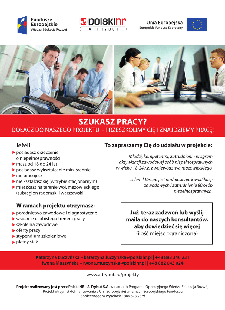 SZUKASZ PRACY? DOŁĄCZ DO NASZEGO PROJEKTU - PRZESZKOLIMY CIĘ I ZNAJDZIEMY PRACĘ! To zapraszamy Cię do udziału w projekcie: Jeżeli: posiadasz orzeczenie o niepełnosprawności masz od 18 do 24 lat posiadasz wykształcenie min. średnie nie pracujesz nie kształcisz się (w trybie stacjonarnym) mieszkasz na terenie woj. mazowieckiego (subregion radomski i warszawski) W ramach projektu otrzymasz: poradnictwo zawodowe i diagnostyczne wsparcie osobistego trenera pracy szkolenia zawodowe oferty pracy stypendium szkoleniowe płatny staż Młodzi, kompetentni, zatrudnieni - program aktywizacji zawodowej osób niepełnosprawnych w wieku 18-24 r.ż. z województwa mazowieckiego, celem którego jest podniesienie kwalifikacji zawodowych i zatrudnienie 80 osób niepełnosprawnych. Już teraz zadzwoń lub wyślij maila do naszych konsultantów, aby dowiedzieć się więcej (ilość miejsc ograniczona) Katarzyna Łuczyńska – [email protected] | +48 883 340 231 Iwona Muszyńska – [email protected] | +48 882 043 024 www.a-trybut.eu/projekty Projekt realizowany jest przez Polski HR - A-Trybut S.A. w ramach Programu Operacyjnego Wiedza Edukacja Rozwój. Projekt otrzymał dofinansowanie z Unii Europejskiej w ramach Europejskiego Funduszu Społecznego w wysokości: 986 573,23 zł