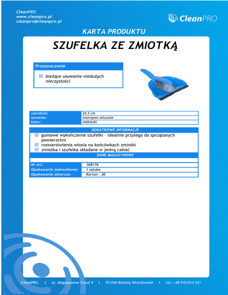 CleanPRO www.cleanpro.pl [email protected] KARTA PRODUKTU SZUFELKA ZE ZMIOTKĄ Przeznaczenie bieżące usuwanie niedużych nieczystości szerokość surowiec: kolor: 24,5 cm tworzywo sztuczne niebieski DODATKOWE INFORMACJE gumowe wykończenie szufelki – idealnie przylega do sprzątanych powierzchni rozwarstwienia włosia na końcówkach zmiotki zmiotka i szufelka składane w jedną całość DANE MAGAZYNOWE Nr art. Opakowanie jednostkowe: Opakowanie zbiorcze: CleanPRO, I 368176 1 sztuka Karton – 30 ul. Magazynowa 4 bud 4 I 55-040 Bielany Wrocławskie I tel: +48 510 013 531 mail: [email protected] www.cleanpro.pl