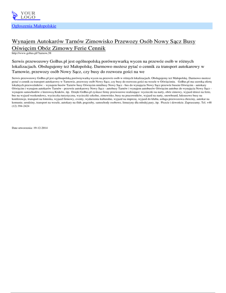 Ogłoszenia Małopolskie Wynajem Autokarów Tarnów Zimowisko Przewozy Osób Nowy Sącz Busy Oświęcim Obóz Zimowy Ferie Cennik http://www.gobus.pl/?tarnow,58 Serwis przewozowy GoBus.pl jest ogólnopolską porównywarką wycen na przewóz osób w różnych lokalizacjach. Obsługujemy też Małopolskę. Darmowo możesz pytać o cennik za transport autokarowy w Tarnowie, przewozy osób Nowy Sącz, czy busy do rozwozu gości na we Serwis przewozowy GoBus.pl jest ogólnopolską porównywarką wycen na przewóz osób w różnych lokalizacjach. Obsługujemy też Małopolskę. Darmowo możesz pytać o cennik za transport autokarowy w Tarnowie, przewozy osób Nowy Sącz, czy busy do rozwozu gości na wesele w Oświęcimiu. GoBus.pl ma szeroką ofertę lokalnych przewoźników: - wynajem busów Tarnów busy Oświęcim minibusy Nowy Sącz - bus do wynajęcia Nowy Sącz przewóz busem Oświęcim - autokary Oświęcim i wynajem autokarów Tarnów - przewóz autokarowy Nowy Sącz - autobusy Tarnów i wynajem autobusów Oświęcim autobus do wynajęcia Nowy Sącz wynajem samochodów z kierowcą Kraków, itp. Dzięki GoBus.pl zyskasz firmy przewozowe realizujące: wycieczki na narty, obóz zimowy, wyjazd dzieci na ferie, bus na wyjazd weekendowy, wycieczka turystyczna, wycieczki szkolne, zimowisko, busy na pracowników, wyjazd na narty, snowboard, luksusowe busy na konferencje, transport na lotniska, wyjazd firmowy, eventy, wydarzenia kulturalne, wyjazd na imprezę, wyjazd do klubu, usługa przewozowa chrzciny, autokar na komunie, urodziny, transport na wesele, autokary na ślub, pogrzeby, samochody osobowe, limuzyny dla młodej pary, itp. Piszcie i dzwońcie. Zapraszamy. Tel. +48 (12) 394-2424 Date utworzenia: 19-12-2014