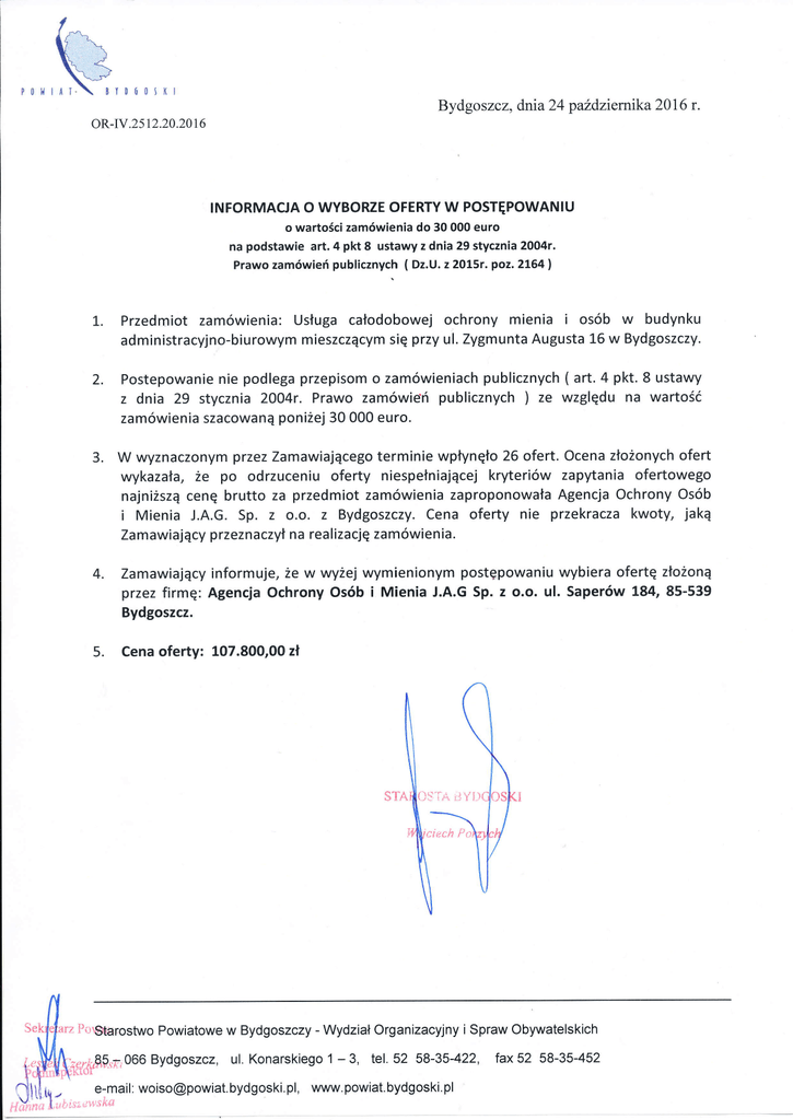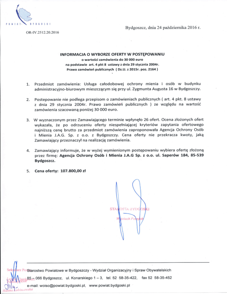 p0lłl l!ó0tl(l Bydgoszcz, dnia 24 paŹdziernika 2016 r. oR-rv.2512.20.2016 INFoRMACJA o WYBoRZE oFERTY W PosTĘPoWANlU o wartościzamówienia do 30 000 euro na podstawie art. 4 pkt 8 ustawy z dnia 29 stycznia 2OO4r. Prawo zamówień publicznych ( Dz.U. z2ot5r.poz.2L64| L. Przedmiot zamóWienia: Usługa całodobowej ochrony mienia i osób W budynku administracyjno-biurowym mieszczącym się przy ul. Zygmunta Augusta L6 w Bydgoszczv' Ż. Postepowanie nie podlega przepisom o zamóWieniach publicznych ( art. 4 pkt. 8 ustawy z dnia 29 stycznia Żoo4r. Prawo zamówień publicznych )ze względu na wartość zamóWienia szacowaną poniżej 30 000 euro' 3. W wyznaczonym przezZamawiającego terminie wpłynęło 26 ofert. ocena złożonychofert wykazała, że po odrzuceniu oferty niespełniającej kryteriów zapytania ofertowego najniższą cenę brutto za przedmiot zamówienia zaproponowała Agencja ochrony osób i Mienia j.A'G. Sp. z o.o' z Bydgoszczy. Cena oferty nie przekracza kwoty, jaką Za m awiaj ą cv przeznaczył n a rea izację za mówi e n ia. l 4. 5. Zamawiający informuje, że w wyżej wymienionym postępowaniu wybiera ofertę z|oŻoną przez firmę: Agencja ochrony osób i Mienia J.A.G Sp. z o.o. ul. Saperów L84,85-539 Bydgoszcz. Cena oferty: 107.800,oo zł iril1$ftgpg5fupo Powiatowe w Bydgoszczy - ,lęffi,';r966 Bydgoszcz, ul. Konarskiego Wydział organizacyjny i Spraw obywatelskich '1 _ 3, tel.52 58-35-422' tax52 e-mail: [email protected], www.powiat.bydgoski.pl .'- 58-35-452